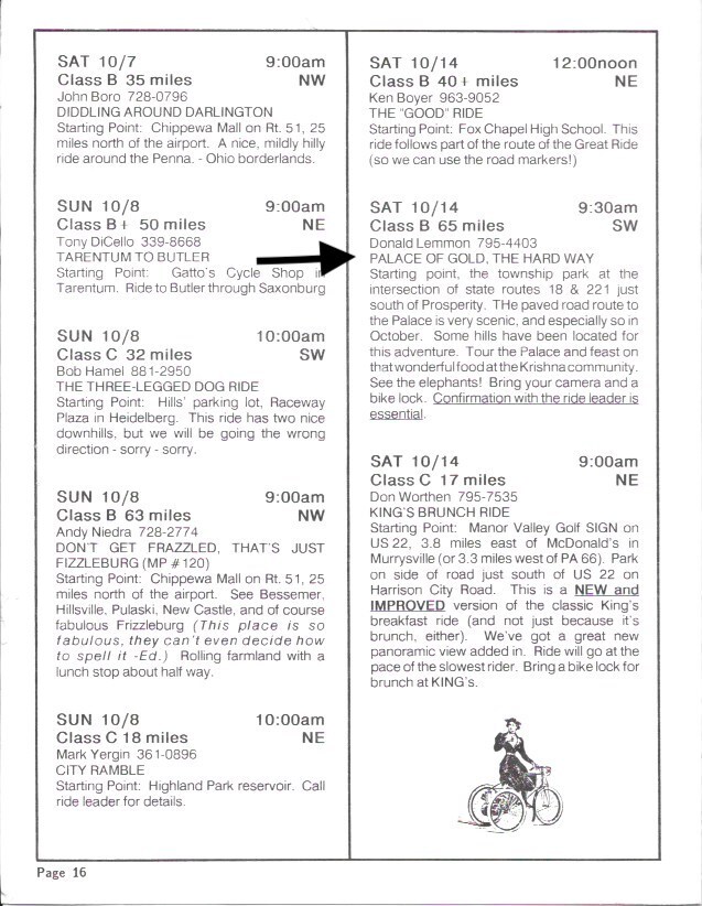From the Western Pennsylvania Wheelmen newsletter, called the "Cycling Circular," is a listing for Donald Lemmon's ride to the Palace of Gold. The date is October 1989.