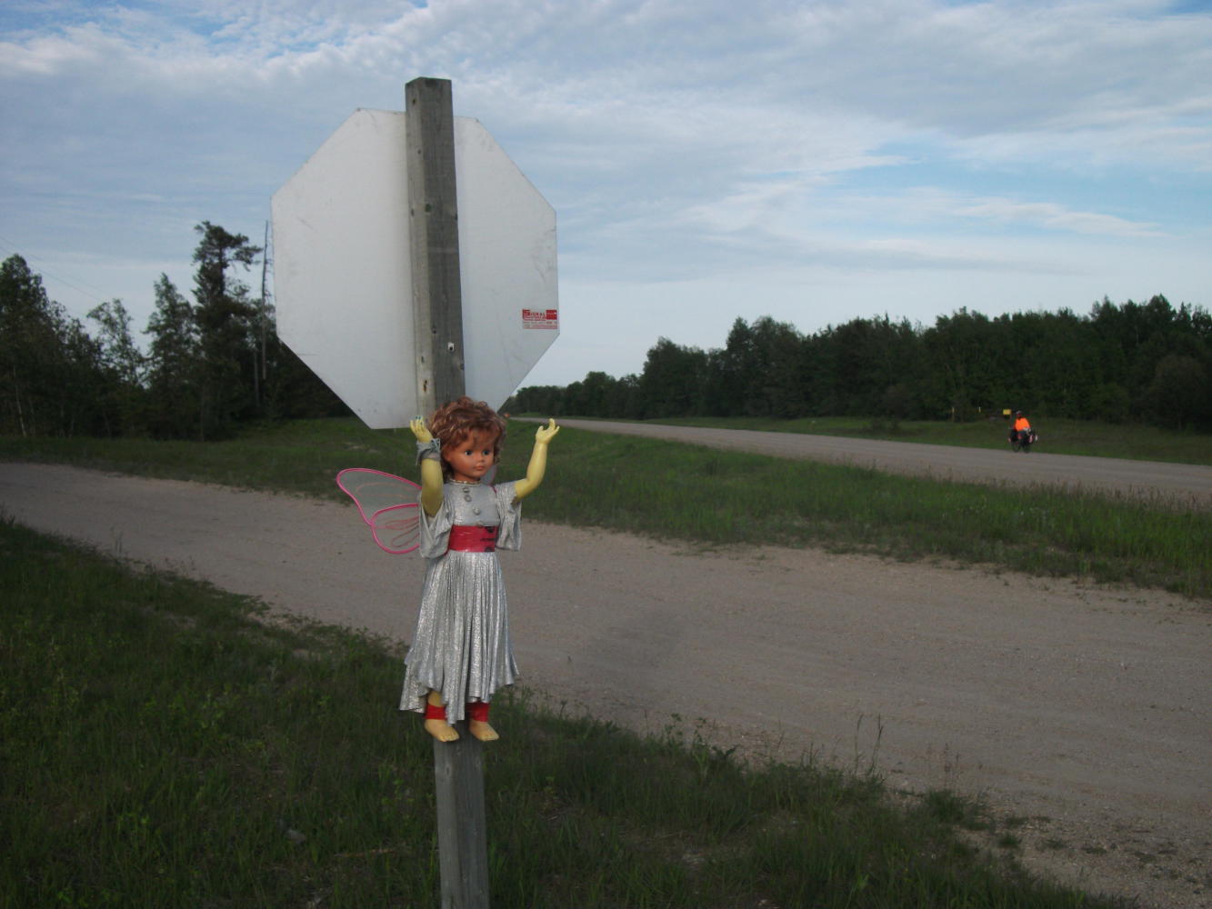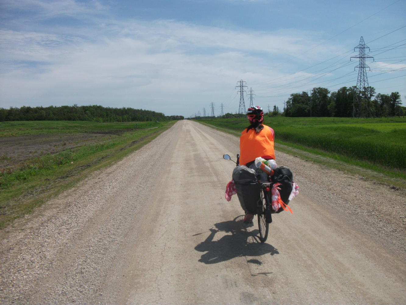 But now we were heading back towards forested areas as we opted to leave the Trans Canada Highway for the first time in weeks, due to reports that it lacked a shoulder in places between Winnipeg and the Ontario border. Instead we tried our luck on a few gravel roads before ending up on the number 15 highway. This was at first busy, with just a gravel shoulder, but the traffic soon thinned out to almost nothing and it seemed we had made a good choice. Then the only problem we had was with the flies that orbited around us as we rode. There were bull flies, horse flies, fruit flies, everything. Absolutely annoying and of course they provided more material for Vivian to moan about. She was also terribly afraid of ticks. Over the previous days we had seen a few without being bitten, and she was so afraid of them that she refused to remove any layers of clothing and cycled along in the midday heat with leggings tucked into her socks and a long-sleeved top. This at least gave her something else to moan about.