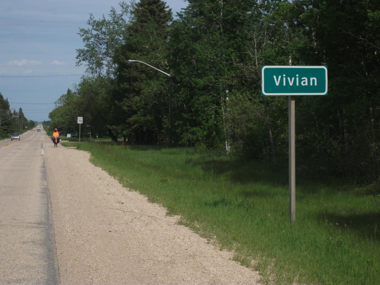 In the morning I walked to Walmart with Ryan to buy some final supplies and then it was time for Vivian and I to thank him, both for his hospitality and for not killing us in the night, and then hit the road once again. It was another sunny day and we were through the prairies. I considered us very fortunate with our crossing. We had been blessed with mostly good weather and the wind had been generally favourable, with just the occasional crosswind and a few hours of headwind/rainy weather. It really was as good as we could have wished for, I know some people with less good fortune have given up cross-Canada rides because of the wind being relentlessly against them all the way across. Our good fortune didn’t, however, stop Vivian complaining to everyone we met about it. According to her accounts it seemed the wind actually had been relentlessly against us all the way across, and what was more it had apparently barely stopped raining.