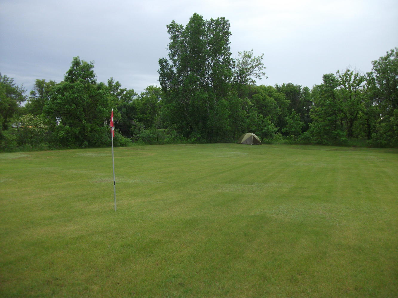 We reached the peaceful little town of Elma and knocked on a door to ask for water. A kindly obliging elderly couple supplied us with that, and then suggested to us that we might like to camp at a nice spot in town down by the river. We followed their directions and found some benches and a flat patch of grass behind some trees next to it. Best of all was the flag in the middle of the very flat grass. This was a golf course! My long-held ambition to camp on a golf course was finally going to be realised. I was very excited. Except that it looked like actually this wasn’t really a public golf course, but the end of a very large garden, which the wealthy occupants of the manor at the top of which had turned into something of a golf course. That was good enough. I didn’t mind, and I’m sure they wouldn’t either. But then Vivian took things too far, and walked up to the house to ask for the wifi password.