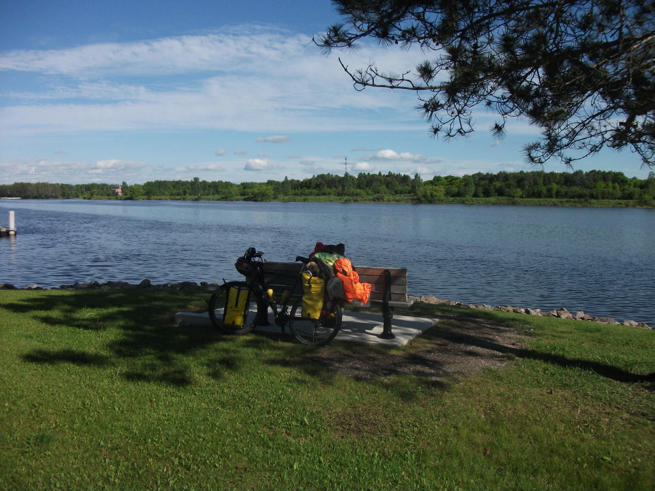 It was the right decision. The empty back roads were simply wonderful, just amazing. With no traffic to worry about I put on some music and raced fast and loved it. With farmed fields and sporadic forest it reminded me of cycling in Europe, and I was happy and excited that I would be back there soon. I zigzagged my way along on a mix of paved and good gravel roads until I reached Fort Frances, with 80 kilometres ridden by 2:30 pm.