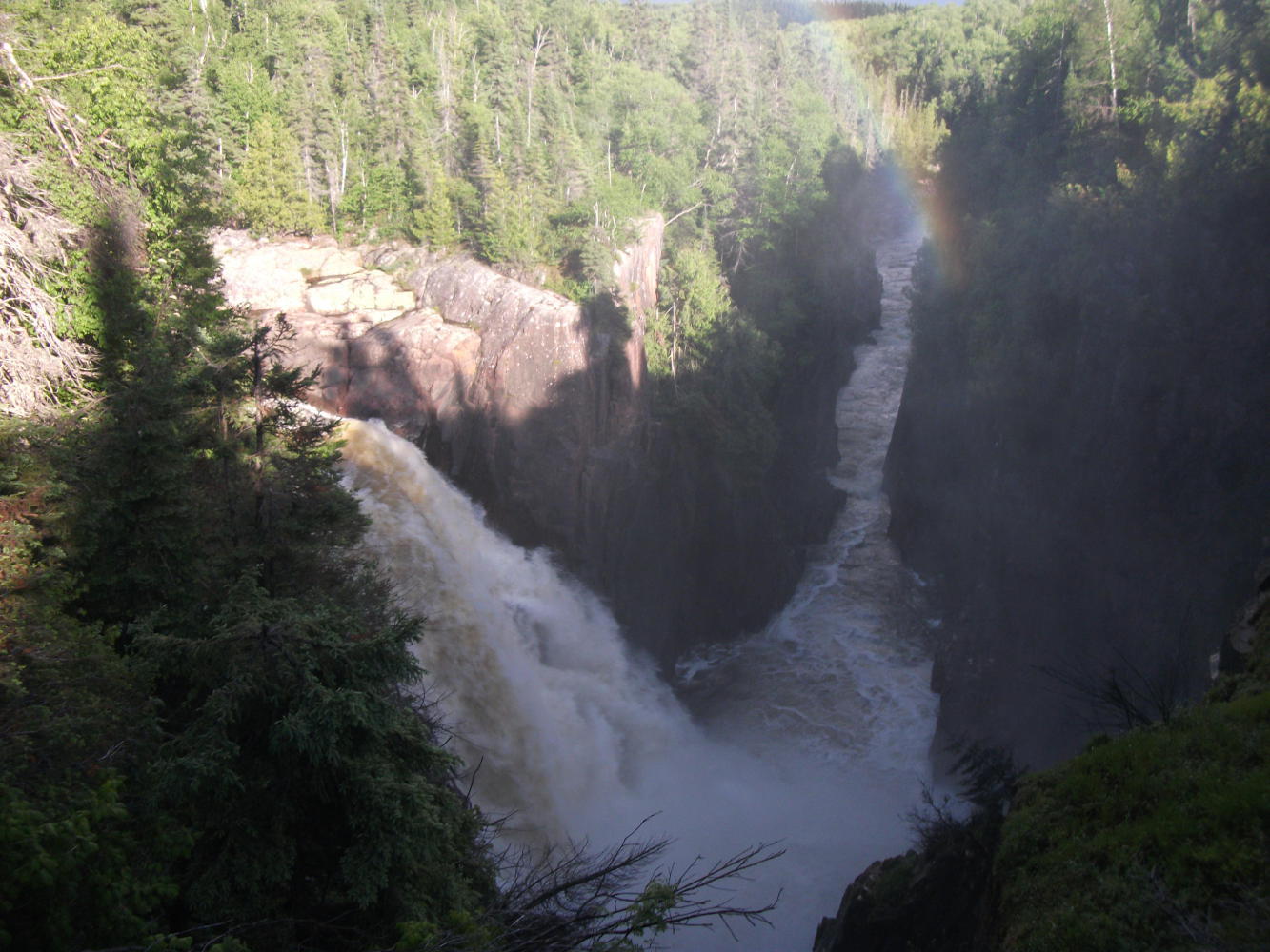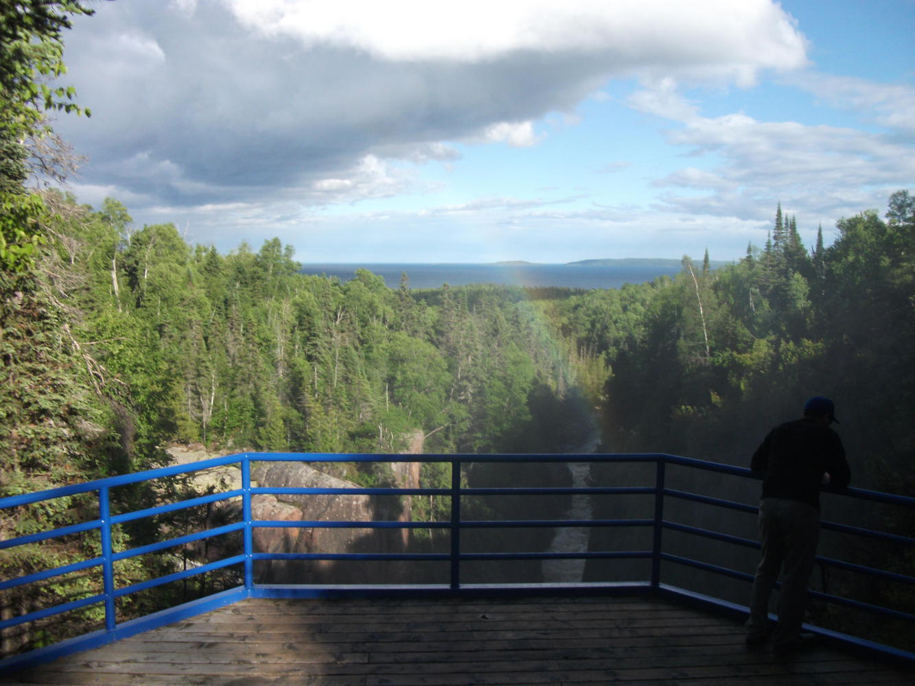 After the game, and with the weather much better, I cycled on to Terrace Bay, stopping at Aguasana Falls on the way. These were definitely not top twenty material, but my visit to them was enhanced by meeting an extraordinarily strange and friendly man named Vern, who was very impressed by my trip.