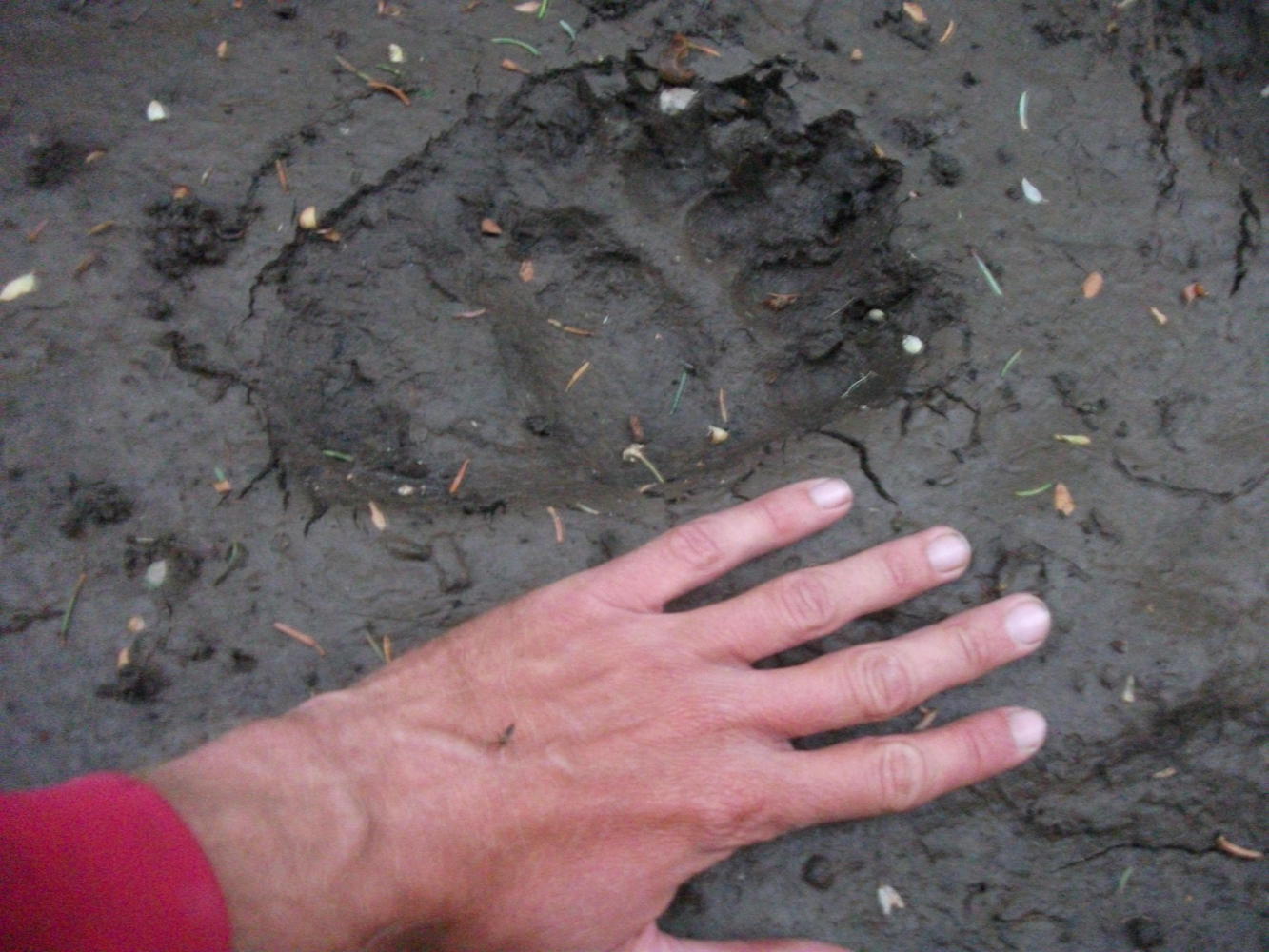 It was late. I went on, looking for somewhere to camp. There was a lot of forest of course, but it was too thick to get into. I took a turn off the road that led to a clearing. It was good for the tent, but there was a chance that I could be disturbed by a car pulling in here in the night, so I followed a track into the forest to look for something better. The muddy track was lined with thick vegetation on both sides, and there was nowhere to get in, so I went on and on, deeper and deeper into the woods. I’d noticed some animal tracks in the muddy trails - moose perhaps, something like a coyote - but further on I came across some much larger prints. Undoubtedly they belonged to a bear. A pretty big bear at that. They were going in the same direction that I was headed, and they looked freshly made. This is the kind of thing that makes me a little nervous. I decided that taking my chances on a car coming into the clearing wasn’t such a bad idea after all, and I quickly retreated as fast as I could to camp there instead.