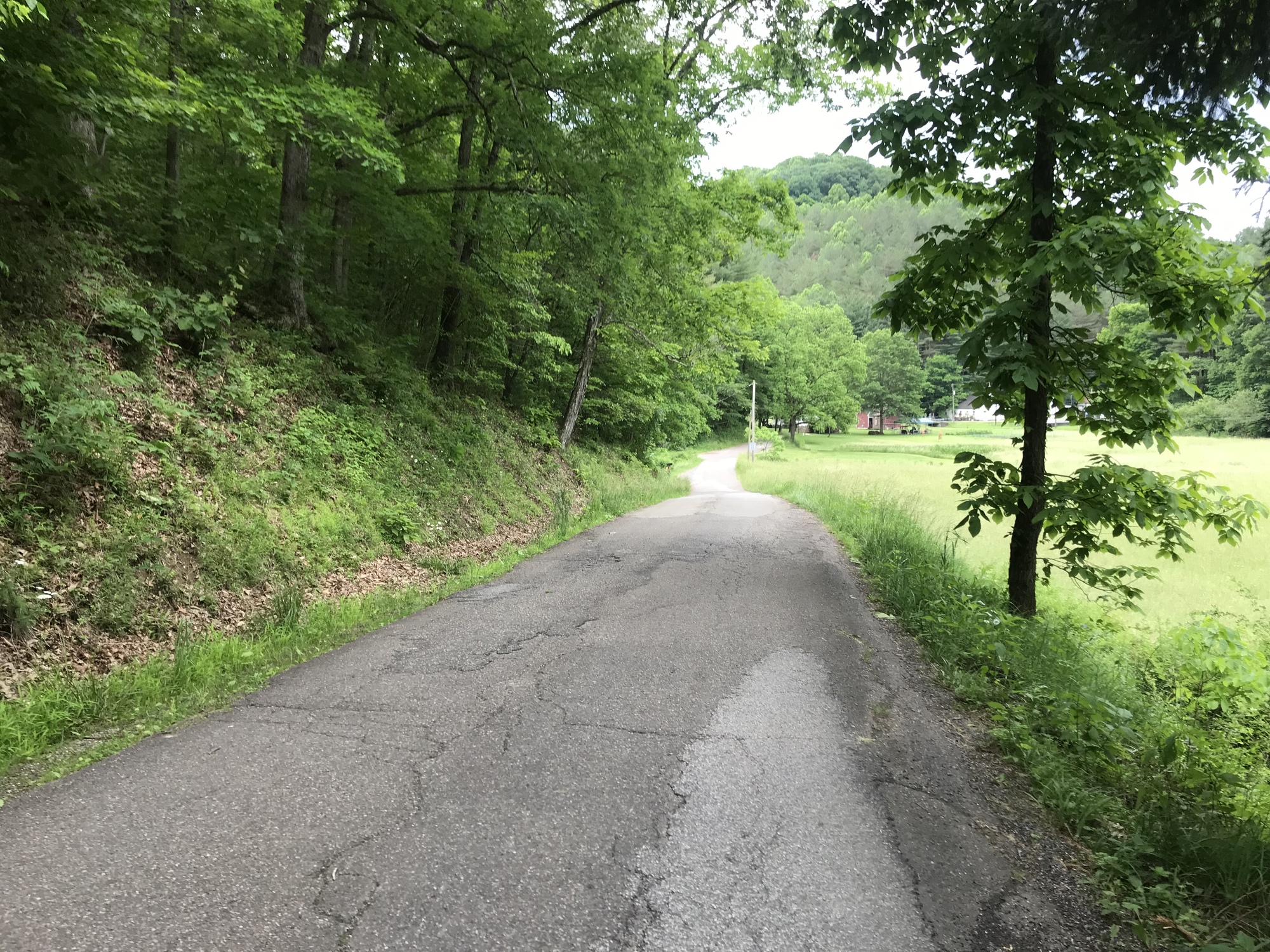 Difficult undulations continued into Littleton. There are a number of YouTube videos about decimated Appalachian towns. I’m not sure if there is one for Littleton, but it is fodder for such undertakings. Things are pretty rough there. I won’t post very many “ruin-porn” photos but will mention the dilapidated buildings, very rough looking homes, the junk lying about, the threatening signs, and viscous dogs that were thankfully tied up. One person had a sign in the yard that said, “Zombies Ahead.” I didn’t linger in Littleton. However, I did ask a young woman and man what the purpose of the building pictured below had been. The woman told me it had been a bank. Both of these people appeared to be high on something besides life. The woman was coherent but the young man had a vacant look in his eyes and did not speak at all. It was a somewhat disturbing interpersonal encounter. Perhaps the reason for the aforementioned Zombies sign I had seen before reaching this point.