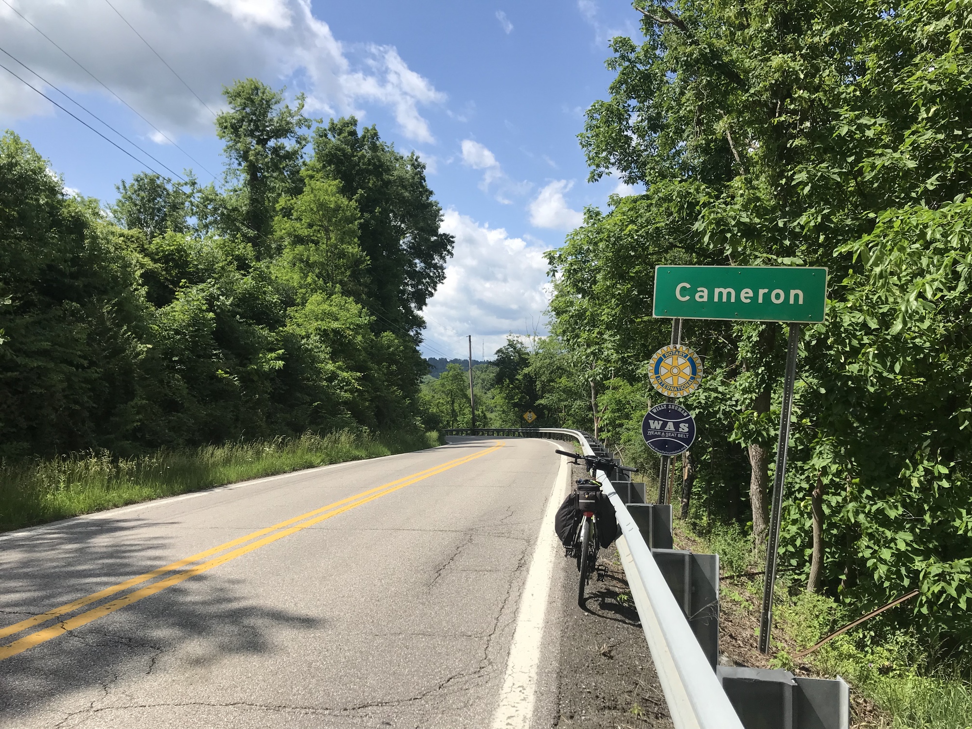 After a long climb that did not have an equivalent drop, PHR met SR-88. I turned left in order to continue Southward. SR-88 met US-250, where I continued heading South. Cameron was my first destination. It lay 13 miles further, according to the sign, which turned out to be correct distance- wise. The sign said absolutely nothing about how many hills were involved in those miles.