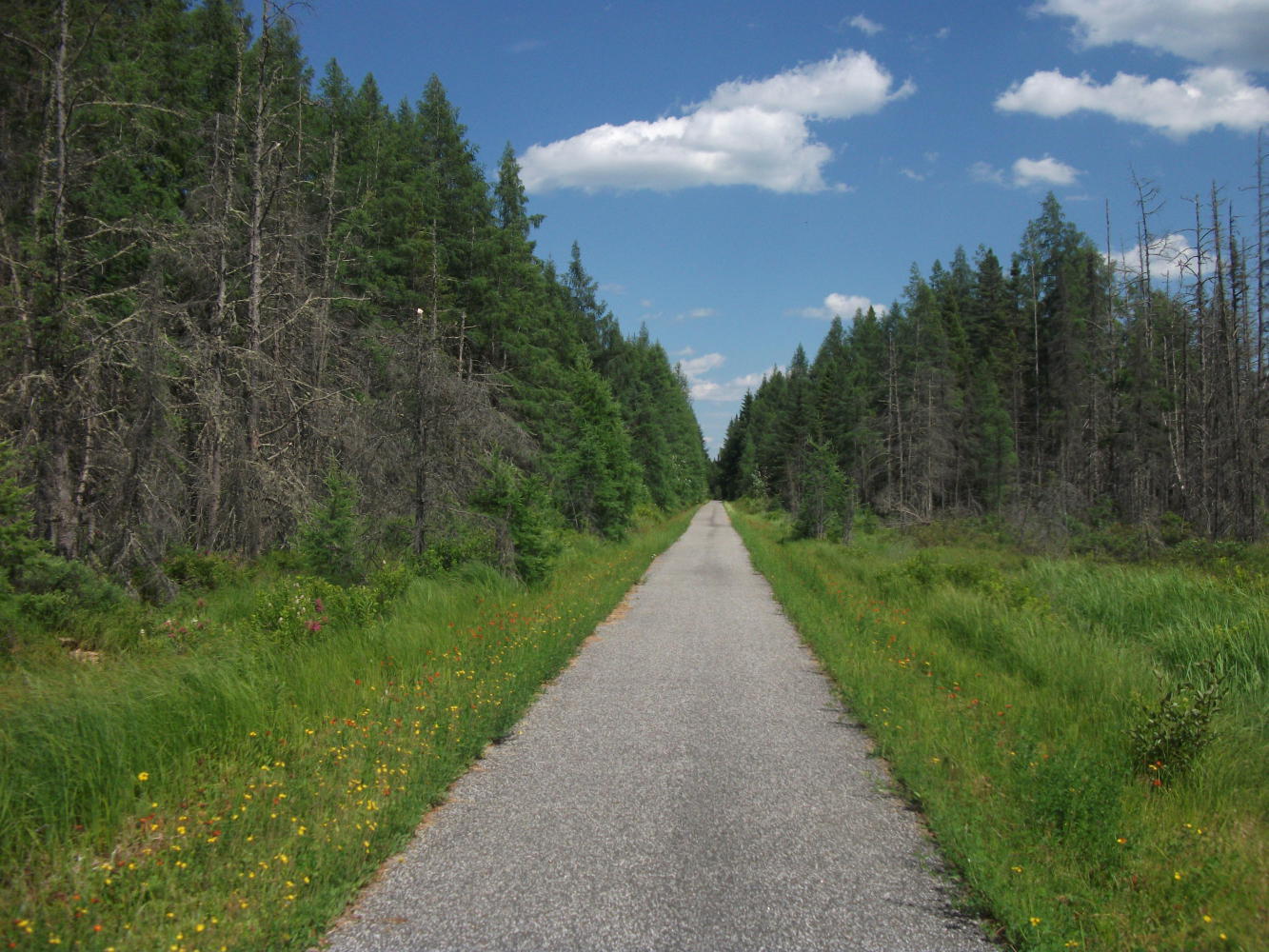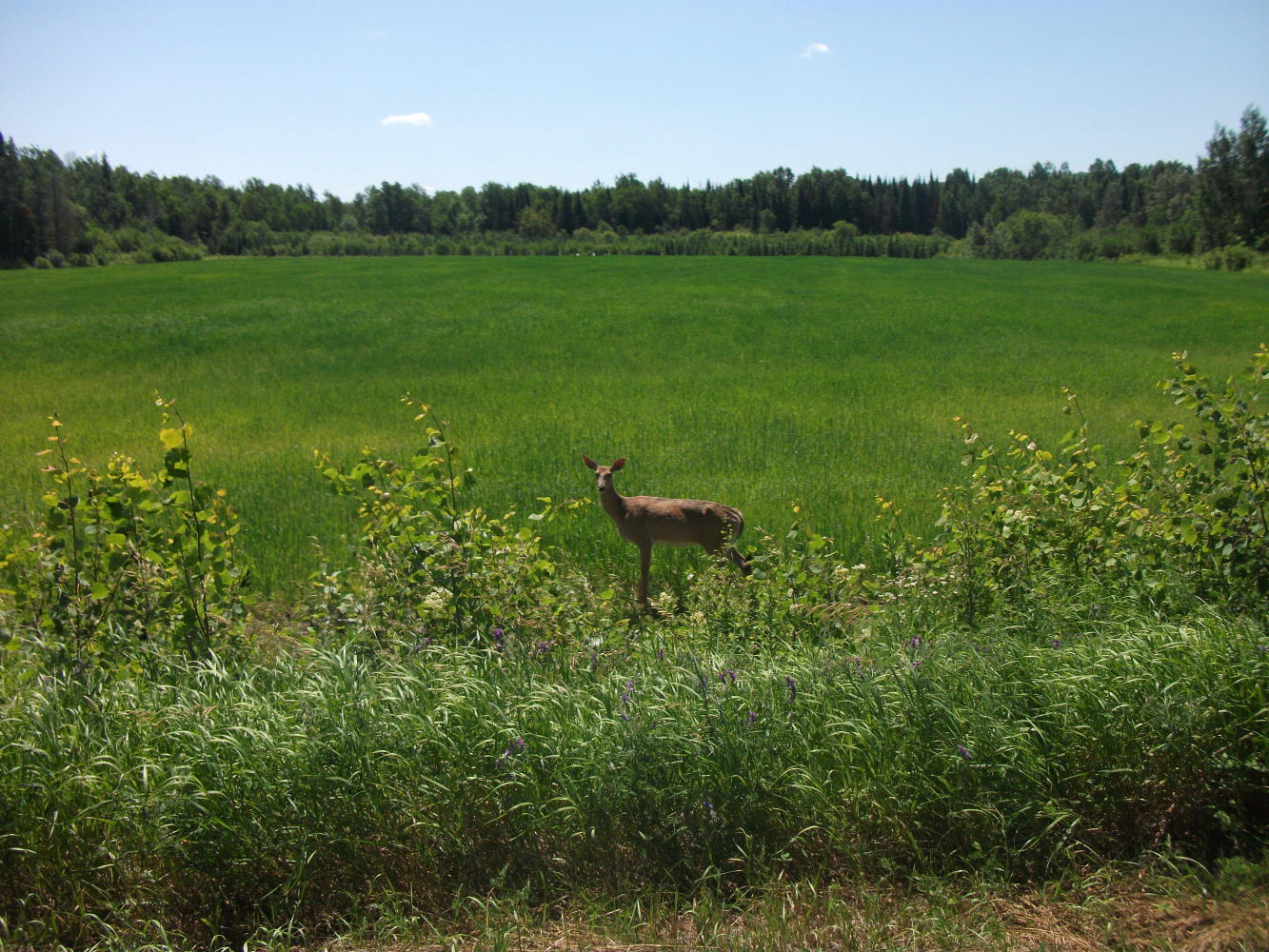 Feeling much better, I stocked up at the local cheap supermarket and then headed off onto the trail. This old converted railway line led all the way from here to Montreal, well over 200 kilometres away. It was a fantastic thought! Sure, it was a hot day, and the flies were as bad here as anywhere, but to be completely free from the hassle of traffic felt so good. It was more interesting too, carrying me through a mixture of farmed fields, grassy meadows and untouched forests and past a variety of wildlife including several deer.