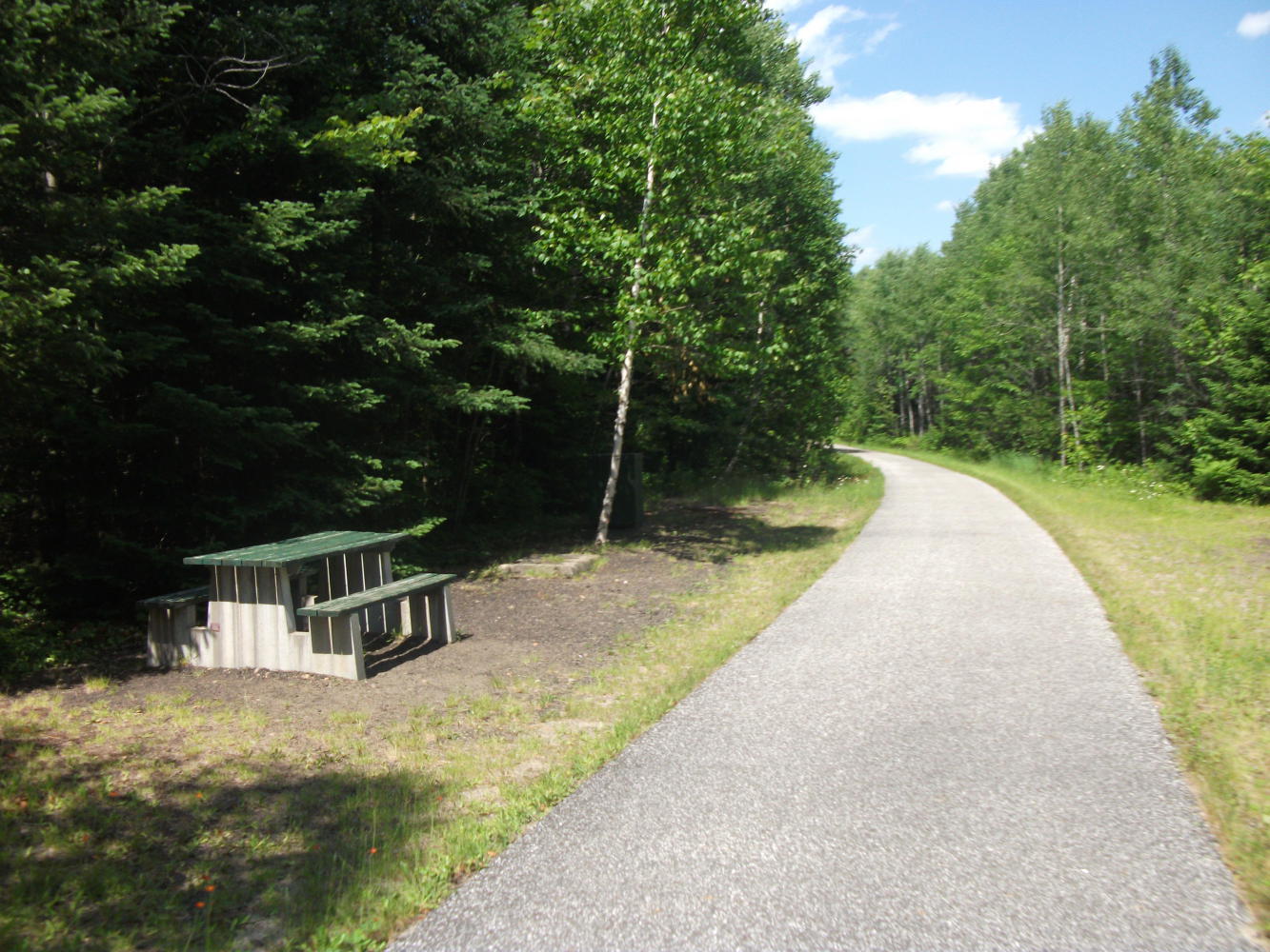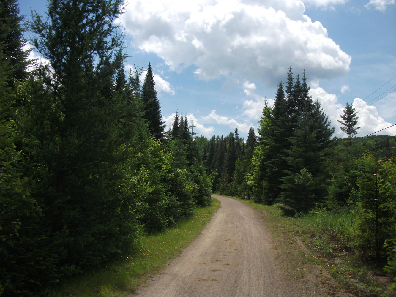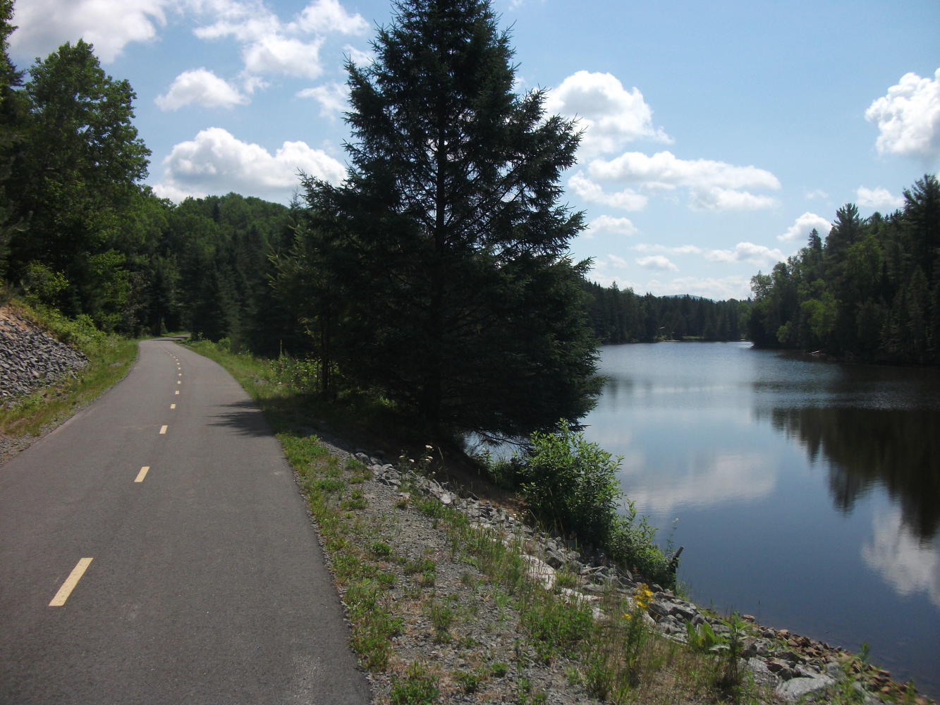 The next day the trail continued through Mont Tremblant, and became much busier. Lots of people were out making use of this fantastic resource, most of them on bicycles. Just on the far side of the town the trail turned to gravel and the user levels dropped again. But I stopped to take a break in a park next to a parking lot just before the change. I watched as several people arrived by car and unloaded their bikes to cycle off on the paved section of trail. In fact the parking lot was completely filled with cars that had bike racks on the back or roof. It seemed that almost all of the many cyclists on this section had arrived by car, and I thought about the irony that the use of this great rail-trail therefore actually slightly increased the number of cars on the roads.