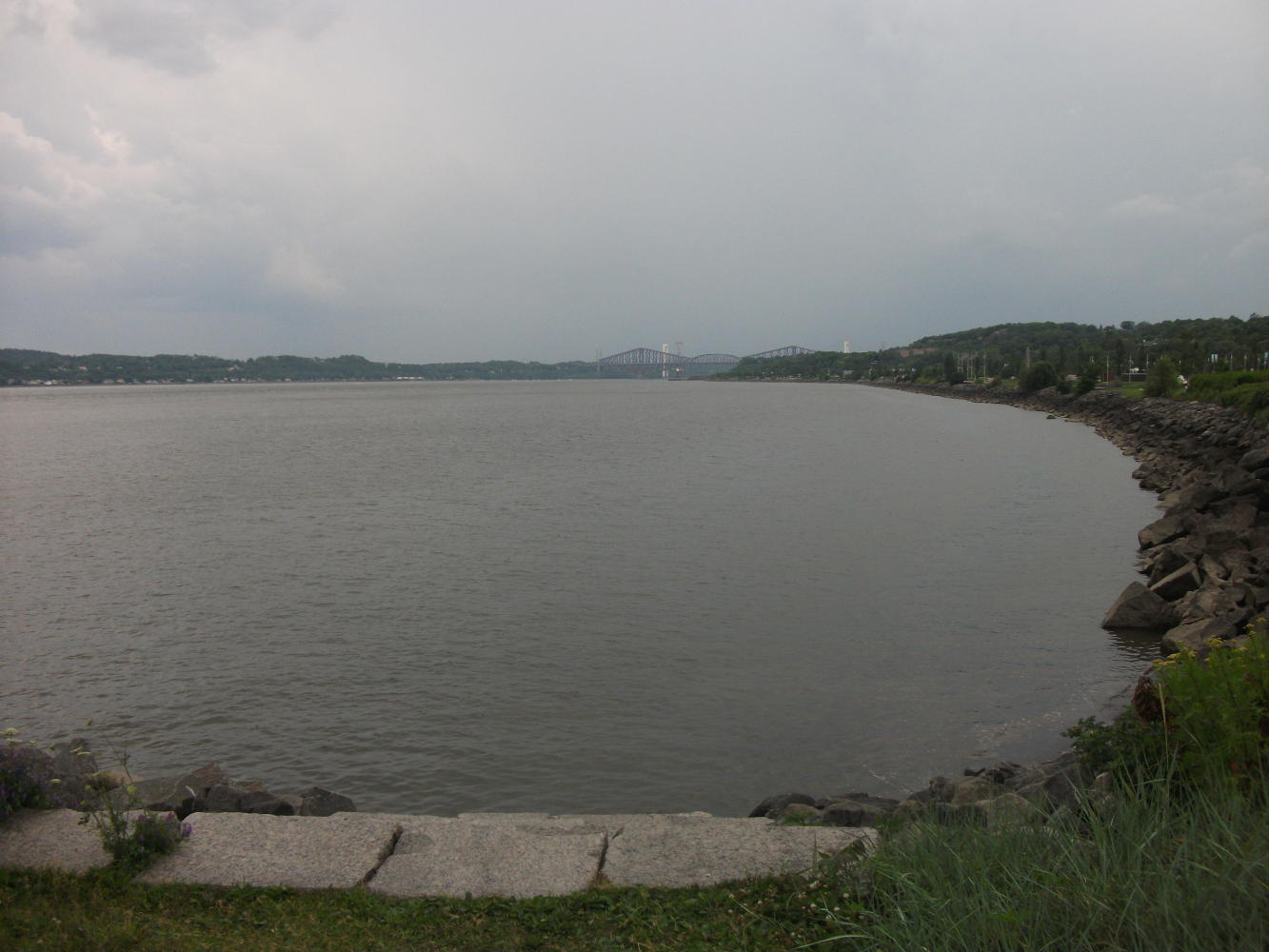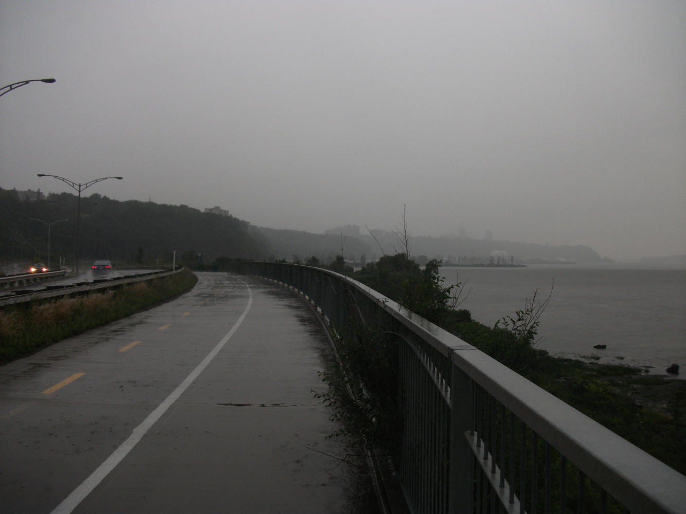 Then the rain came down in torrents as I cycled on towards the city centre. I was getting soaked and there was indeed thunder and lightning, but I kept at it anyway, snatching glimpses of the fine old buildings that make Quebec the most European of all North American cities. The last time I had visited I’d had quite a magnificent guided tour from my host, Meggie, and, having seen it all before I didn’t feel the need to explore the city again right now, and instead hid under a bridge.