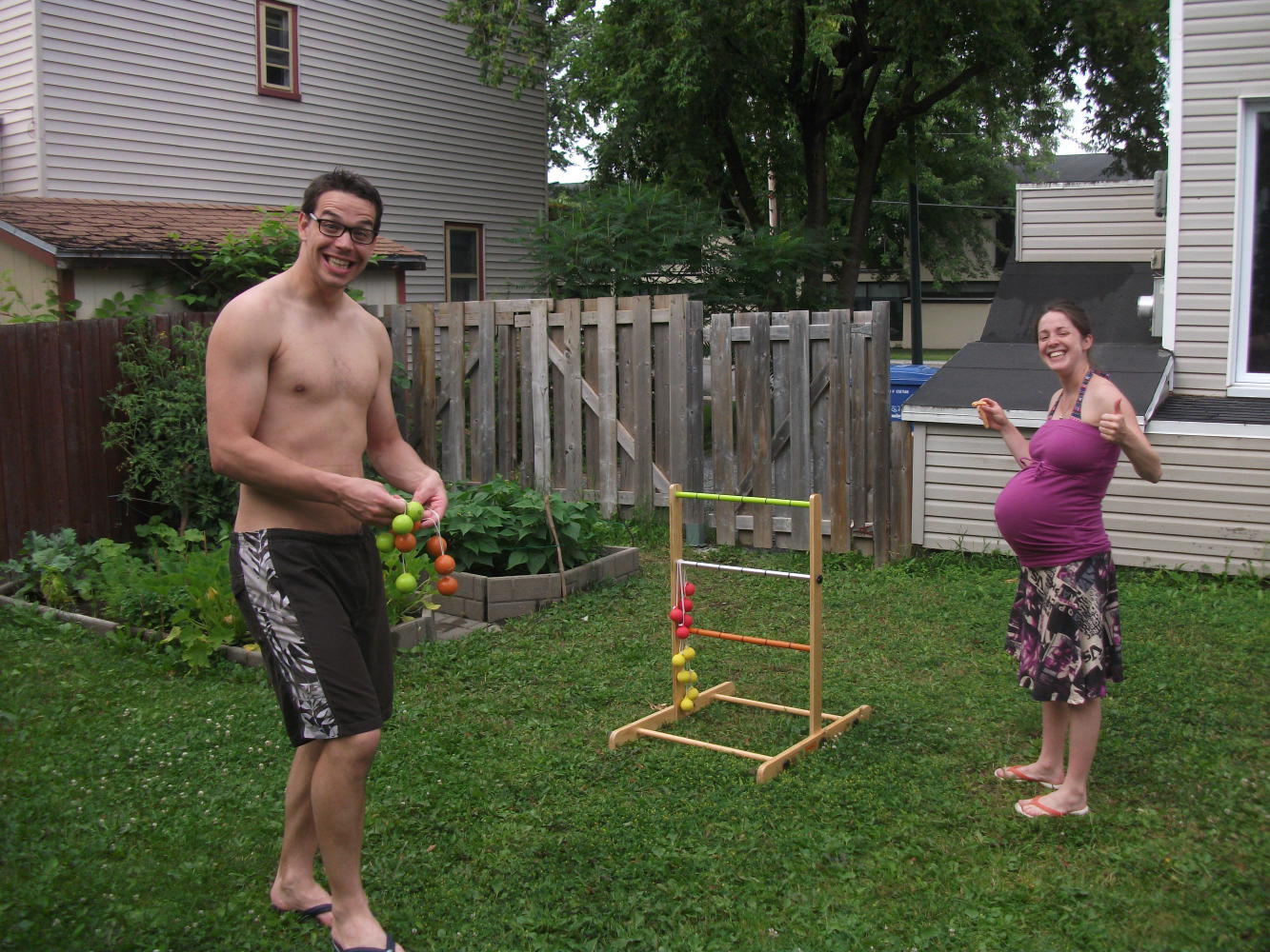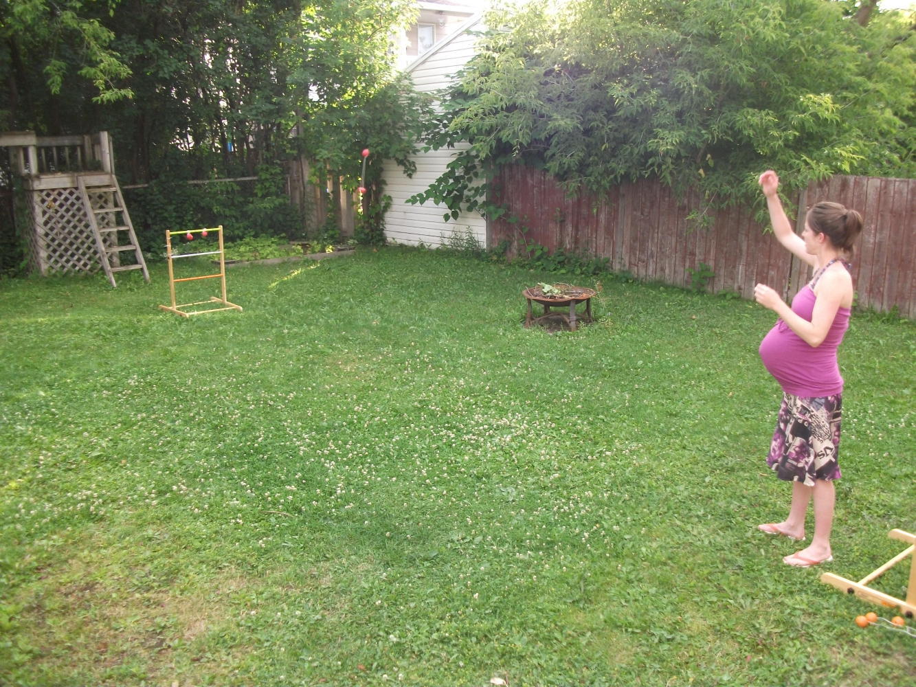 It was a fantastic evening, including a tofu-burger barbecue, 9% Quebec beer (though not for Marie-Claude) and a lot of fun. With plenty of space in the garden we soon pulled out some summer games. It started with boules. Meggie was busy putting Isaak to sleep, and so it was just the three of us taking part. I’d imagined that Simon would be my major competition, but in a surprise result it was Marie-Claude who triumphed. Quite convincingly actually. Next up was another throwing game, this one involving trying to hurl a string with two balls on either end so that it would land successfully on a rack at the other end of the garden. Once again it was Marie-Claude who came out the victor. By now I was getting a little sick of losing to a heavily-pregnant woman, and for the final game I teamed up with her to take on Simon and Meggie. Continuing the theme, this was yet another throwing game, with the object this time to get metal rings into a box. With the reigning champ on my side I was confident of finally securing a victory.