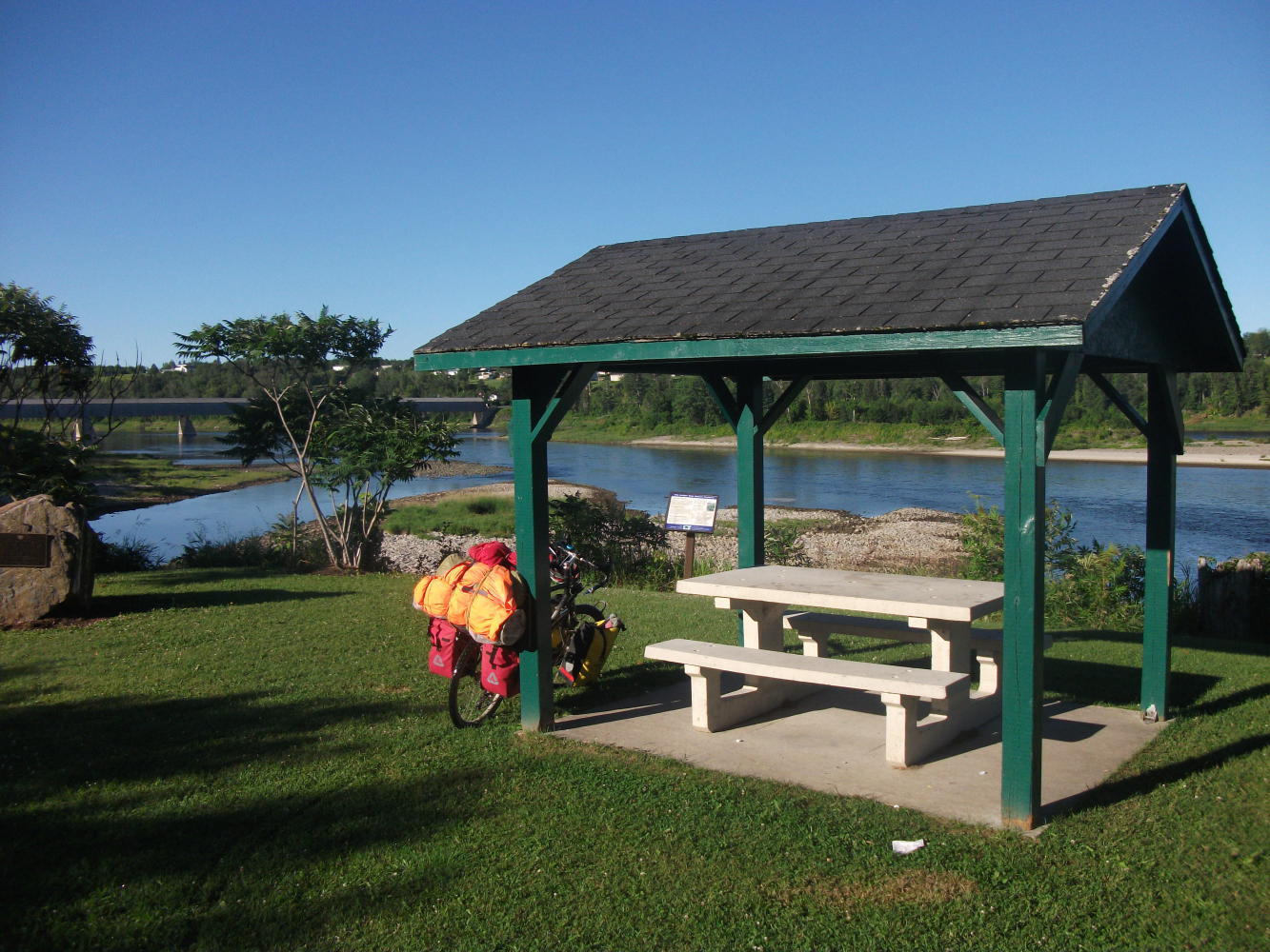 It was actually so nice to be cycling at this time and, satisfied that I had put in enough kilometres, I began to just enjoy myself, and make the most of the last moments of the day. Then I watched as a full moon rose over the river, a big bright moon gleaming orange and red, reflected in the water. It was a stunning way to end a day. A little beyond Fredericton, still on a bike path but now going through woodland, I found a place to camp. I looked at my cycle computer. Another 150 kilometre day. I was happy. I was back on target.