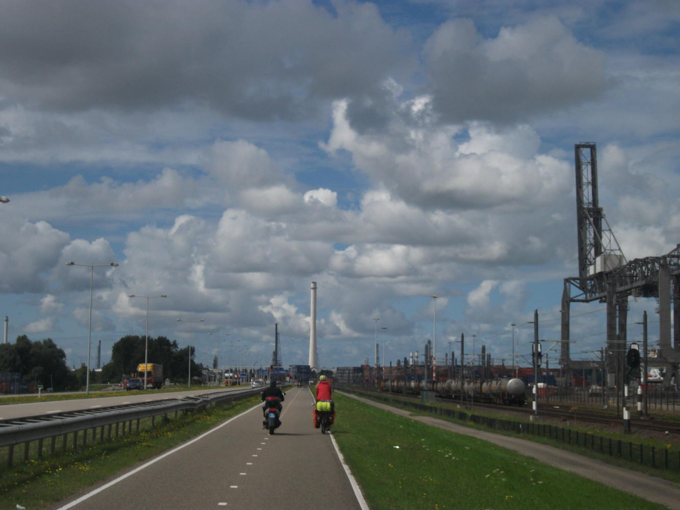 We spent most of the morning in bed at our AirBnb host, before eventually summoning the energy to begin our cycle to Denmark. Heading for the centre of Rotterdam through an industrial area on the fantastic Dutch cycle ways I was extremely disheartened by the number of mopeds that whizzed past us at great speed. It was a great shame. I had so looked forward to returning to Holland because of the amazing network of segregated bicycle paths that would keep us away from fast moving traffic, and now it seemed that fast moving traffic was nowadays not only allowed on the bicycle paths, but almost outnumbering the bicycles, and I felt I had to keep my wits about me almost as much as I did on the roads. It seemed a bit daft to me that the Dutch have invested so much in this cycling infrastructure to then also permit mopeds to use it and ruin the whole enjoyment of cycling.