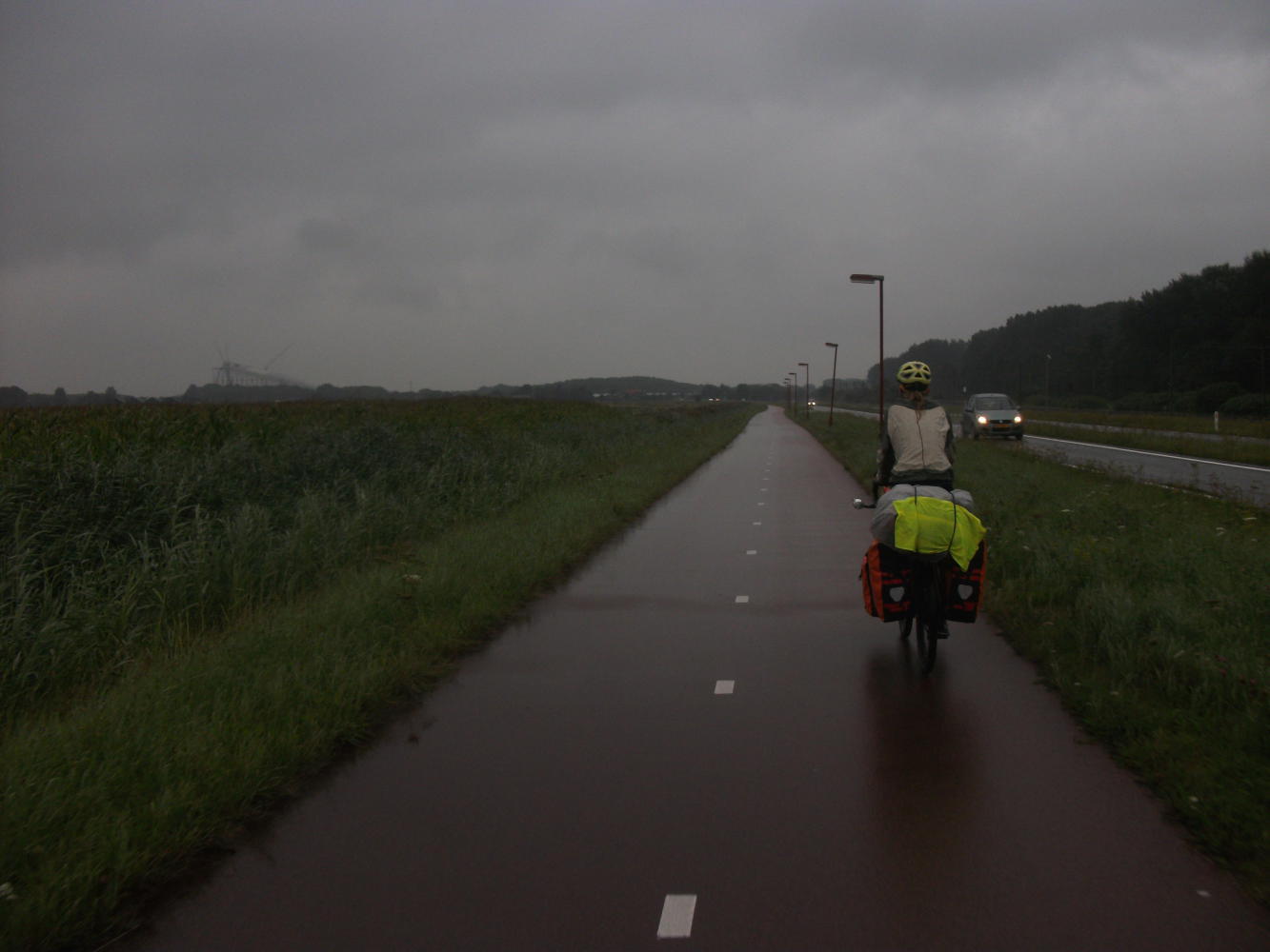 Fortunately as we got into the city the number of bicycles grew to vastly outnumber the mopeds. We didn't see too much of Rotterdam, passing through it and only stopping to buy gas for our stove and take a short break next to a canal. Here another touring cyclist stopped to ask us for directions. He was a very young man who told us he'd been to a juggling convention in Amsterdam and was now cycling his way home to Bordeaux. He had no map or gps, only a compass, so I told him to head south and he should be alright.