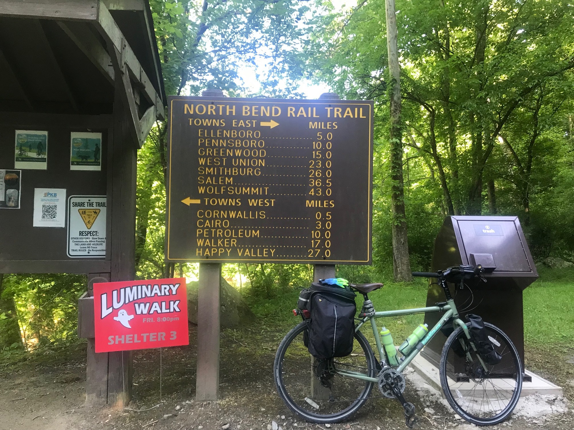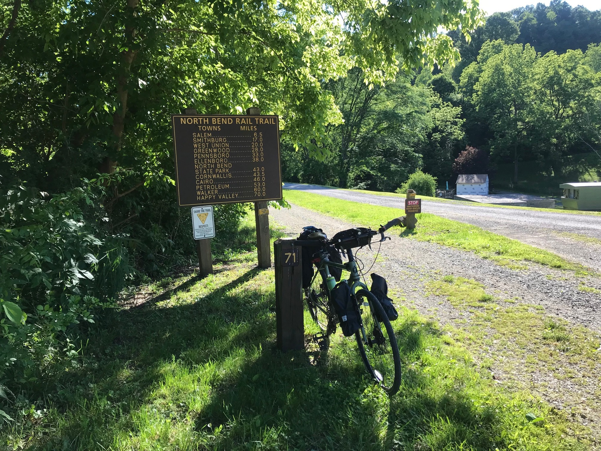 The North Bend Rail Trail (NBT) is 71 miles long and is operated by the West Virginia State Parks system. It has 36 bridges and 10 tunnels and is part of the American Discovery Trail, that crosses the USA. It is also part of a trail network called the P2P, i.e., Pittsburgh to Parkersburg (or vice versa). While the P2P still has some significant gaps, the ultimate goal is to connect the two cities via trails. Most of it is done but in order to connect at this time, one must ride a few roads.