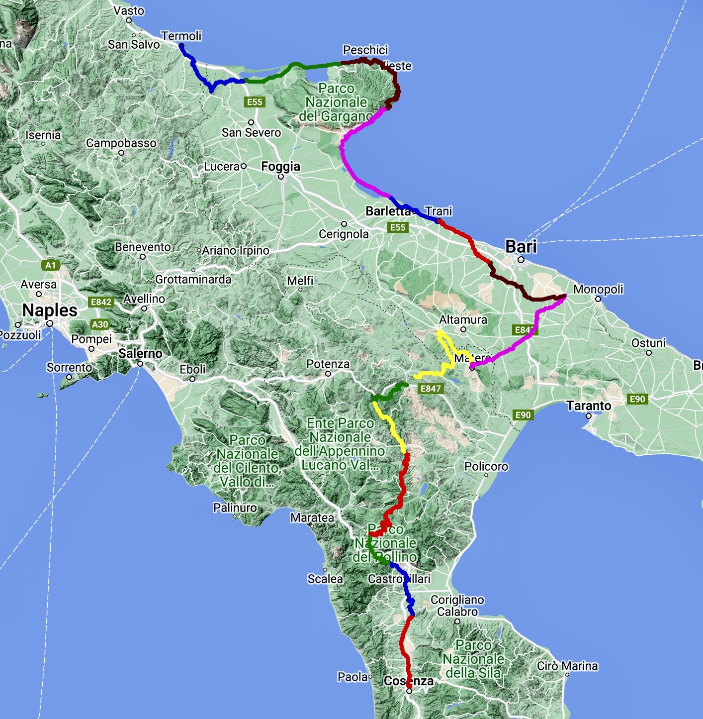 - After taking the train from Scilla to Cosenza we’ll bike across Basilicata and Puglia, ending on the Adriatic coast in Termoli. We have a detailed plan with proposed daily stages, but it’s really dreamware at this point. Nothing is booked, and there’s plenty of slop in the schedule for us to rethink the plan along the way.