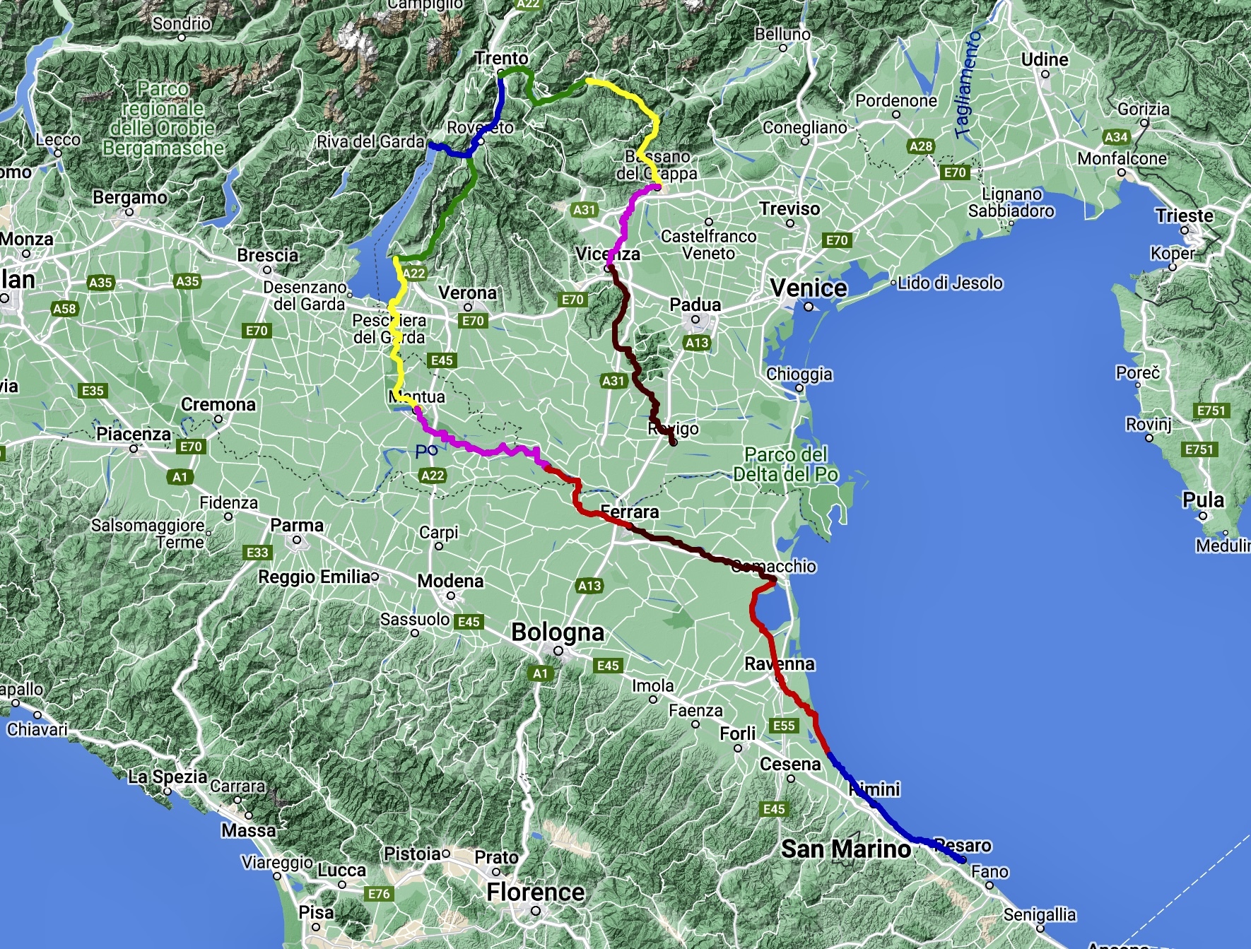 - From Termoli we plan to take the train up the coast to Pesaro, a town we fell in love with two years ago and are excited to see again. From there we’ll carve a horseshoe out of northeast Italy, turning back south at Trento and ending in Rovigo where we’ll catch a train to Bologna. With any luck, our suitcases will be there when we arrive this time.