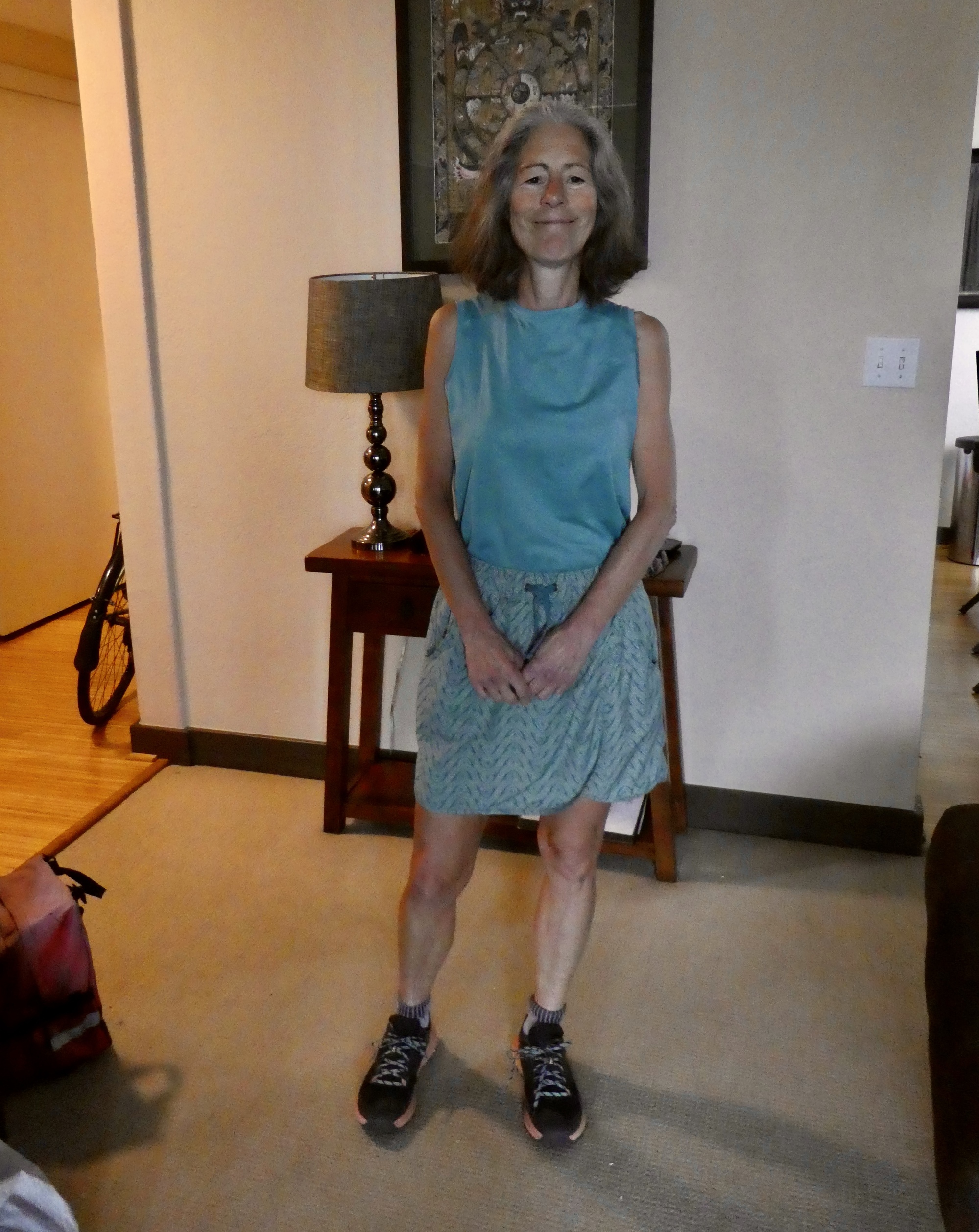 When we’re back home she puts on a fashion show, first showing me how well the new shirt goes with the two skirts she’ll travel with and then the new bike shirt she bought a few weeks go.