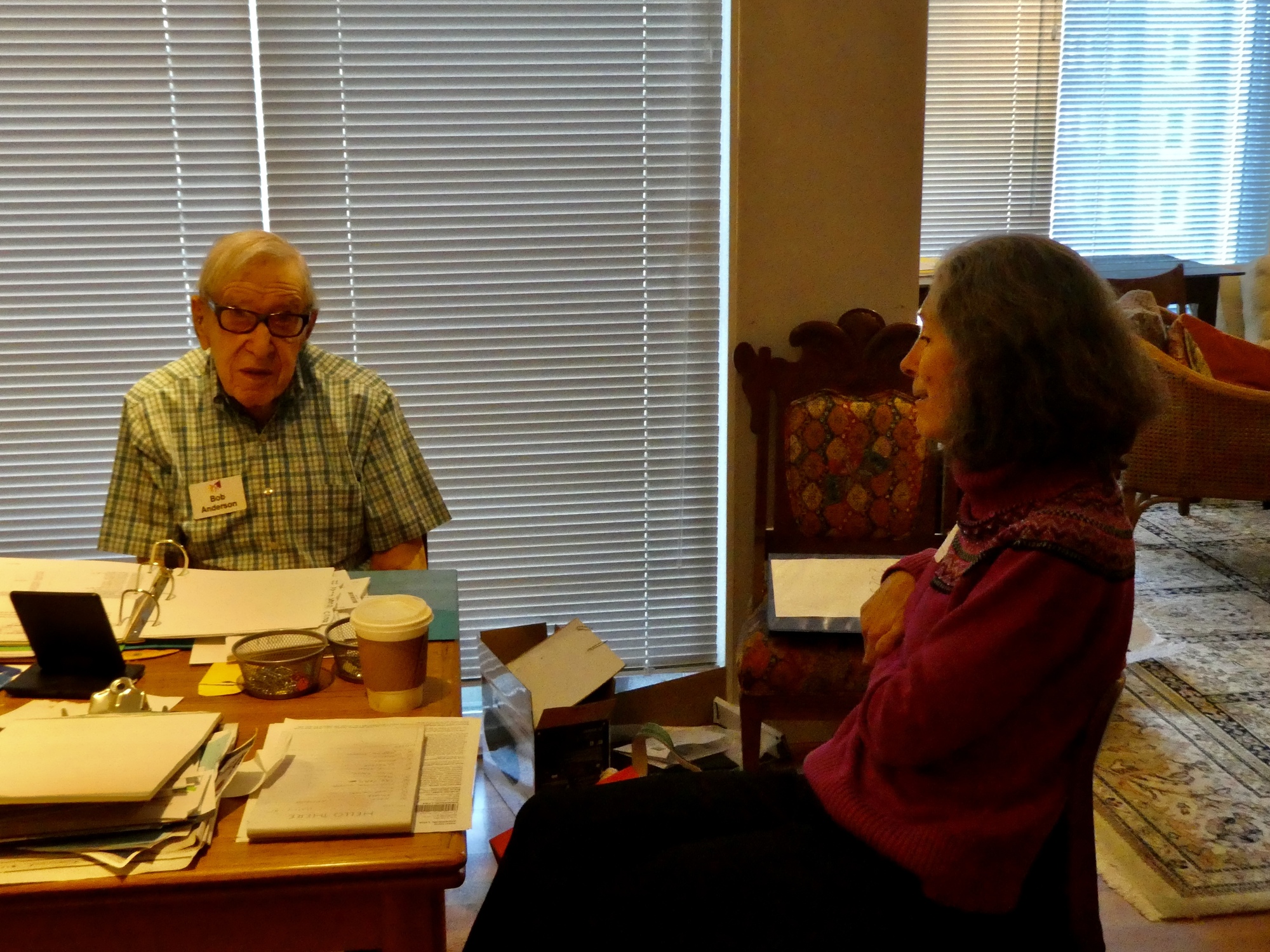 We’ve been apprehensive about this visit, anxious to see how he is doing on his own a half year after mother’s passing. It’s a relief to see how well he’s coping, and we have an excellent visit. It’s largely one-directional because dad likes to talk and even with his hearing aids in he has difficulty hearing and understanding us. We start with an extended conversation at his desk, as he goes over what he’s working on and the business affairs he’s dealing with.