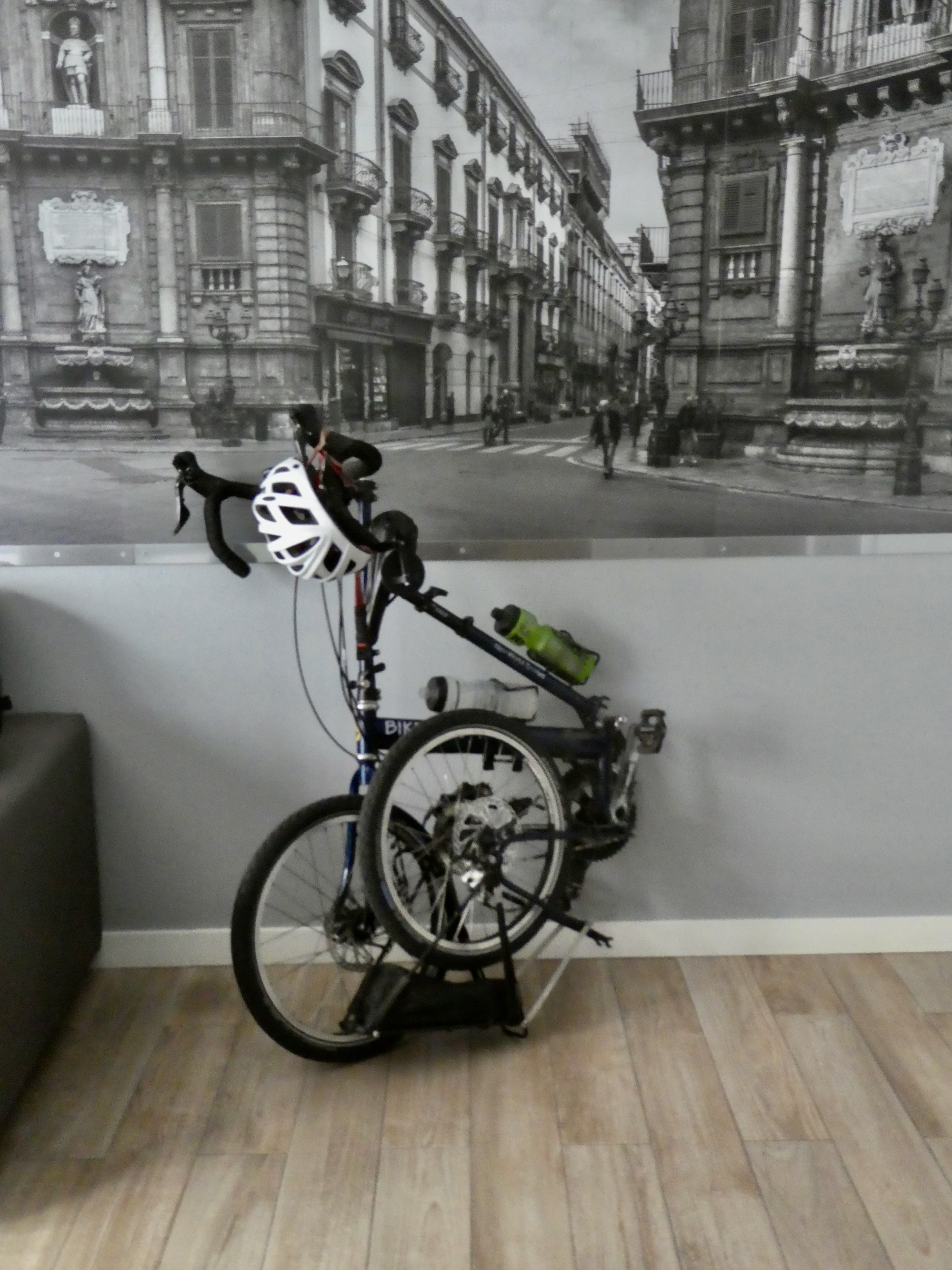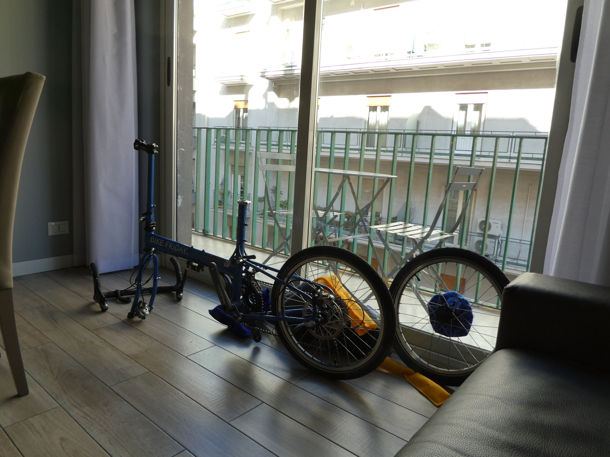 After schlepping my bike down three flights of stairs, I remembered it’s a folder. It fits in the elevator fine that way. I’ll keep it folded in our hotel room as a reminder so I don’t forget tomorrow.