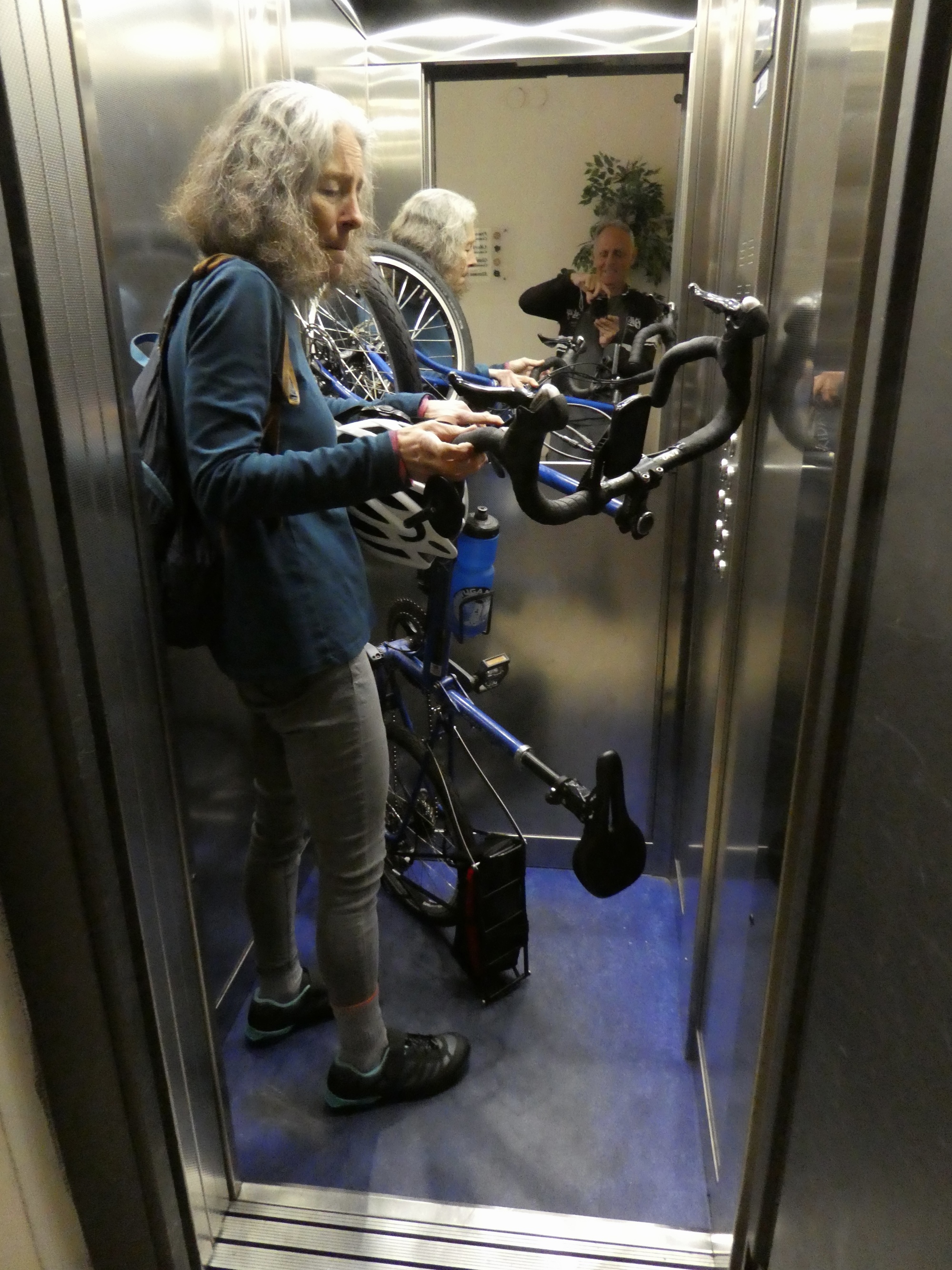 The elevator barely has room for Rachael and her bike. Unfortunately mine is just enough larger so that it doesn’t quite fit.