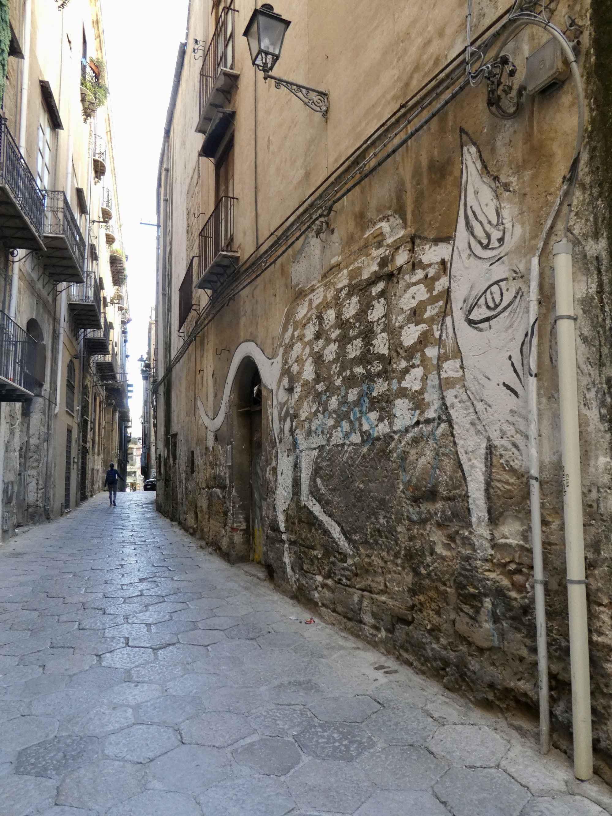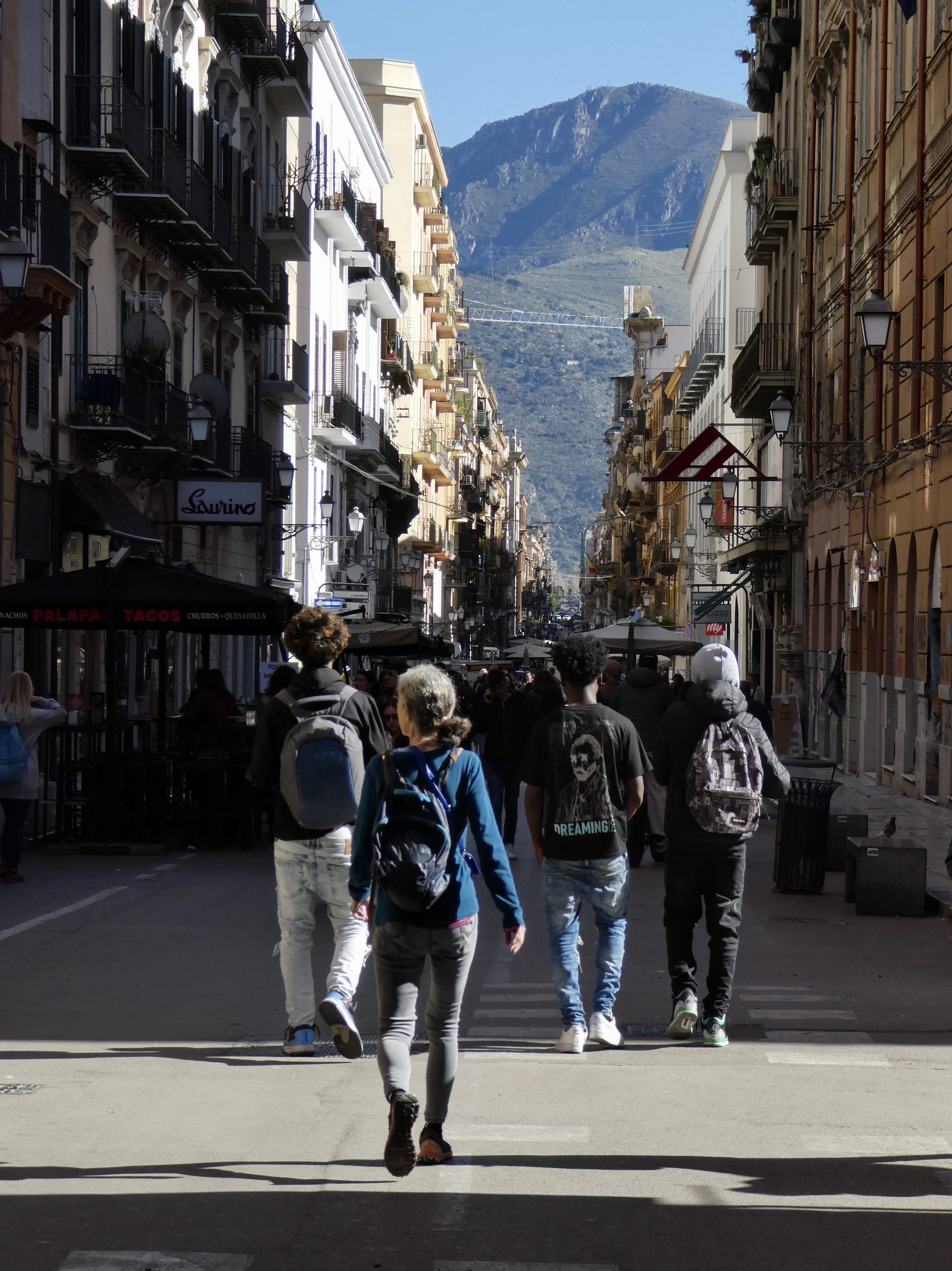 On pedestrianized Via Maqueda, walking toward the historical center of the city. It’s not too crowded now, but by later in the day it’s a precarious spot, dense with pedestrians and with bicycles and scooters weaving through unannounced just past your shoulder.