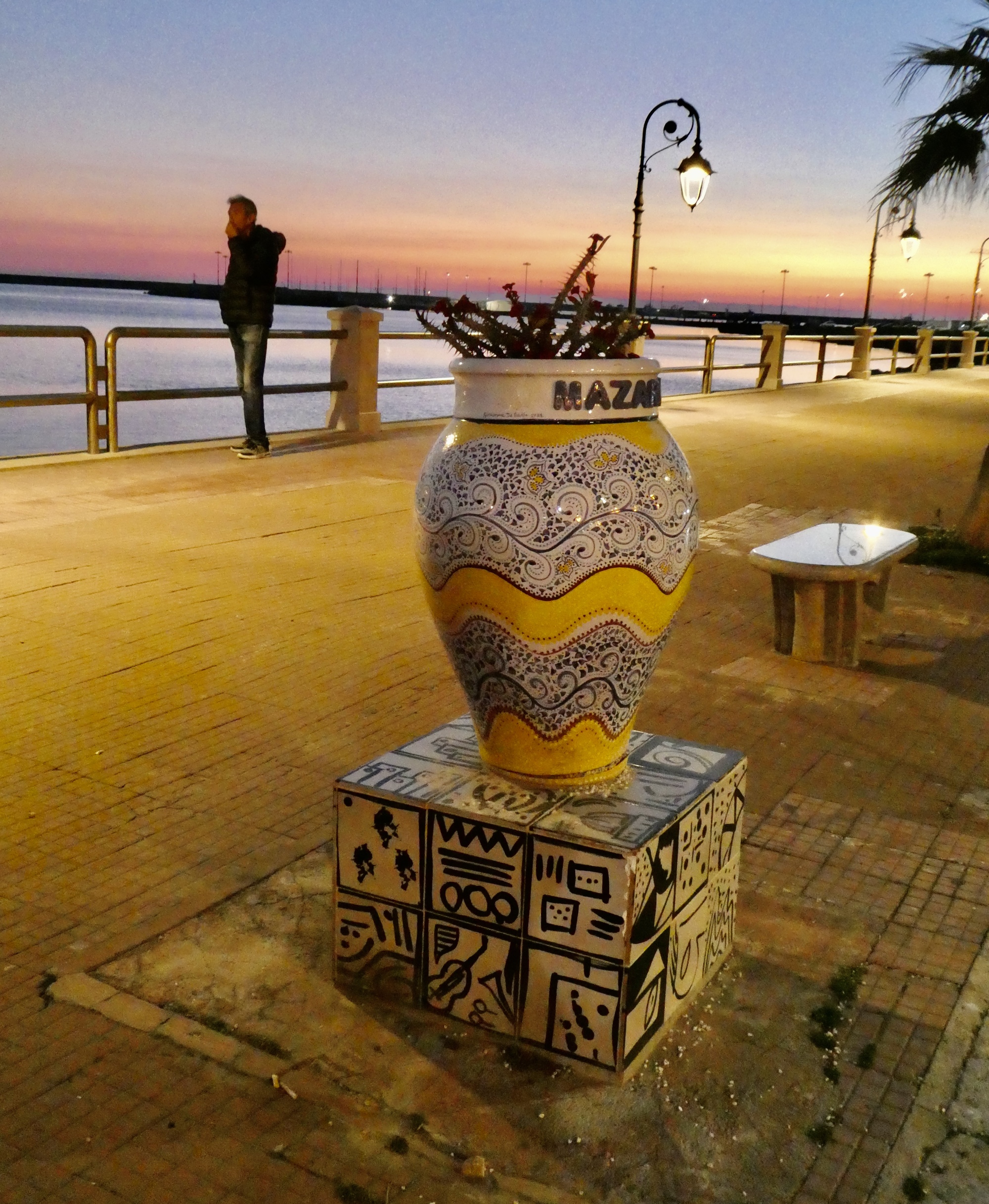 We went out again, together this time, to see the sunset and fill the time until our restaurant opened at 7:30. We walked past the cathedral and its piazza and then strolled long the long seafront promenade. I didn’t see this part of the town at all in my walk, and was very impressed. Mazara is quite attractive and looks like it would make a fine base for a longer stay.