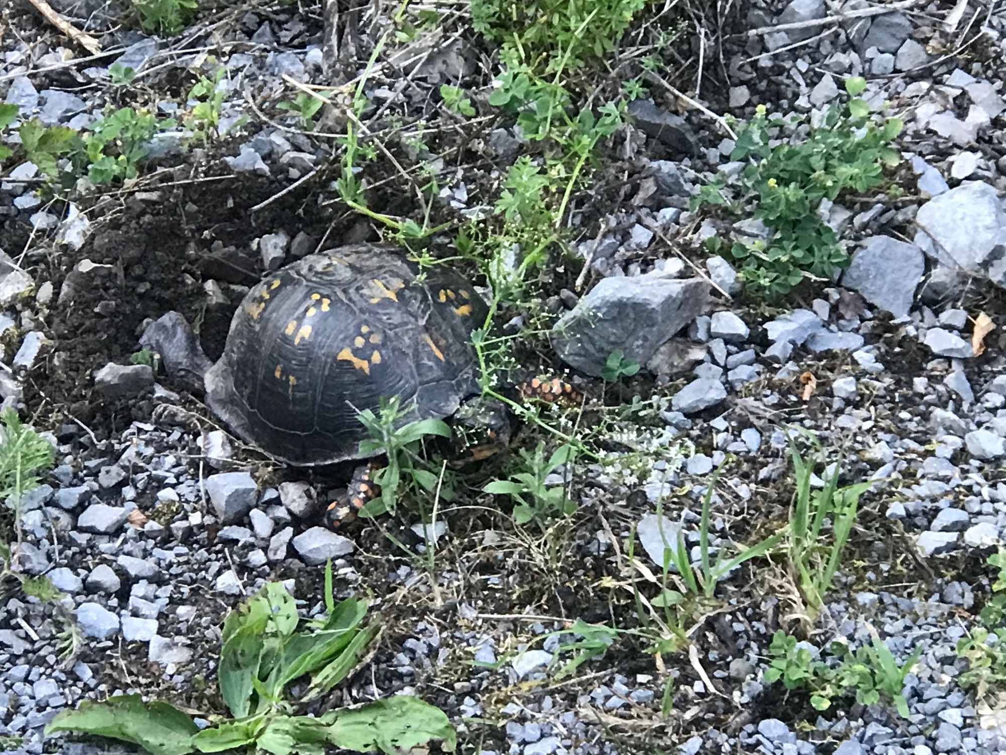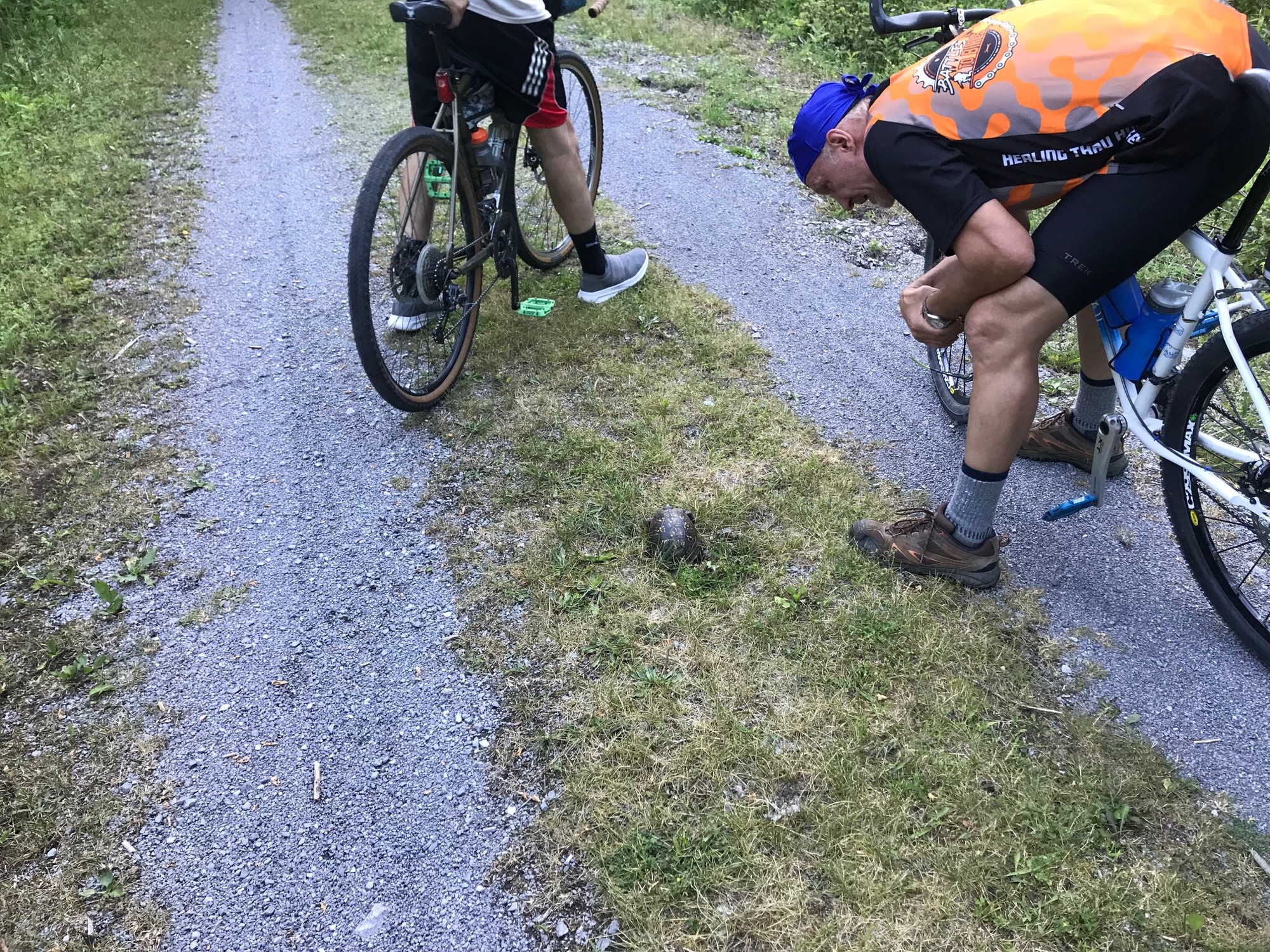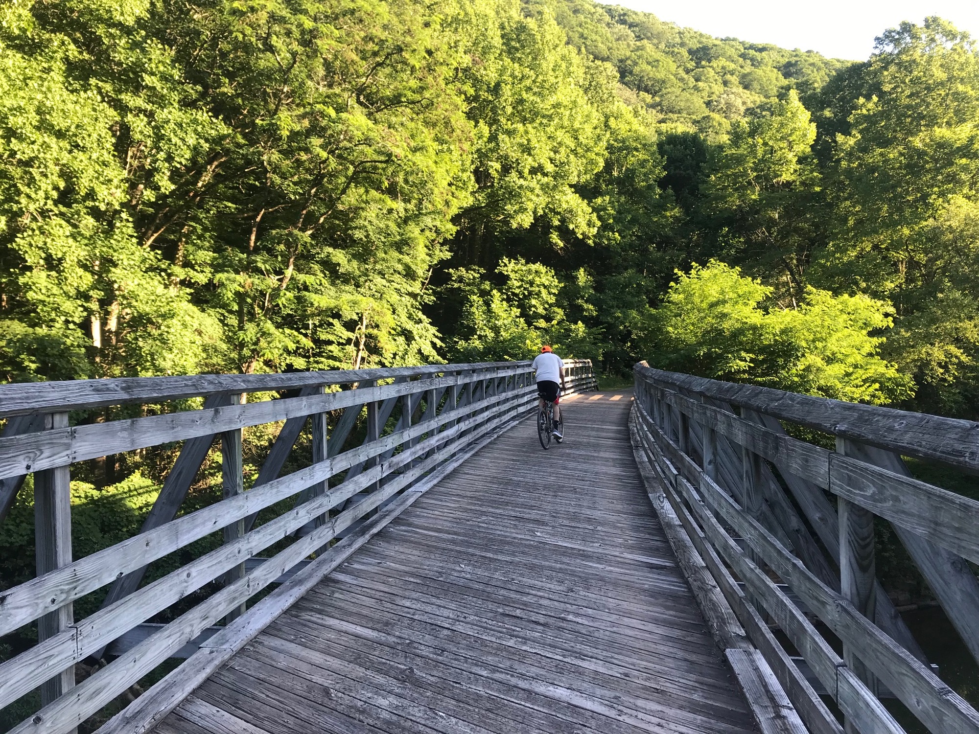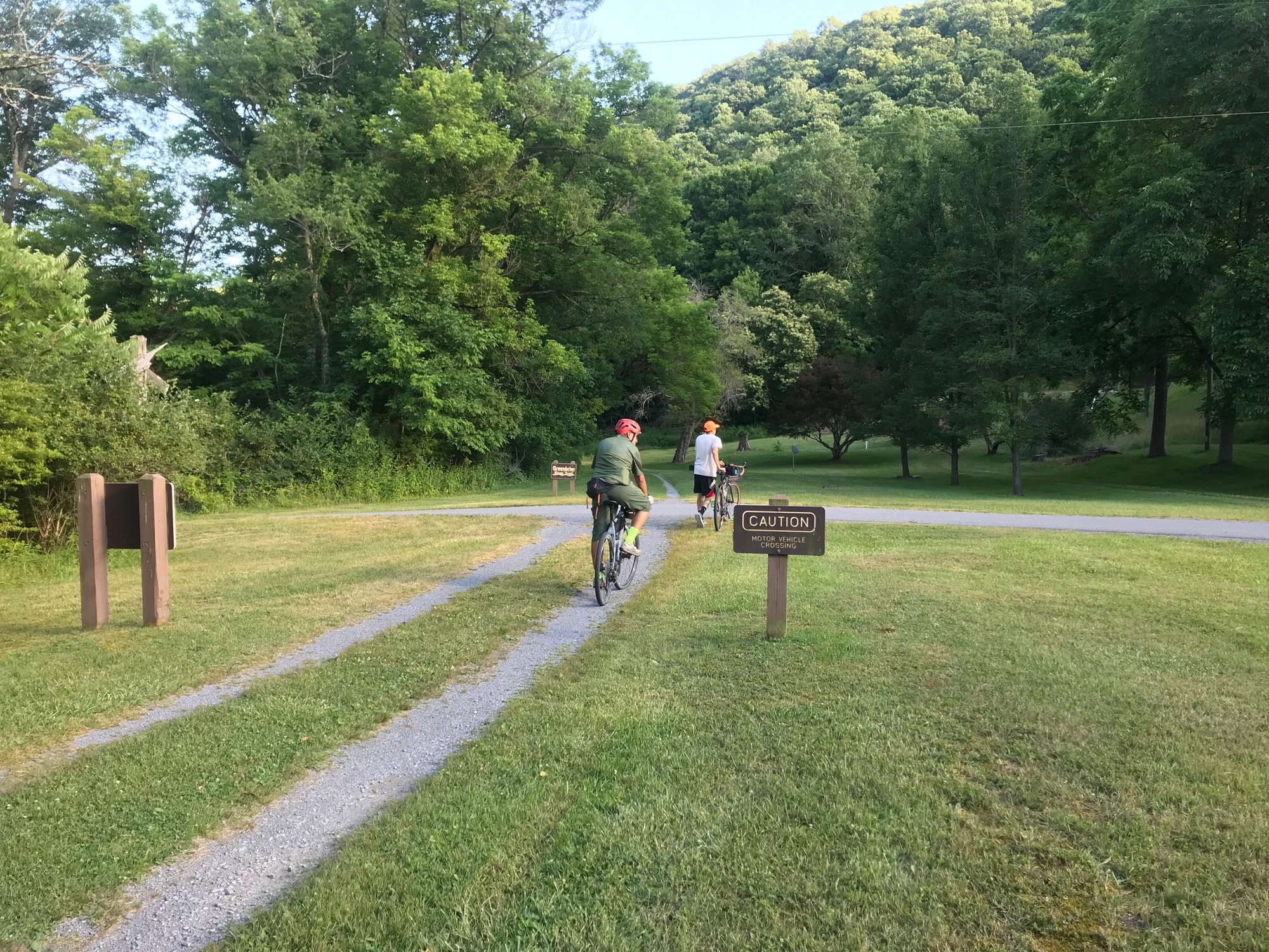 The GBT rolls on through wooded valleys, past more wildflowers, a few wooden bridges, the ever-present Greenbrier River, and some wildlife. If you're lucky, you might even see a snake or a bear. I didn't see either on this trip but there are enough stories to verify that bear are around. Tim and Anthony saw a black snake. All of us saw several female turtles digging holes alongside and in the middle of the trail. They lay their eggs in those holes. As if those hatchlings do not have a tough enough time surviving their first few hours on earth, they have to avoid being run over by the bicycle tires of unsuspecting cyclists. We did direct a maintenance truck to avoid two turtles who were actively digging holes.