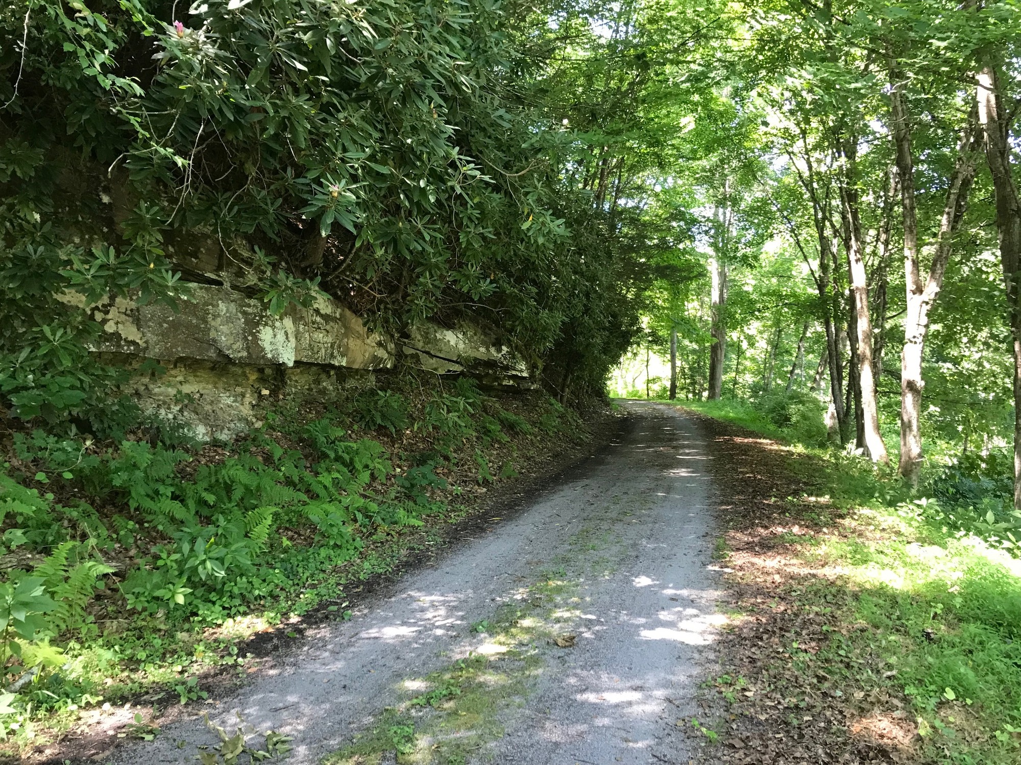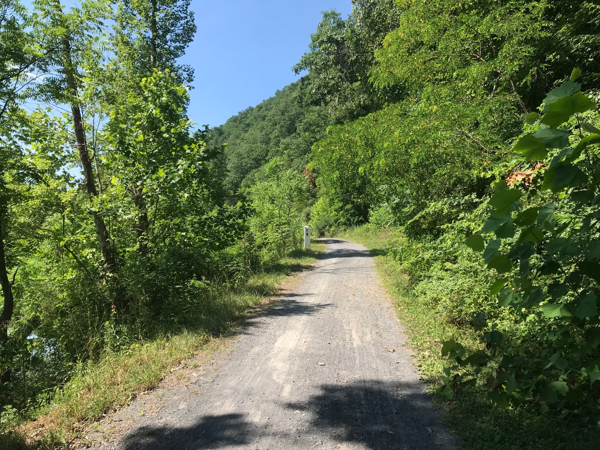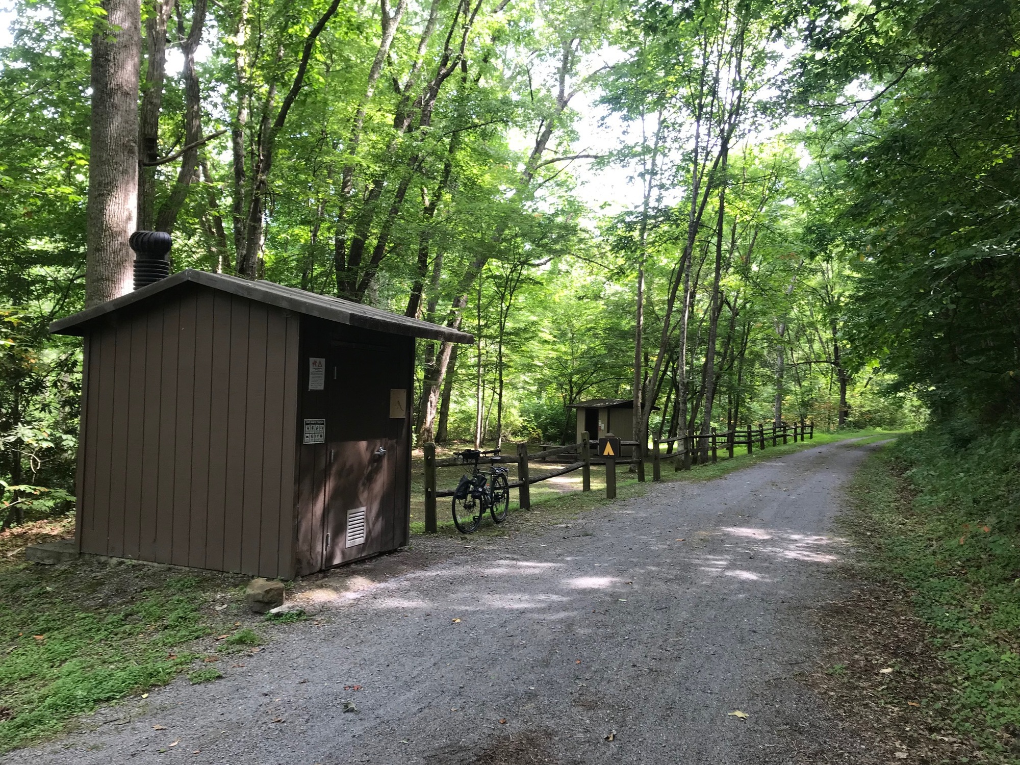On the other side of the tunnel, the GBT remained mostly shaded and cool for the rest of our ride to Renick. There were several primitive trailside camping areas along the way. However, the idea that we would have better access to water at Renick was more attractive to us. The camping areas are very nice and there is a water pump.