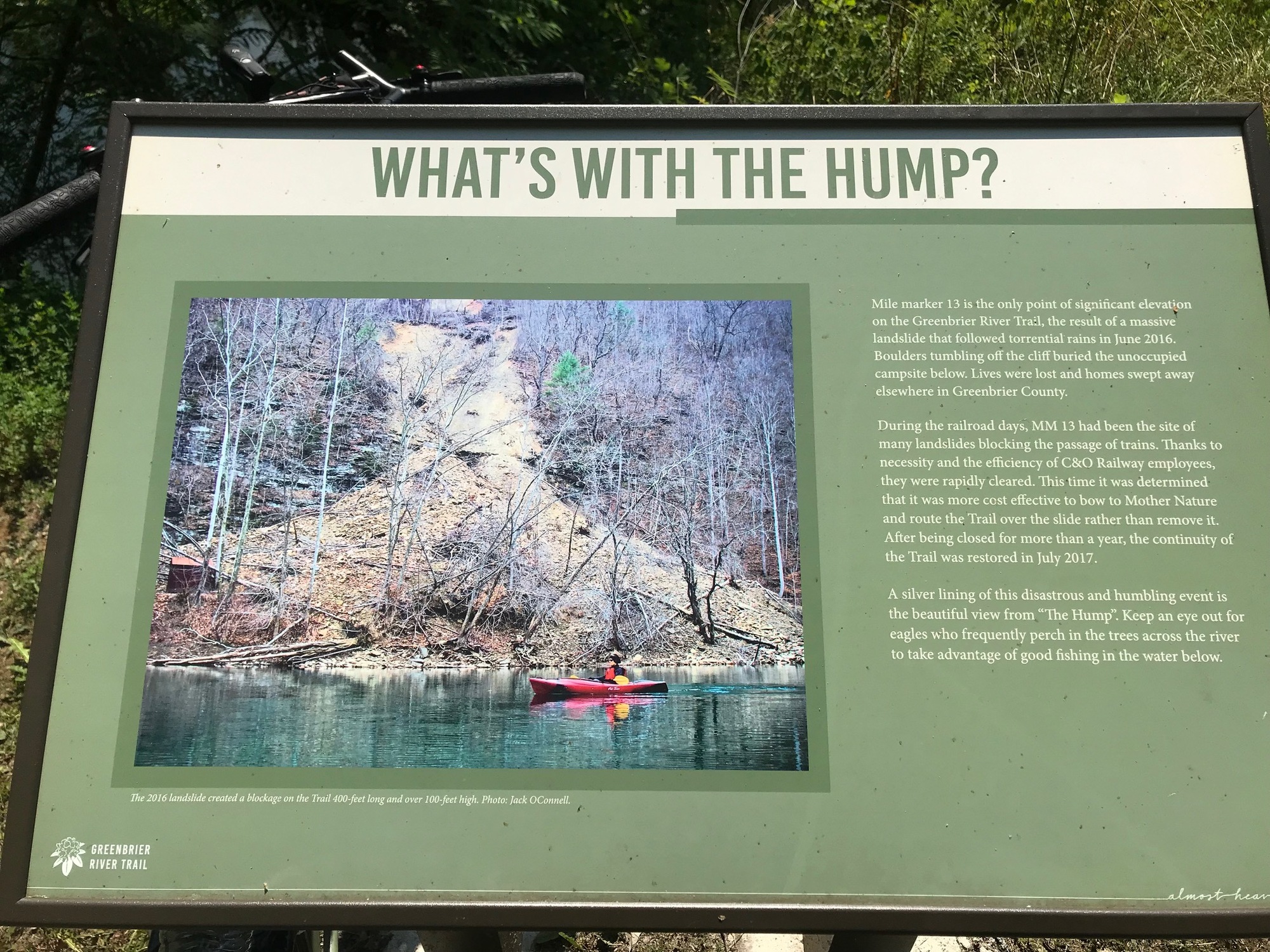 At milepost 13, there is a feature called The Hump. Apparently, after a large landslide, it was decided to simply make a hump in the trail instead of clearing all of the debris. The Hump is one of the only places where a rider will have to do any climbing on the trail. It really isn't bad at all but I would say that if coming from the South, a rider would do more climbing than if coming from the North. But what's one little hill among friends?