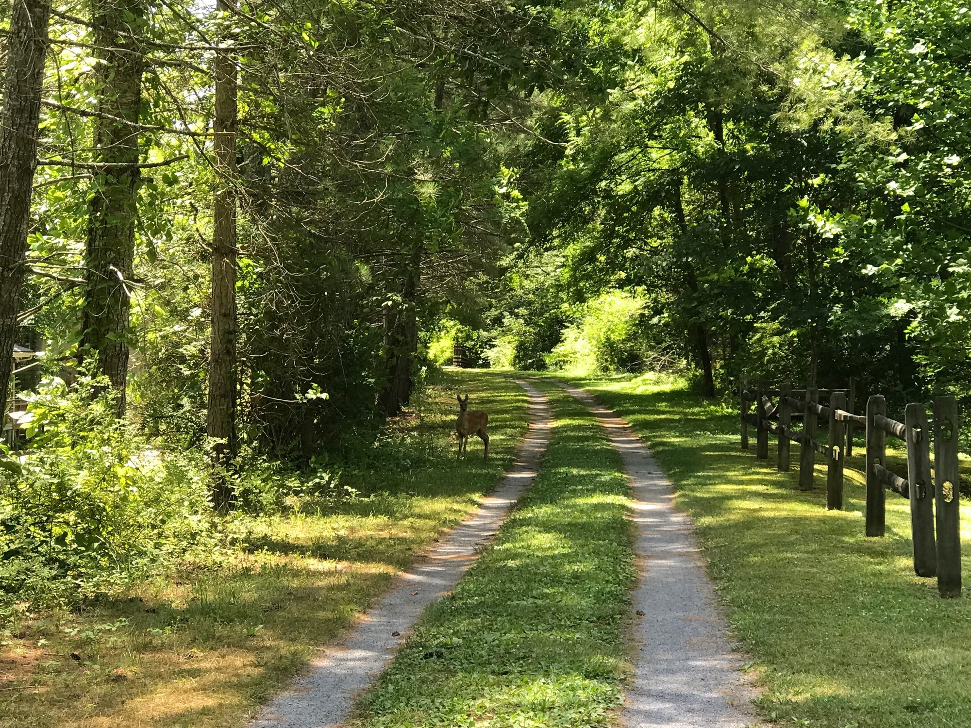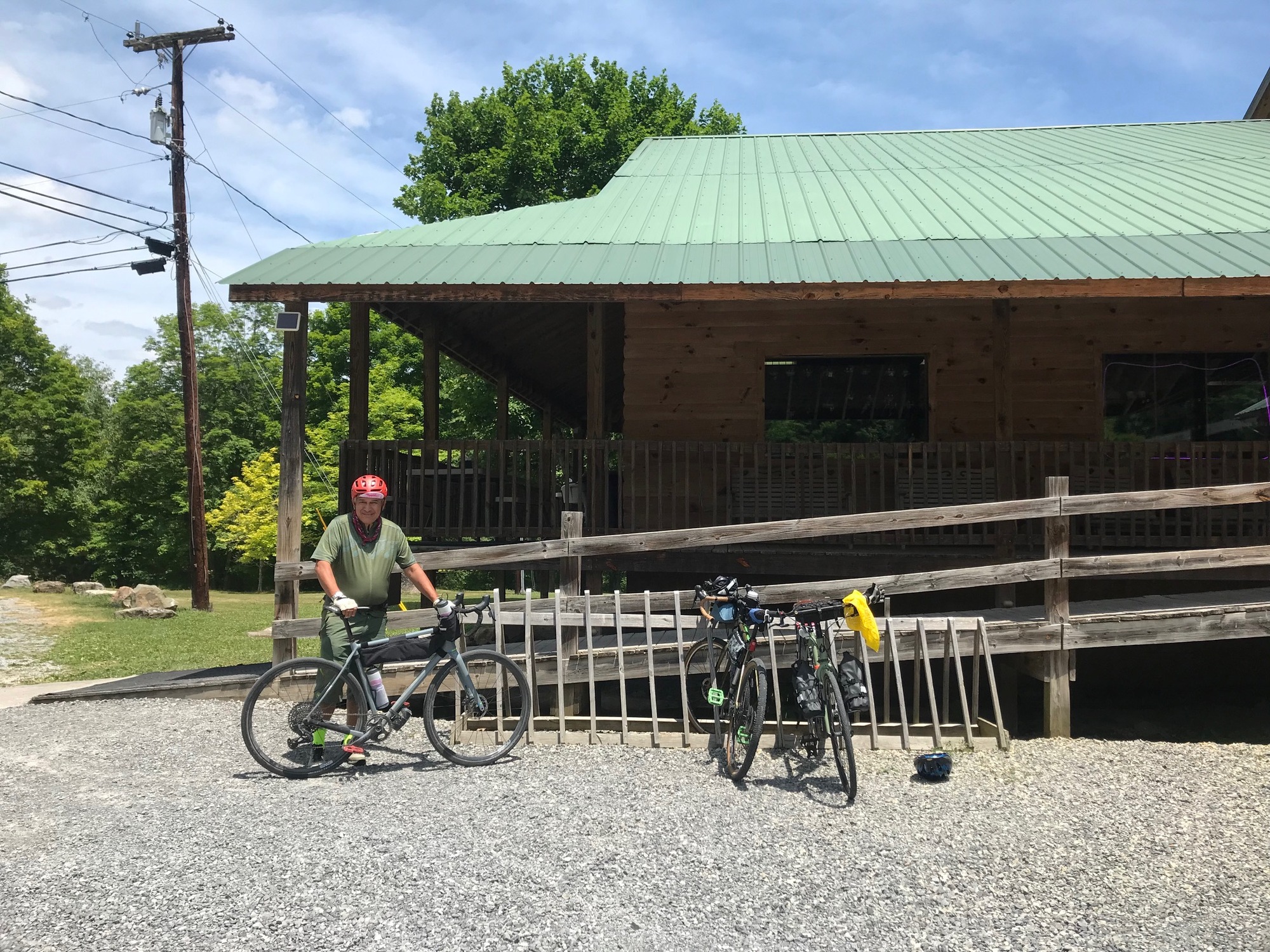 So, after the repairs, some coffee, and some lollygagging around town, we got a late start (11:20 AM) on our trail ride for the day (6/25/24). Since air temperatures were warmer than yesterday, it could be felt if in the direct sun. However, because most of the trail is lined with trees, their shade made things much cooler. The GBT continued to follow the river, which offered some beautiful vistas. There were some homes on the shores, more interesting flowers, occasional wildlife sightings, and a whole lot of peace and quiet. Although there were other trail users, they seemed to be very well spread out, so as to allow for riding alone most of the time. Most everyone met along the way was friendly. Around 16 miles from Marlinton, we stopped at a place called Jack Horner's Corner (JHC).