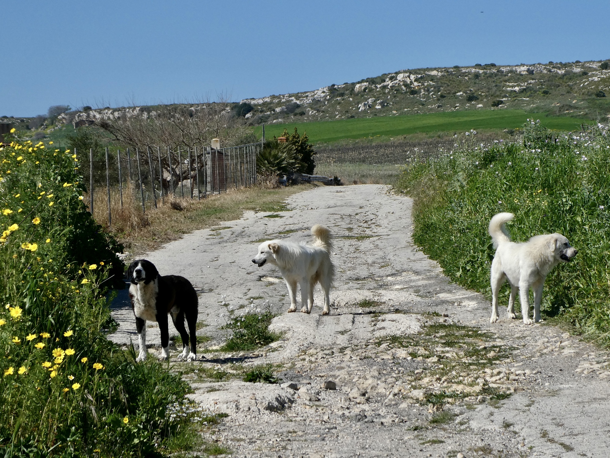 The one situation I hadn’t considered though was the dogs. There are three of them snarling and barking at me to turn me back, because they’re protecting a small herd of sheep. Fortunately the herder is up there with the sheep too and whistles them off, and eventually they obey and grudgingly let me pass unscathed. Almost as soon as I pass the sheep start tumbling out of the grass and onto the path, going the way I’ve just come from.