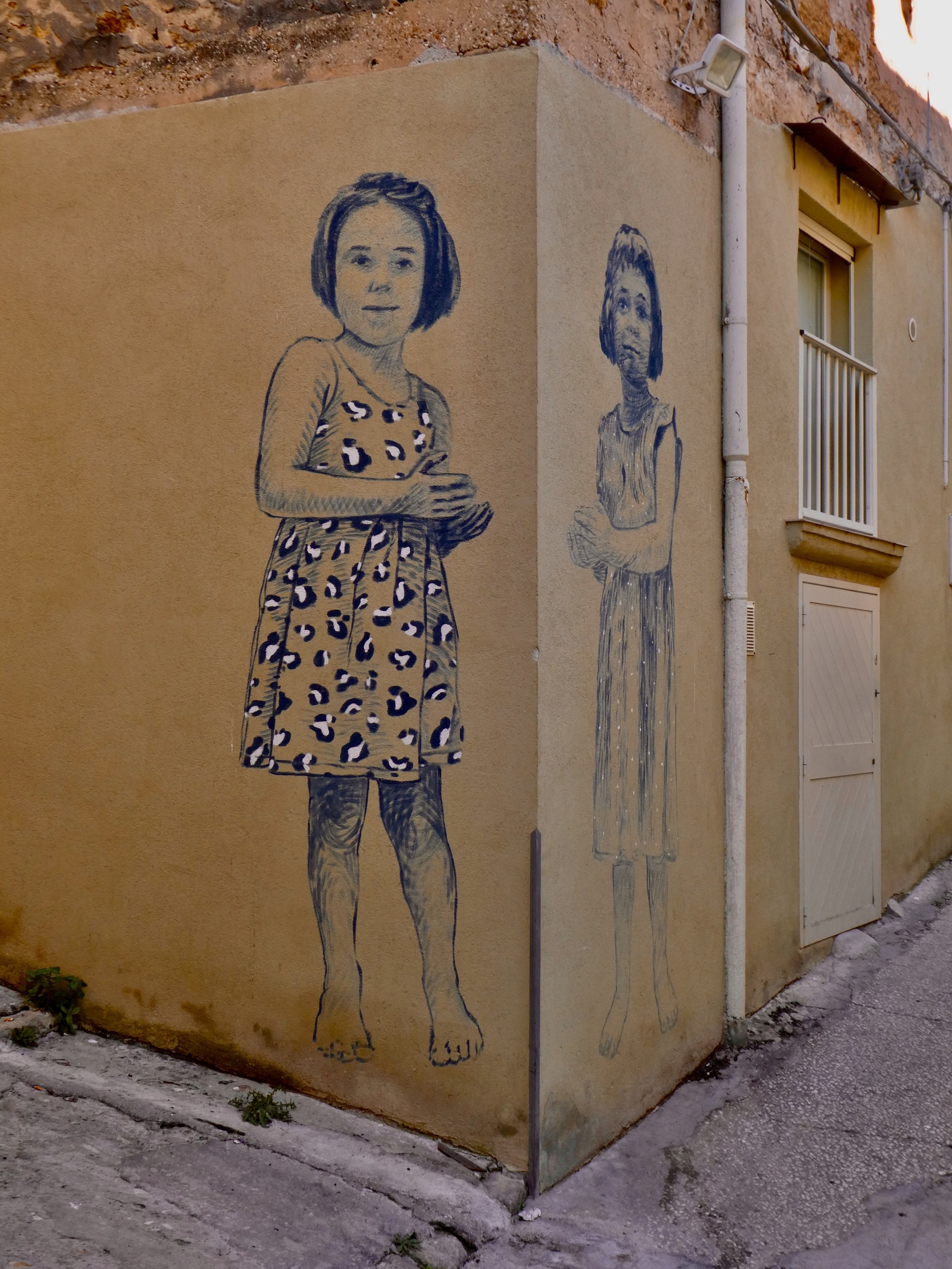 We start out together, following the one zigzag stairless path that gets us out of our warren, but when I come to a bit of wall art I want to stop at she’s quickly gone.
