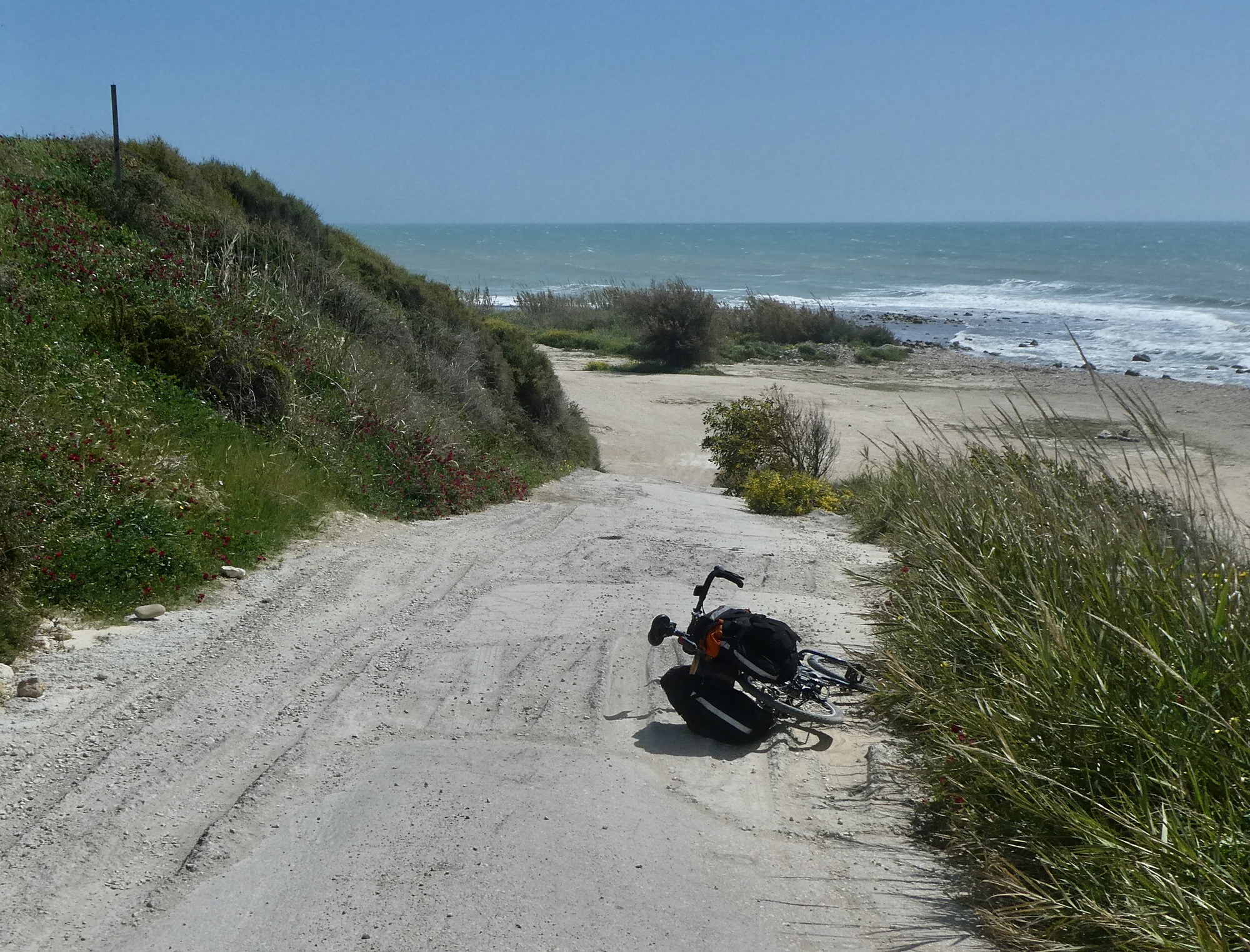 So I’d say that it’s right about there when our ride east went south. Another mile later and we approached the coastal village of Torre di Gaffe. The route I picked for us went to extremes to avoid traffic and takes a questionable route into the village, dropping steeply down to the beach and then following the sand around a small point. I decided to walk ahead and scout out the situation to make sure we’ll connect up to a road on the other side, which we will. So, no big deal really.