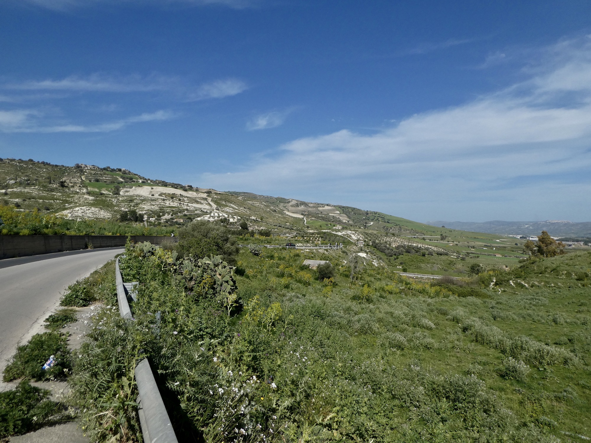 Leaving Grammichele to the northwest, it’s a steady drop for the next five miles as I fall about a thousand feet. Not far into the descent it’s a shock when I round a bend and get a good glimpse of Etna through a gap in the hills. Assuming it’s the best look I’ll get, I stop and scramble across the guardrail and into the weeds to get a clear shot from between the trees.