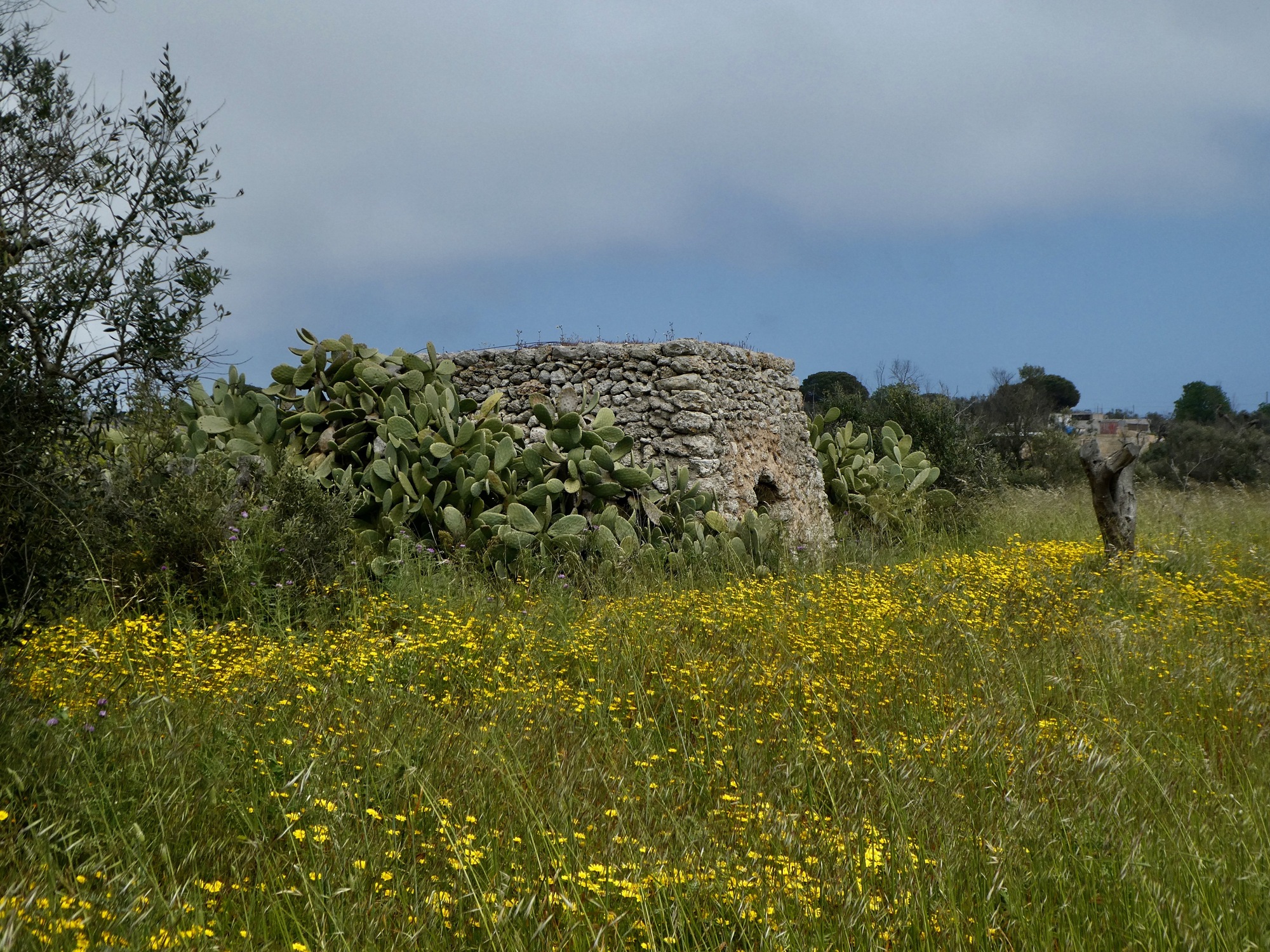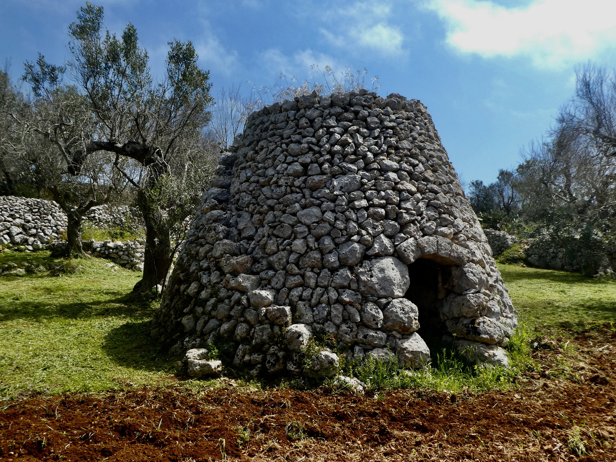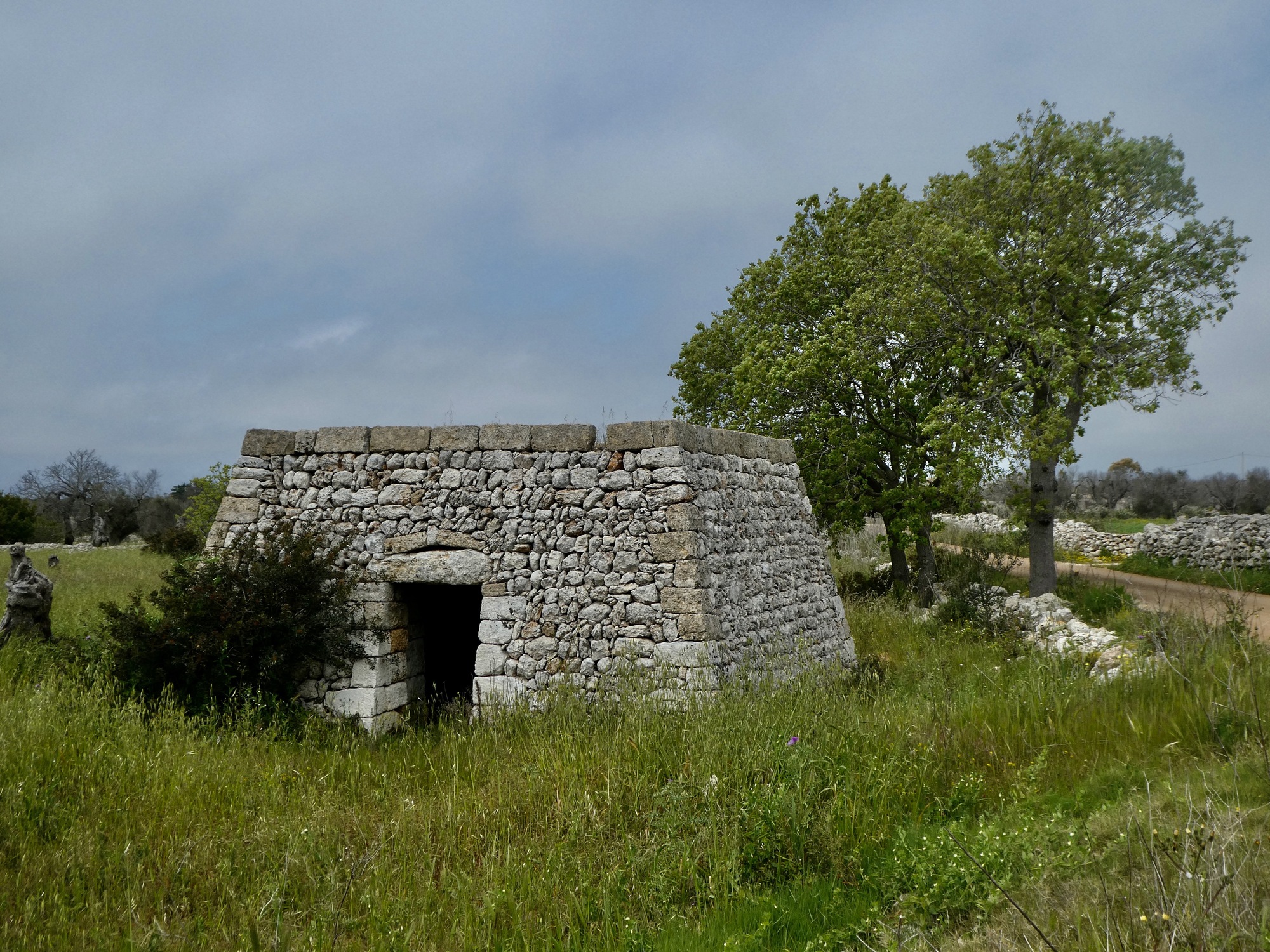Before starting off on today’s walk, let’s take a minute to thank Bob Koreis for forwarding us this article, which answers the question that’s been nagging at us for the last few days: what are all these stone structures we’ve been biking past in Salento? Are they variants on the famous trulli we’ll see when we move further north? And are the rounded and trapezoidal ones different?