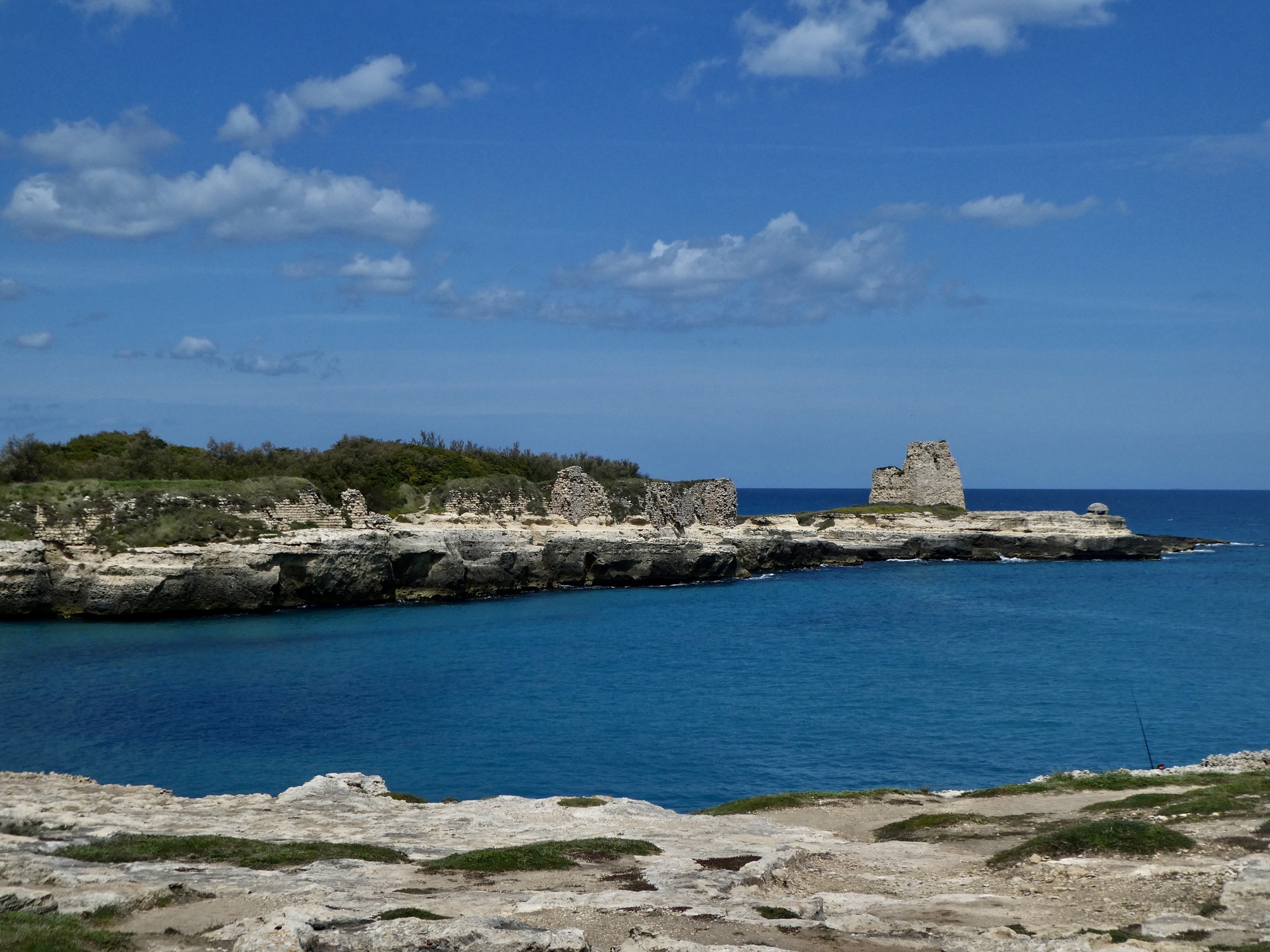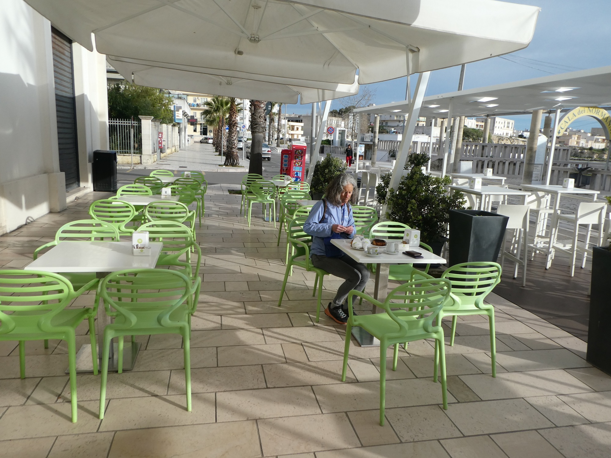 It turns out Martinucci is a fine spot for our second coffee and pastry. It’s a calm and lightly overcast but bright morning, not too chilly, and we enjoy our treats sitting at an outside table admiring Otranto’s bay, looking sleek and steely in the morning light.