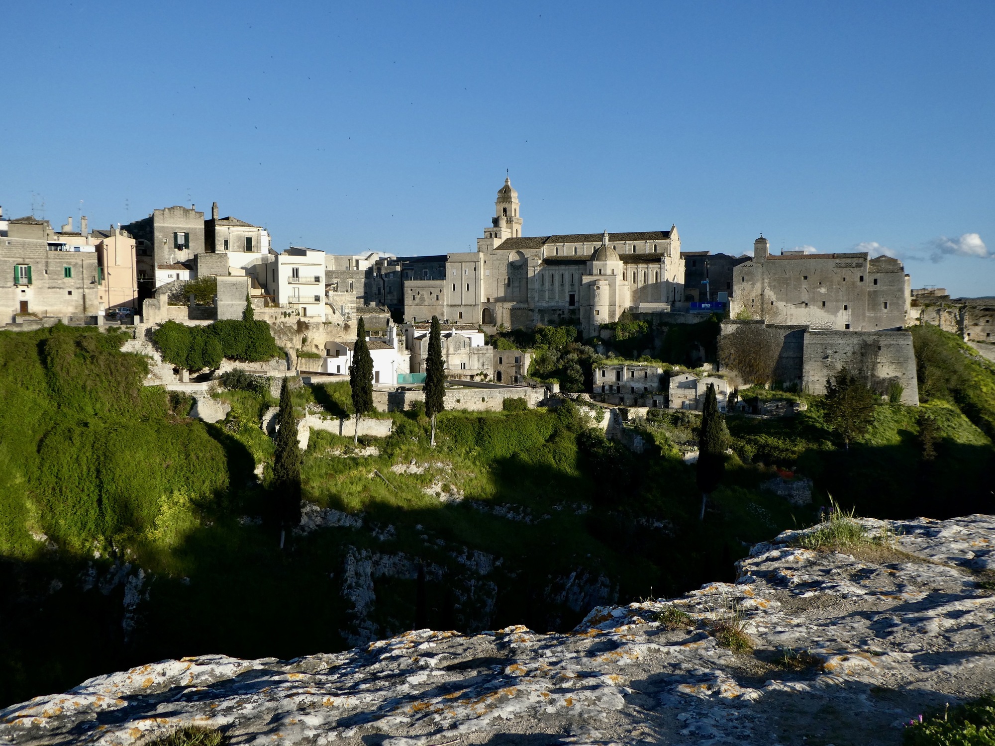 Today may have been our favorite day of the tour so far. We really like Gravina, and can imagine coming back again some year and using it as a base for a longer stay. There are attractive hiking and biking options in all directions, the setting is nothing short of spectacular, it’s the right size for us, it’s vibrant and interesting without being awash in tourists, it has some appealing restaurants. It’s pretty wonderful really, and well deserves Rocky’s very enthusiastic two thumbs up: