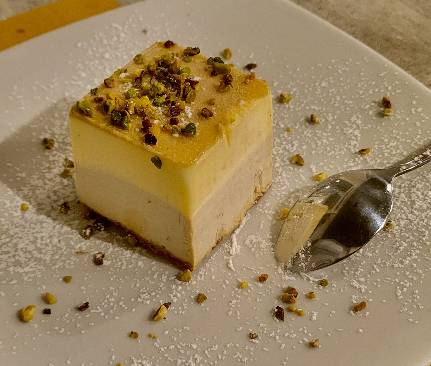 It’s raining too hard out to go on a gelato hunt so we ask for the dessert menu. Pistacchio semifreddo sounds great so we order a slice. As soon as it’s delivered and we see how delicious it looks we order a second.