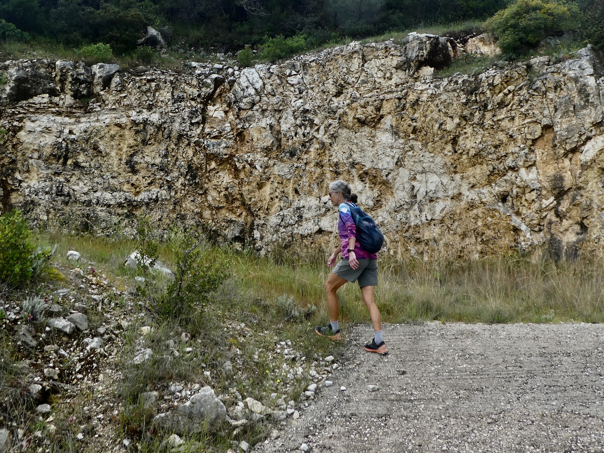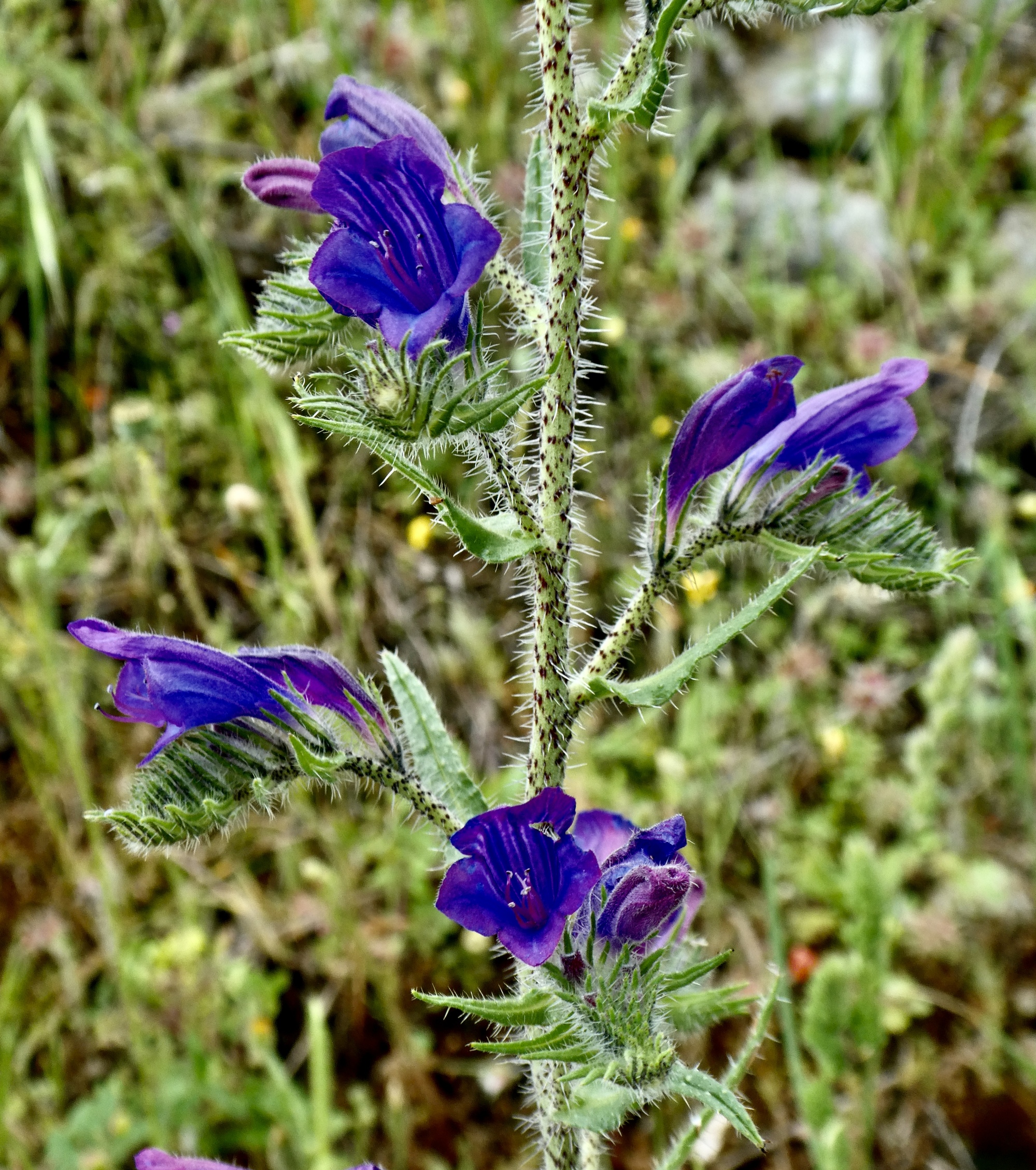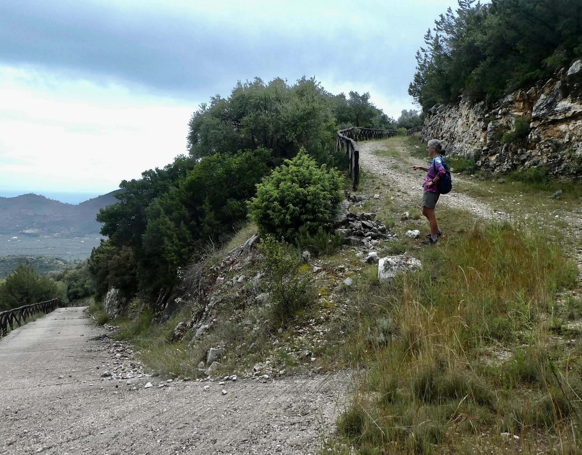 Once we’re out of town the nature of today’s walk is different. we enjoy similarly impressive views back toward town and the sea, but see no donkeys, horses or free range cattle wandering in the road. Instead we’re in woods most of the way, our path lined with colorful road cuts and an impressive diversity in the wildflowers.