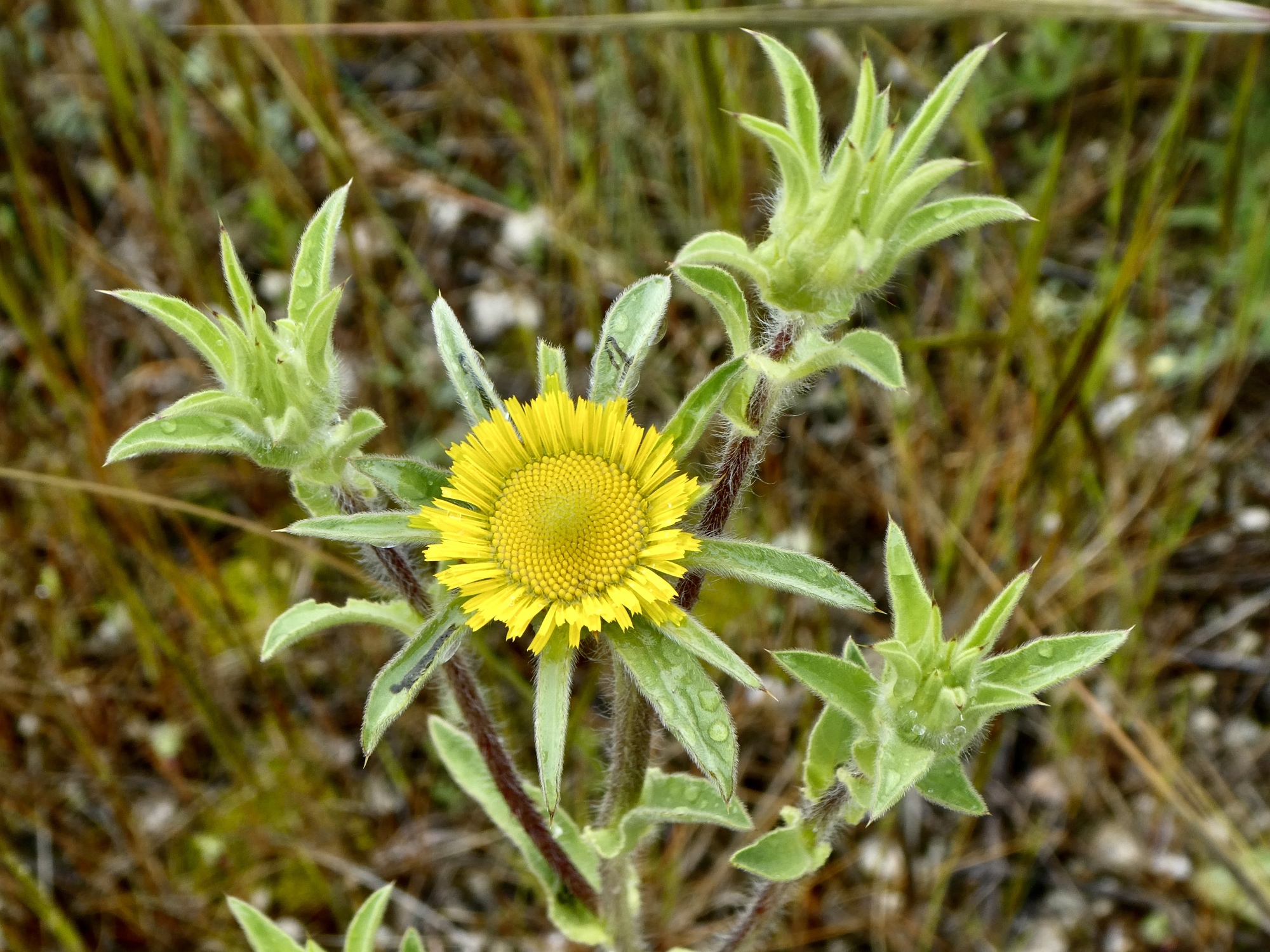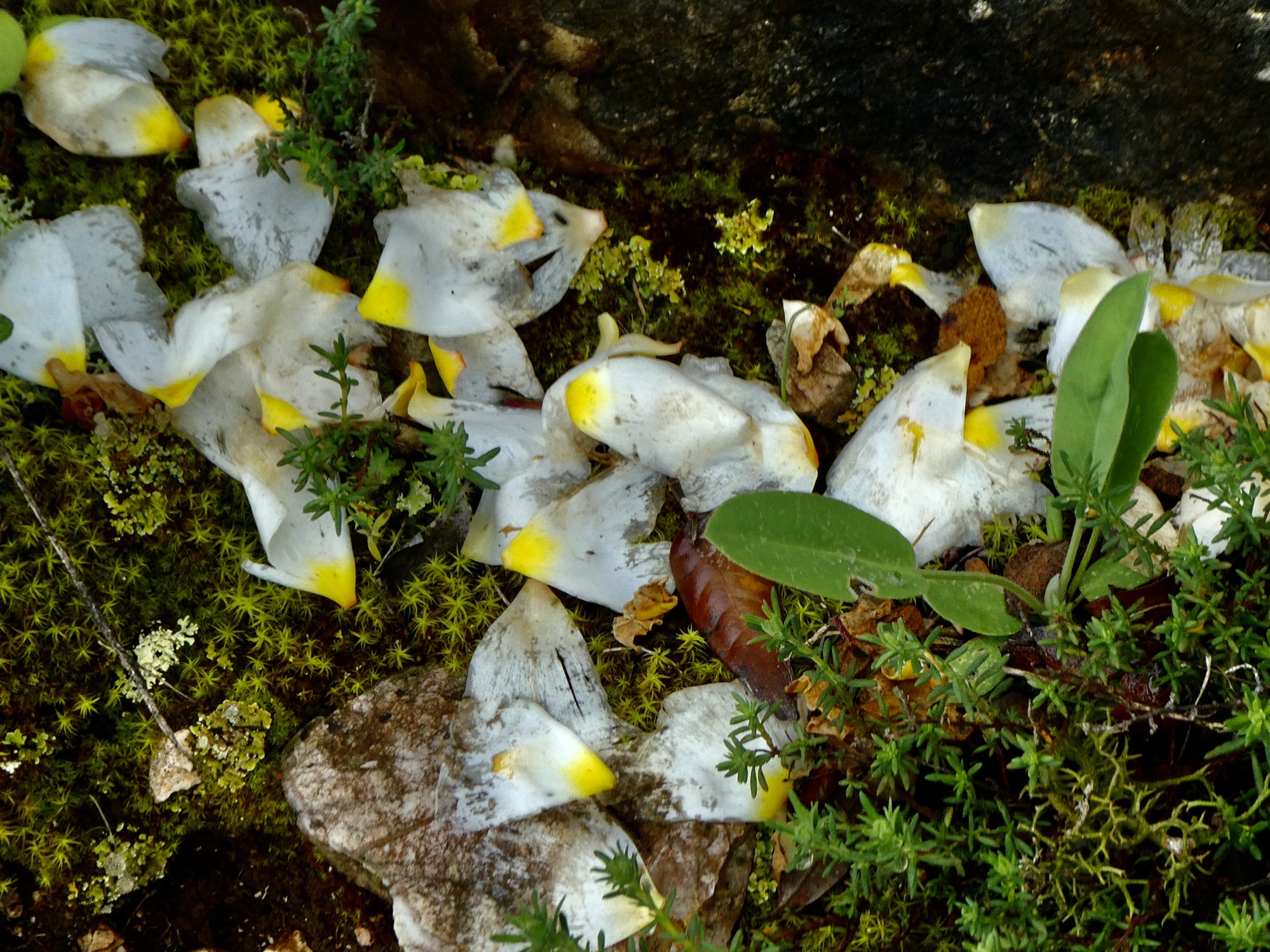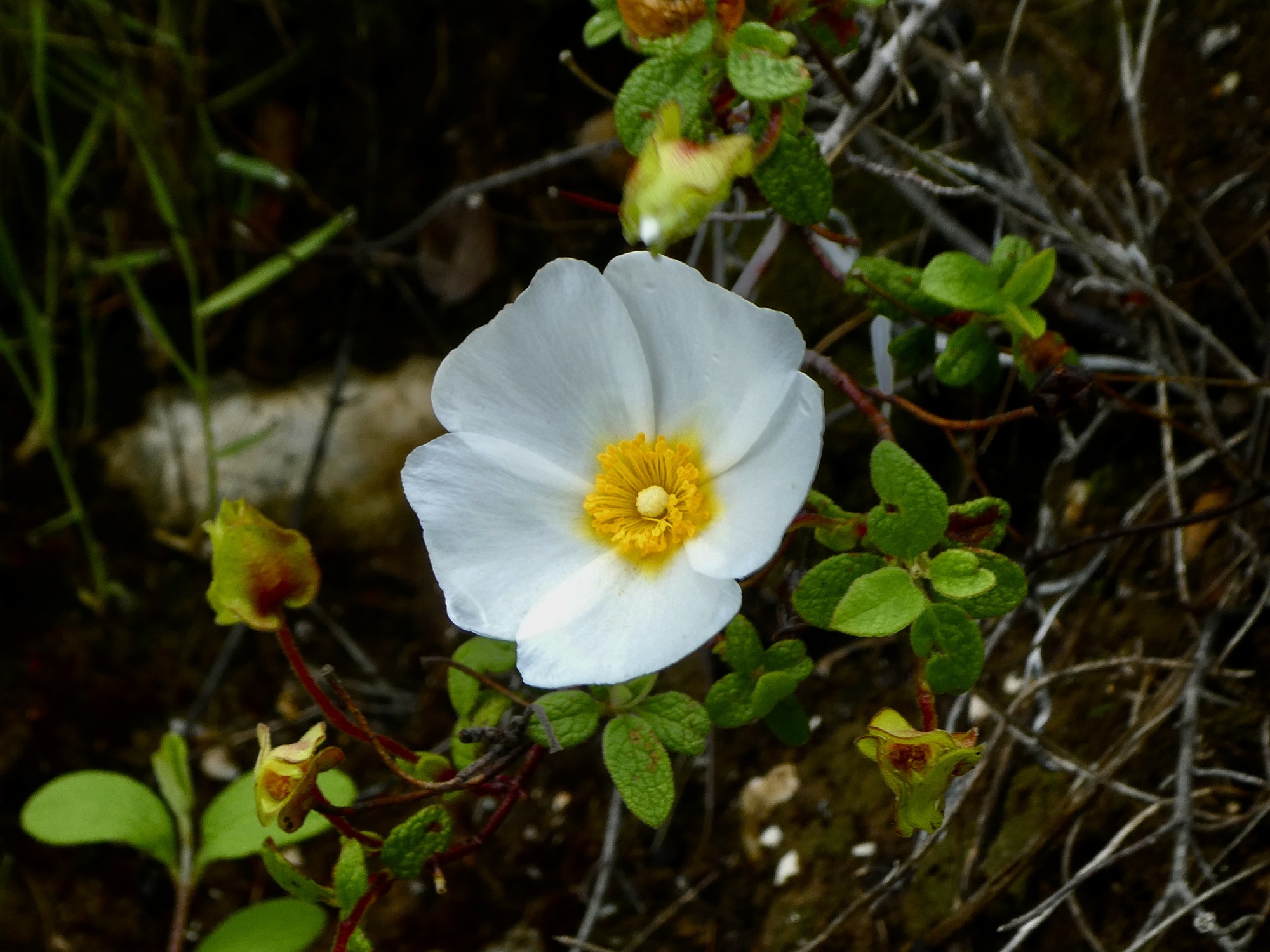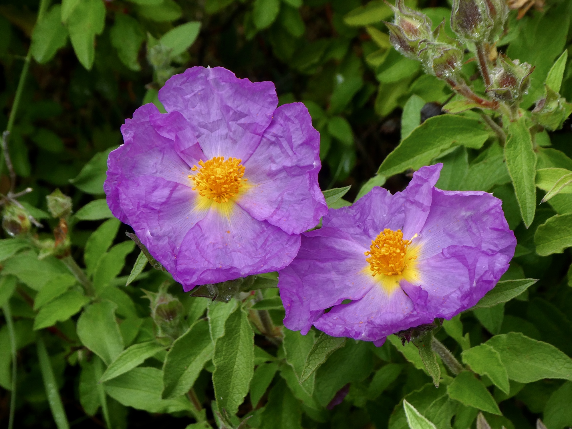 Once we’re out of town the nature of today’s walk is different. we enjoy similarly impressive views back toward town and the sea, but see no donkeys, horses or free range cattle wandering in the road. Instead we’re in woods most of the way, our path lined with colorful road cuts and an impressive diversity in the wildflowers.