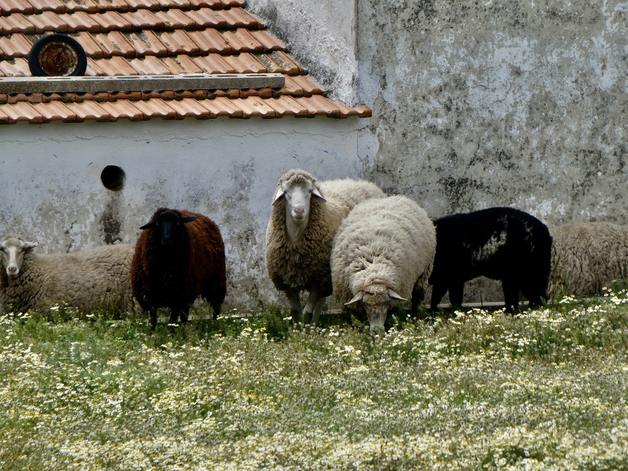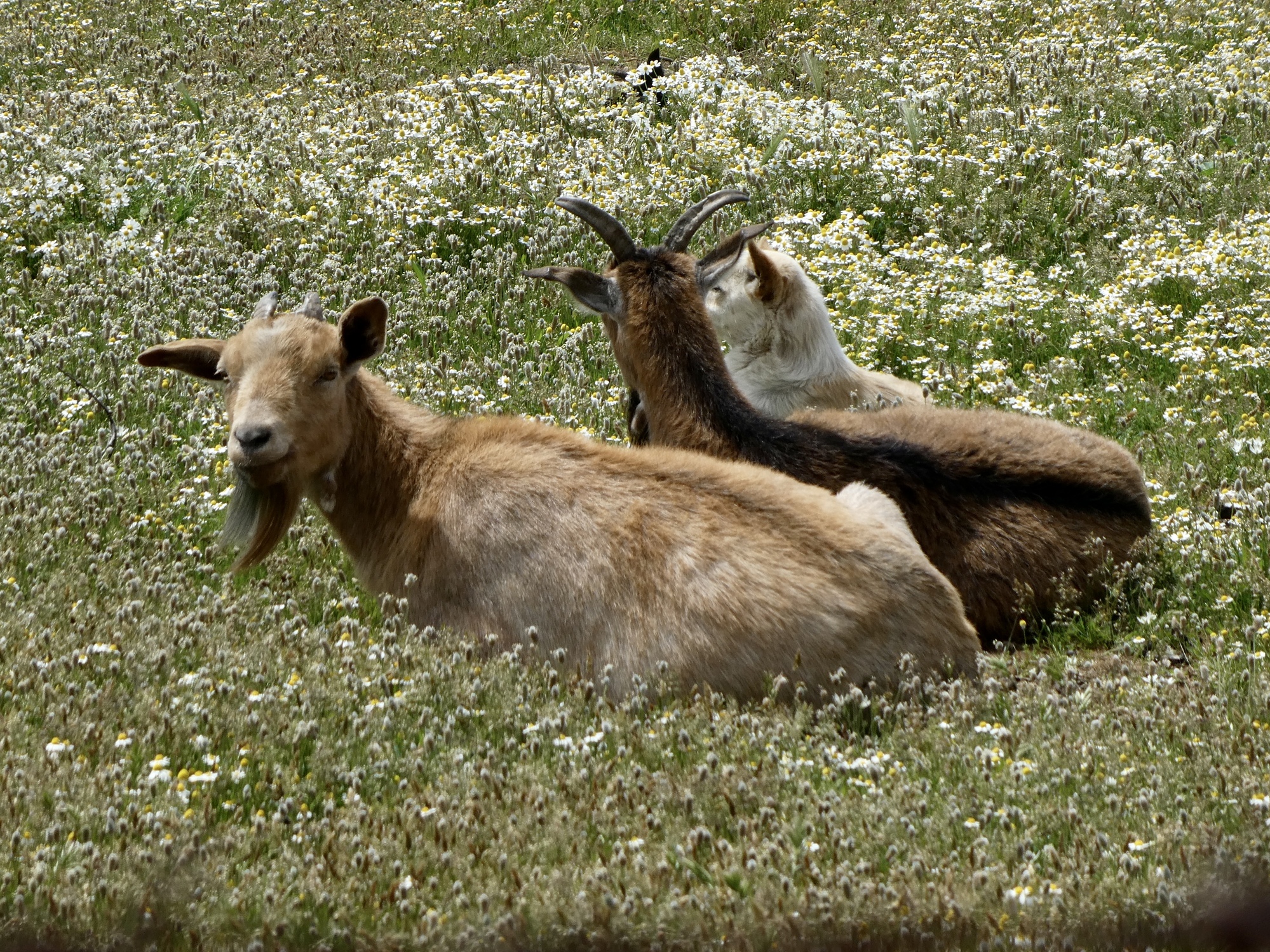 The ride stiffens a bit toward the end of the climb, but then our reward comes when we turn west and drop back to the plain, losing around a thousand feet in the next four miles. This and the following miles are totally brilliant as one fantastic sight follows another: spectacular views, outrageously colorful flower displays, a herd of maybe five hundred goats on the move, and there’s even a fox crossing the road just ahead that teases me by pausing on a rise to look back my way just long enough for me to reach for the camera and hope for a shot before slinking away.