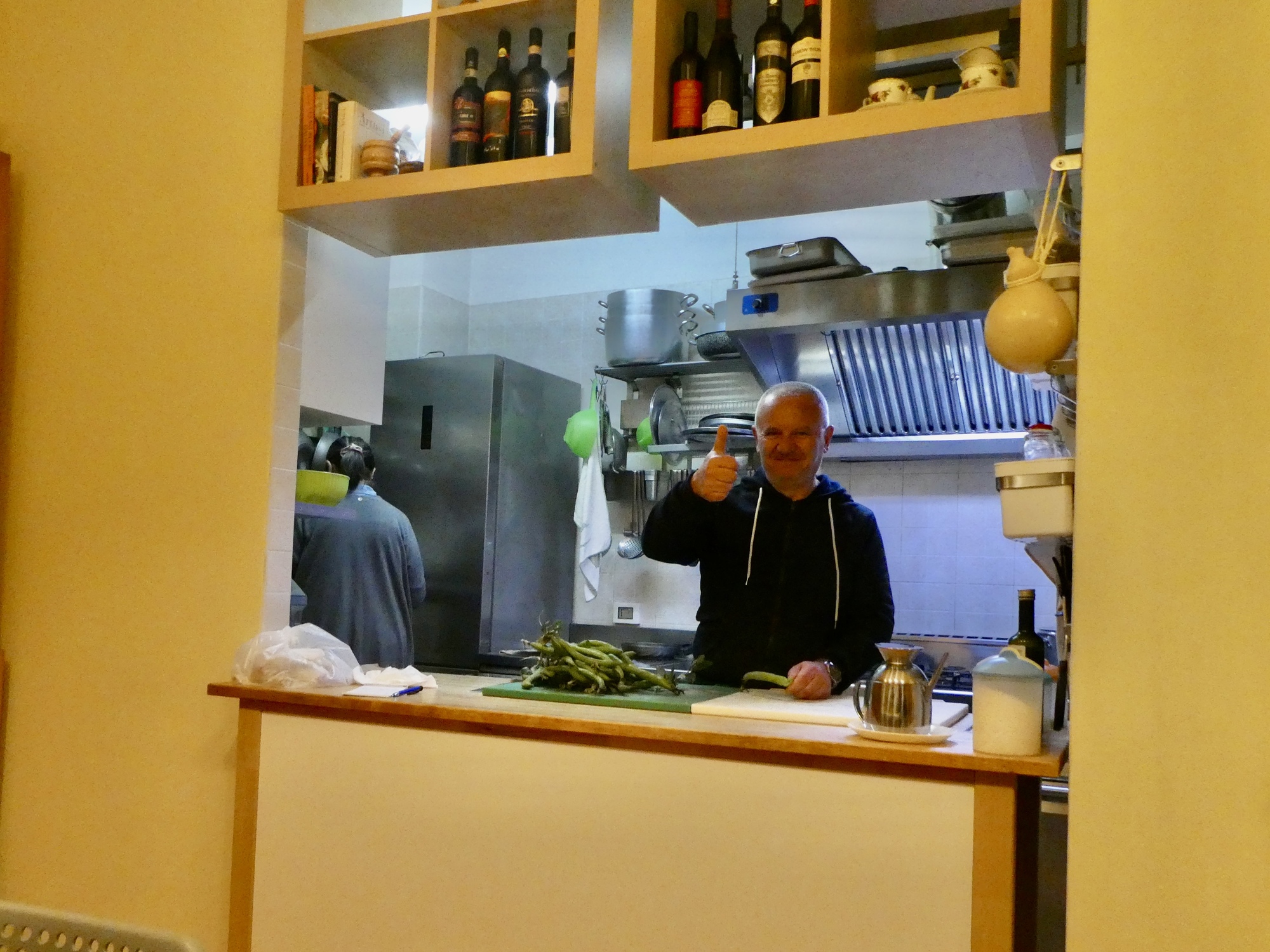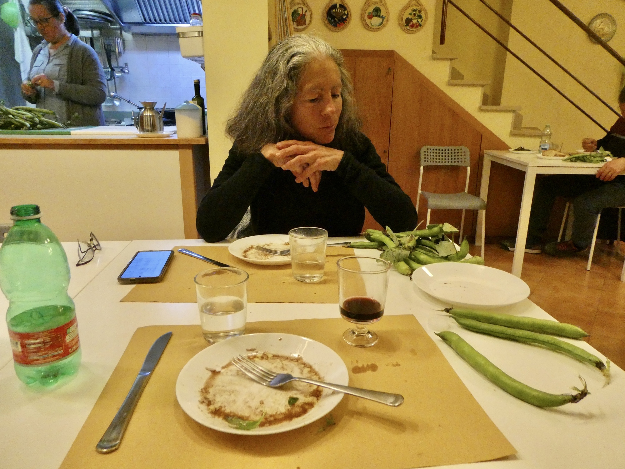 We end up with orecchiette with broccoli and fava beans with chicory as starters, and then follow it with a shared plate of Straccetti di Vitelli as the second. Just before we leave a friend of the family steps in the door with a large shopping bag of fresh picked fava beans, drops a few on our table and on that of the only diner in the room and leaves the rest on the kitchen counter for the owners to ooh and aah over. A great way to end a spectacular day. On the way back to the room Rachael suggests I look behind and up and observe the totally full moon.