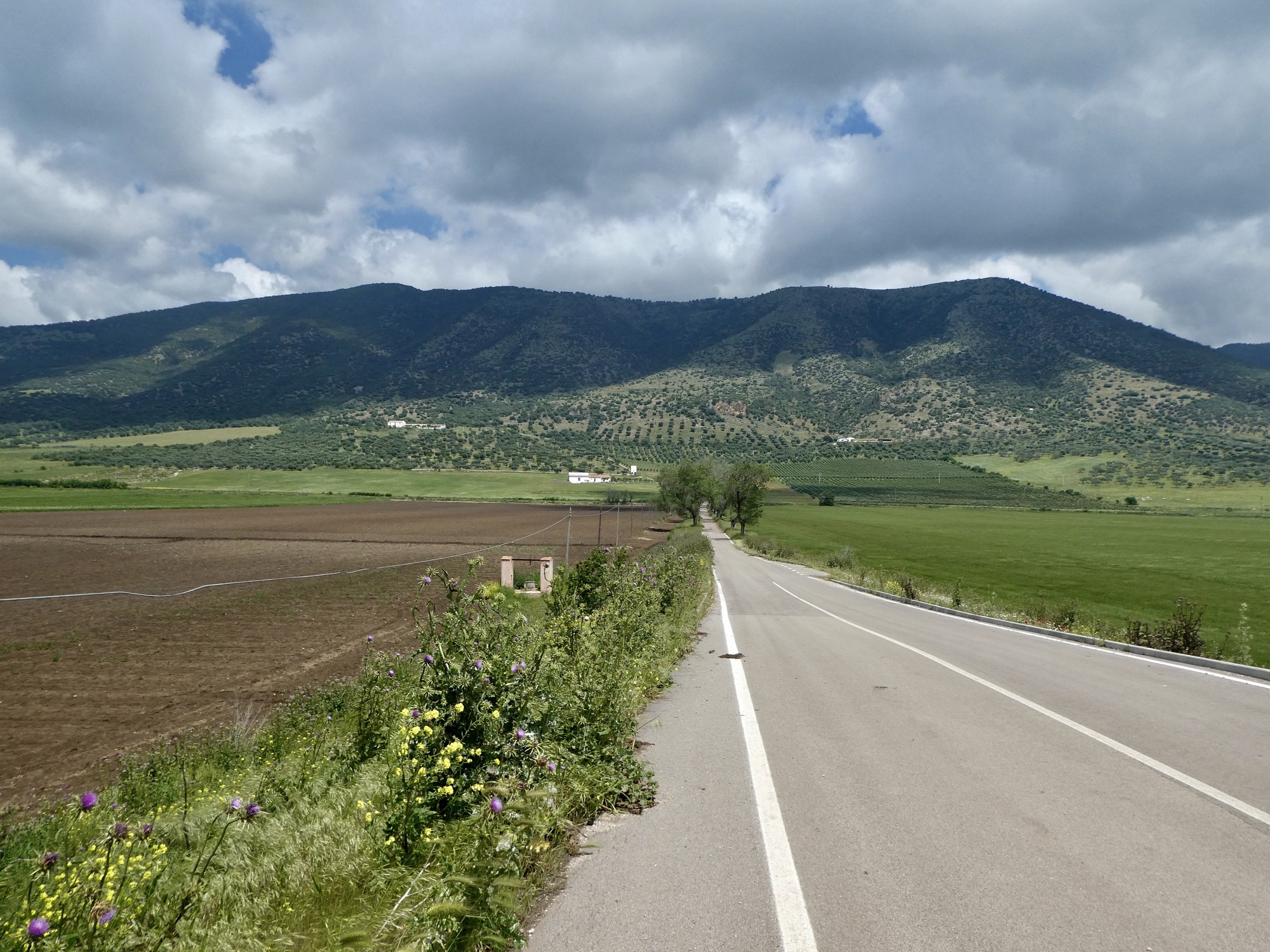 I’m right. It ends up being a stunning day, serving us up one sensory delight after another for the next twenty miles. The first fifteen are a steady but very gradual climb to the high point of the day ant about a thousand feet above the plain, with the mountains rising not far from us in the east.