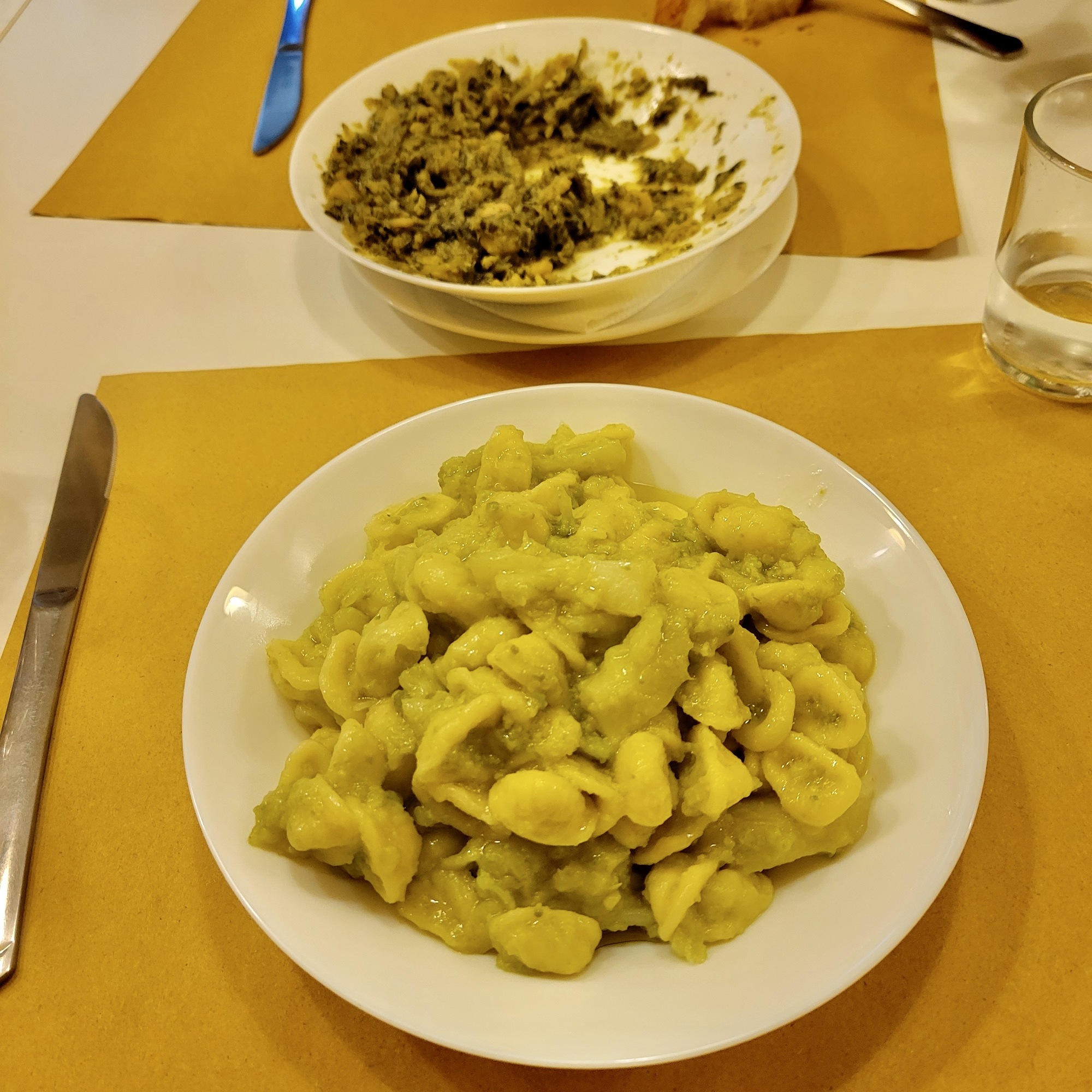 Not much happens of note for the rest of the afternoon, until we head out looking for a restaurant. San Severo is no tourist destination, and it takes awhile to find any open eatery other than takeout pizza. Finally we take a chance on a gloomy looking hole in the wall, Osteria a Casa Nostra (Osteria at our house). It’s just as it sounds - someone’s home, with a kitchen and a few tables on the ground floor. And it’s brilliant, a fine home cooked meal and an exceptional personal experience. There’s no menu - we’re told what’s on offer tonight and try to figure out the choices because neither half of the couple speaks a bit of English.