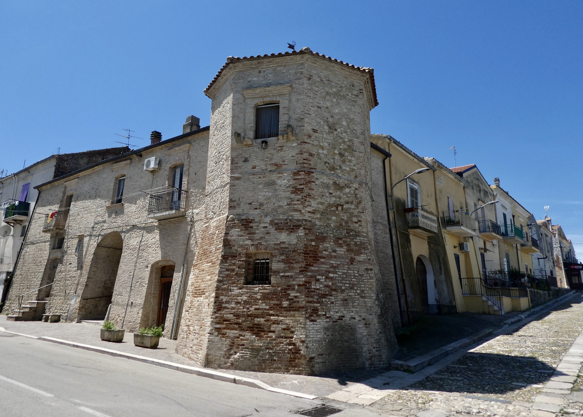 The descent toward the coast from Chieuti is fabulous as we pass by one stunning scene after another. There’d be more photos here but I couldn’t spare the time to stop often. We have a fixed arrival time at our apartment in Termoli, when the father of the owner is scheduled to meet with us at precisely three. After staying around longer than expected in Chieuti we’re at risk of being late, so we mostly ride straight through. Fortunately it’s generally downhill, the winds are minimal, and save for an irksome rocky quarter mile just outside of town the roads are paved and reasonably surfaced.