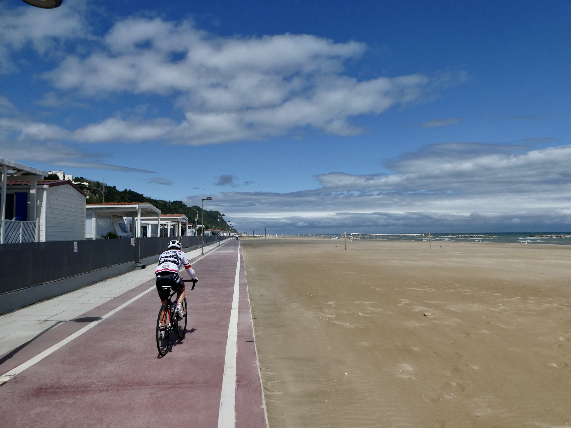 The eight mile run down to Fano was just as expected - a flat, easy ride that takes nothing out of me as I’m blown southeast the whole way. It’s a nice ride on a good bike path that takes me right next to the coast through a string of resorts part of the way and for the rest I’m just inland sandwiched between the rail line and SS16.