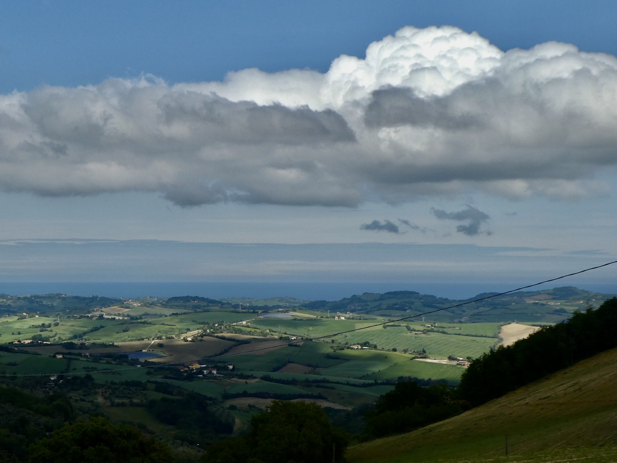 Finally I top out and begin the long drop back to Pesaro. Views are still striking, especially toward the sea now that am above the hills. The sky is looking progressively more ominous though, and as I race downhill and into the wind I hear the rumble of thunder behind me and feel a few sprinkles. The sky is clearer ahead than behind, and I’m racing the front all the way back pleading to my lucky stars that this not be the day I get a flat or mechanical. I’m heard apparently and stay a step ahead of the storm all the way down, arriving dry around 4:30. Fifteen minutes later we start hearing thunder again and then see flashes of lightning out our window, and then the roof falls in. If I’d been fifteen minutes later I’d have been a goner.