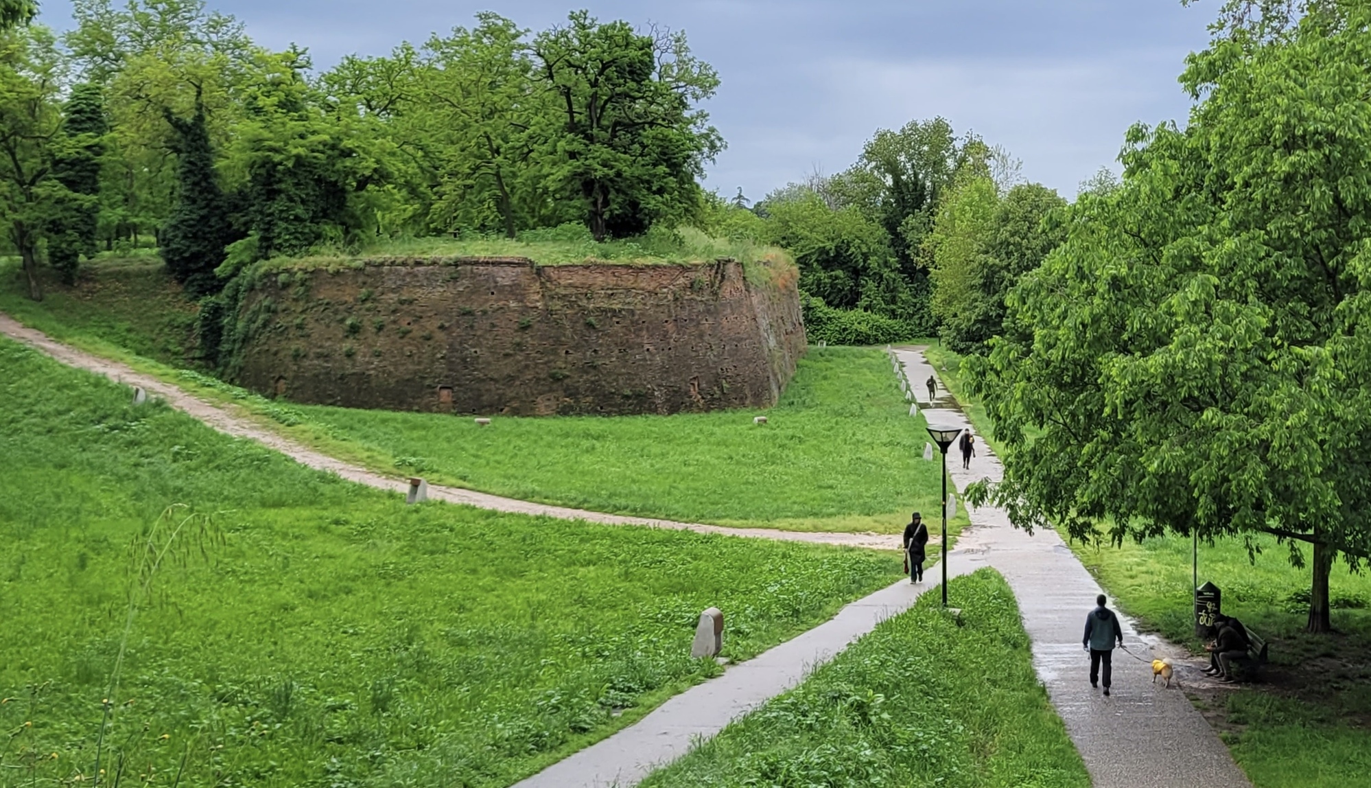 I am continuing to have breathing issues with my nasal surgery which is exacerbated by wind and humidity which we’ve been having a lot of lately. In addition, I’ve been having issues with too much time in the saddle. But most importantly, hiking gives me a chance to see things in a different way. Below are photos from my wonderful walk along the upper and lower walls around Ferarra. Even though the trail was wet in some places and they was a little rain it was amazing!
