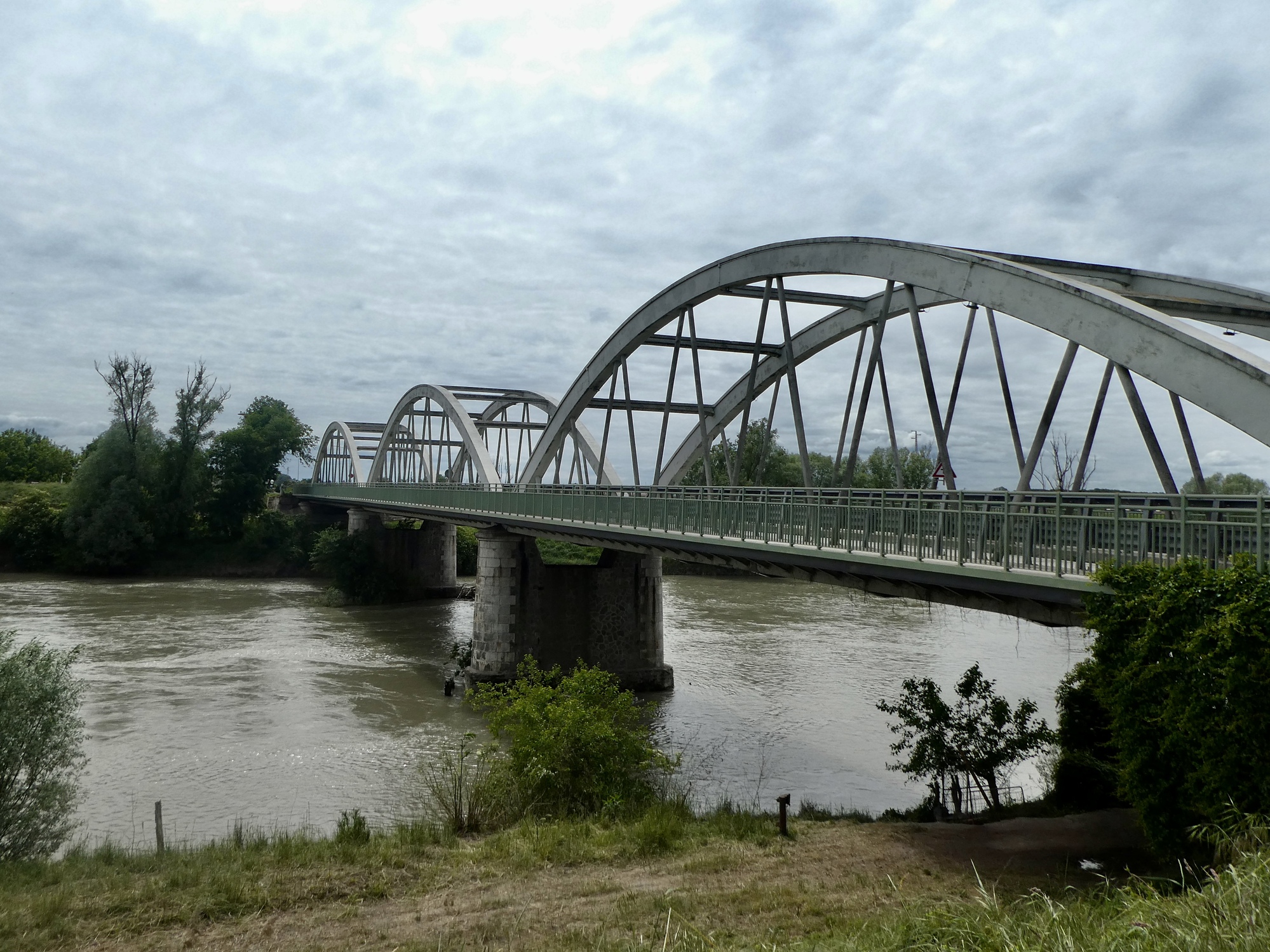 We cross the Po on the bridge at Santa Maria Maddalena. It’s a poor experience because it’s a busy road, it’s an old, narrow two lane truss bridge, and we have to push the bikes across on the too narrow sidewalk. But we’re at least mentally prepared for it because we crossed it four years ago biking into Ferrara.