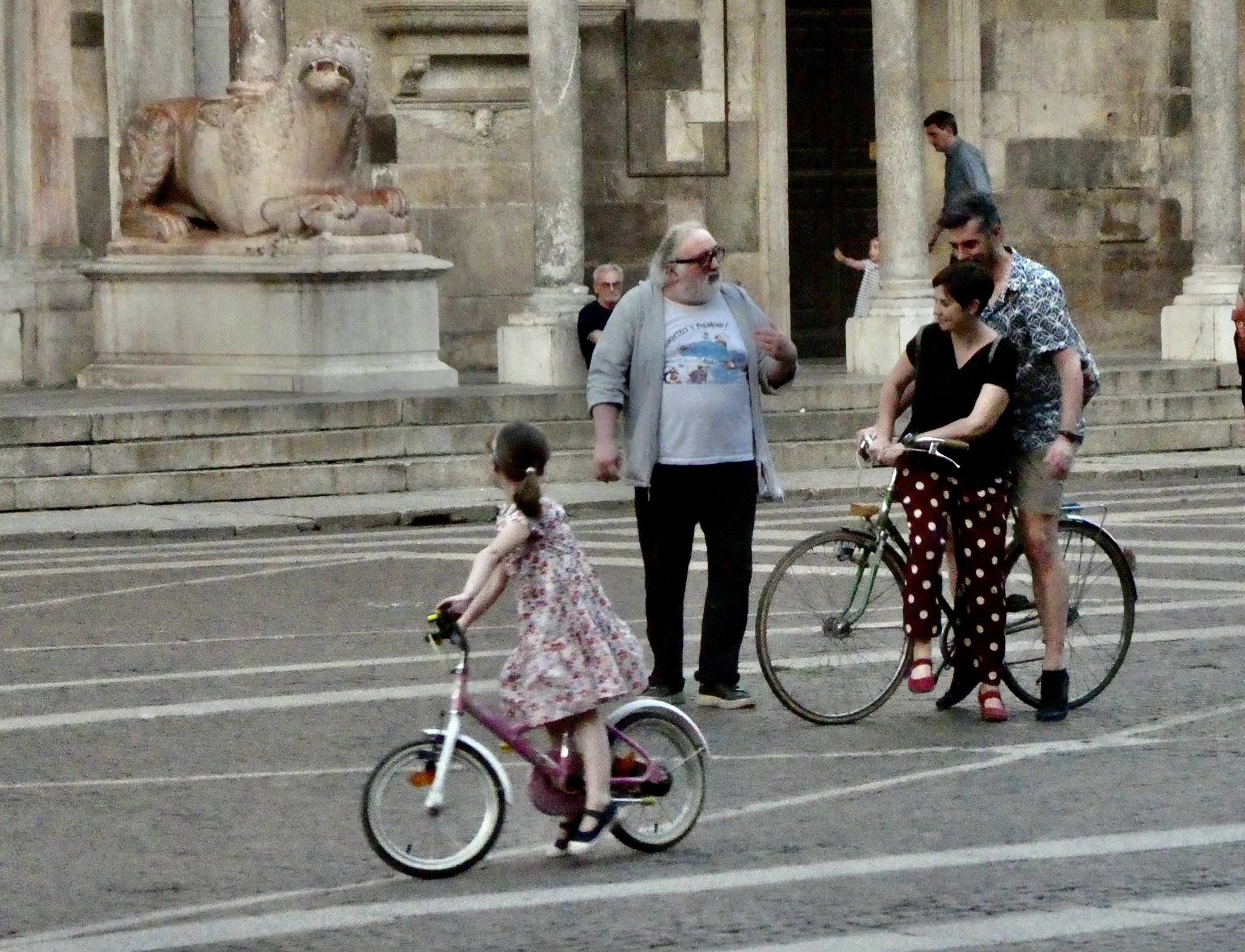 Afterwards we start back to the room and I surprise Rachael by stopping in at the gelateria on the corner of the square and order a cone with nocciola and pistacchio, and we go back and sit on the steps in front of the cathedral to enjoy another act of the show.