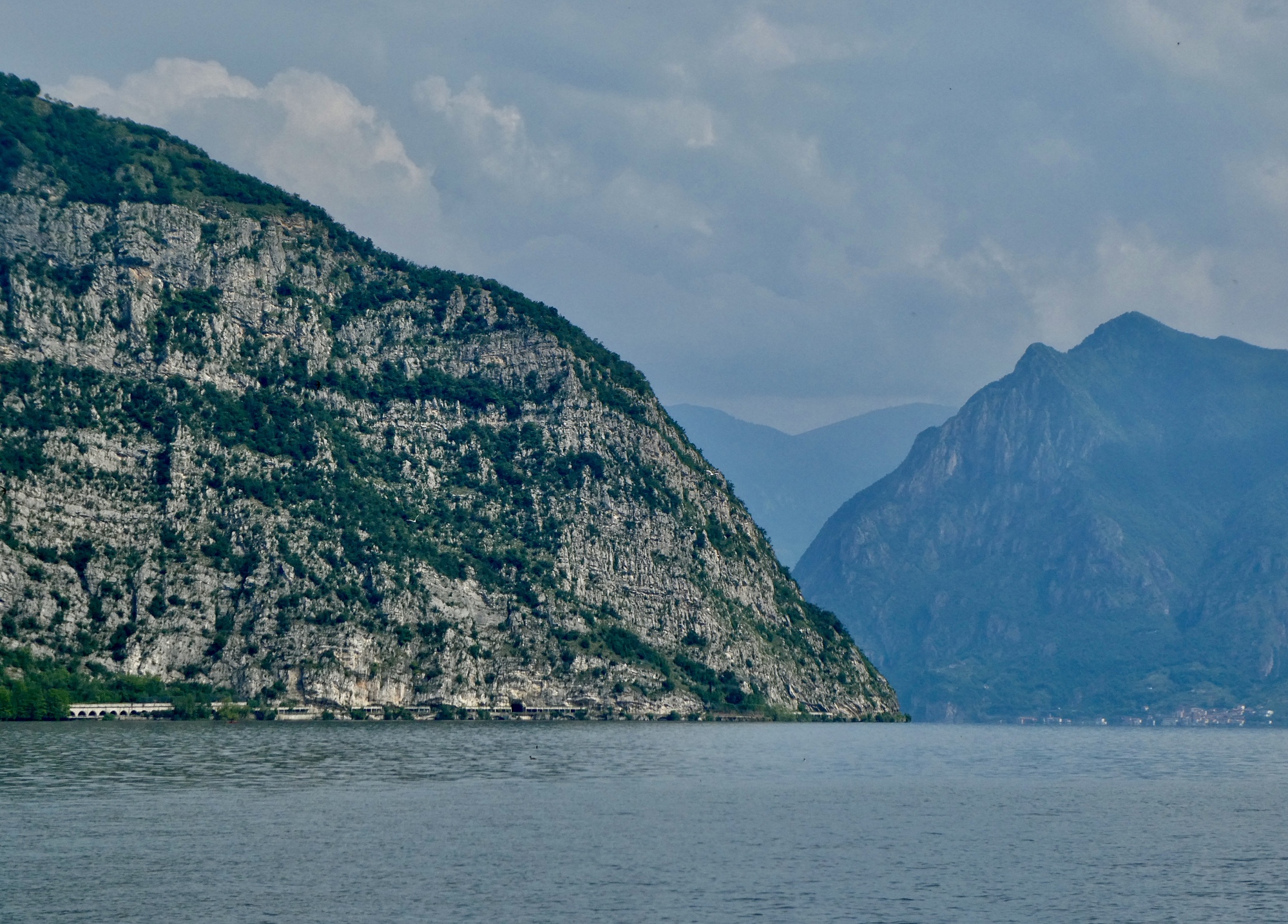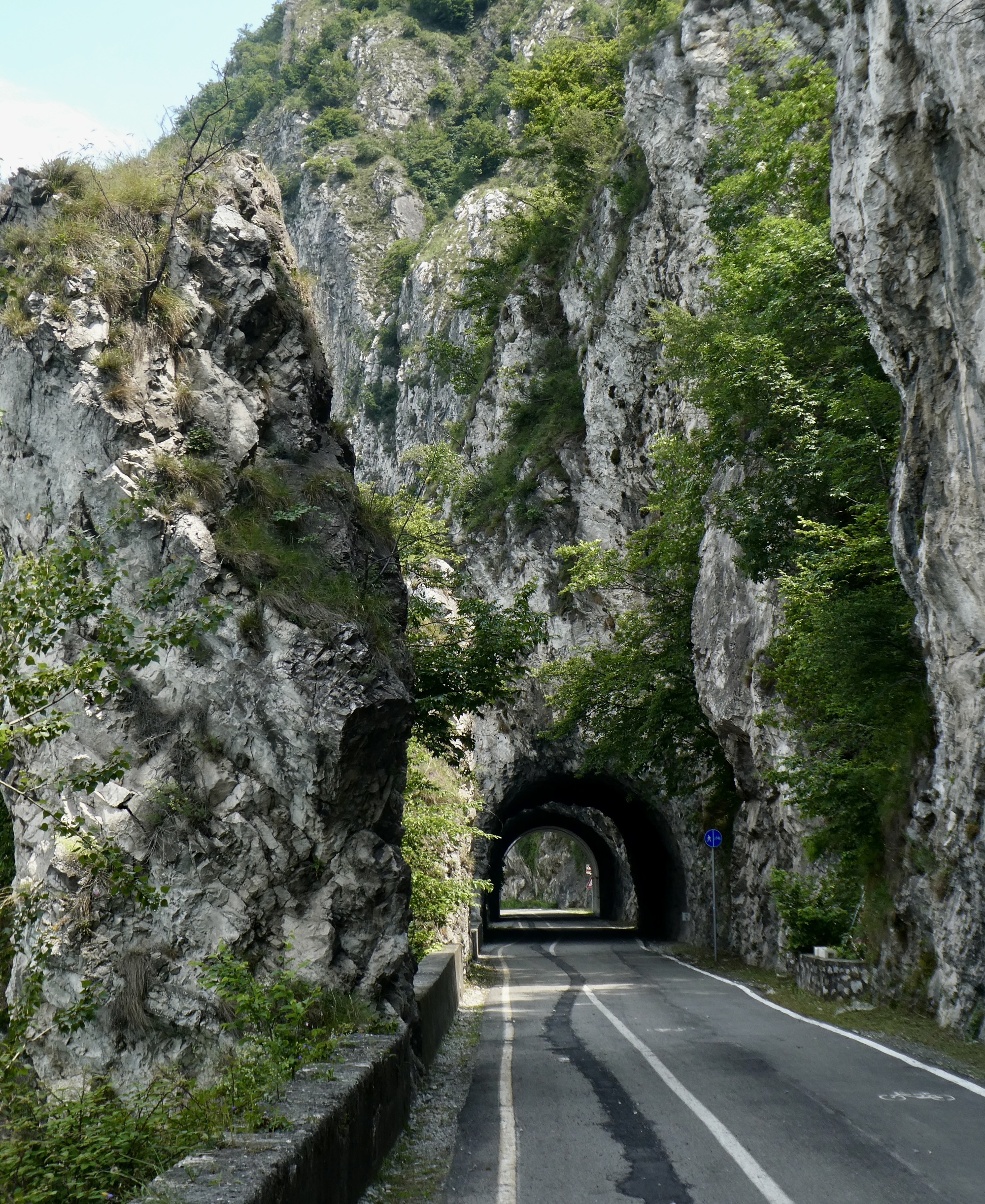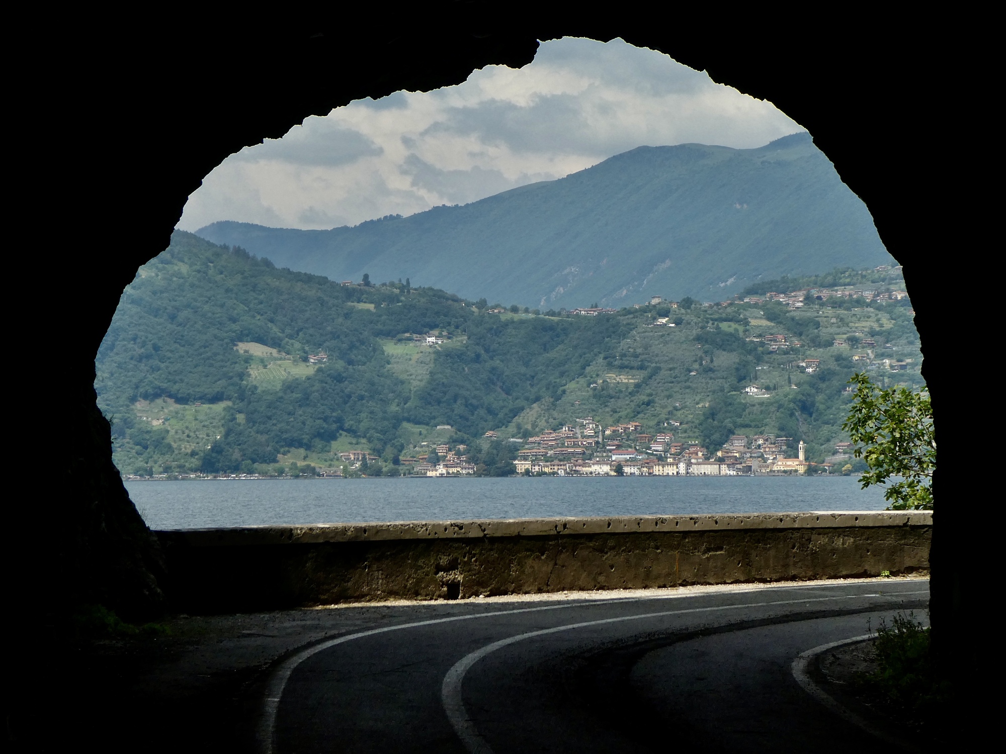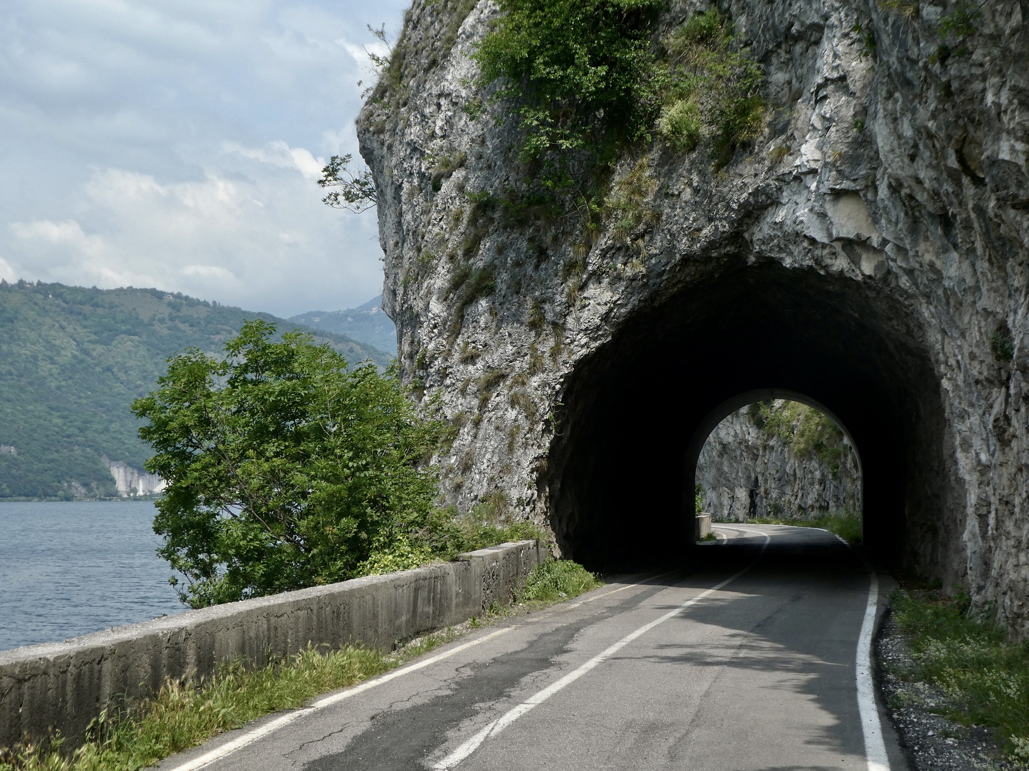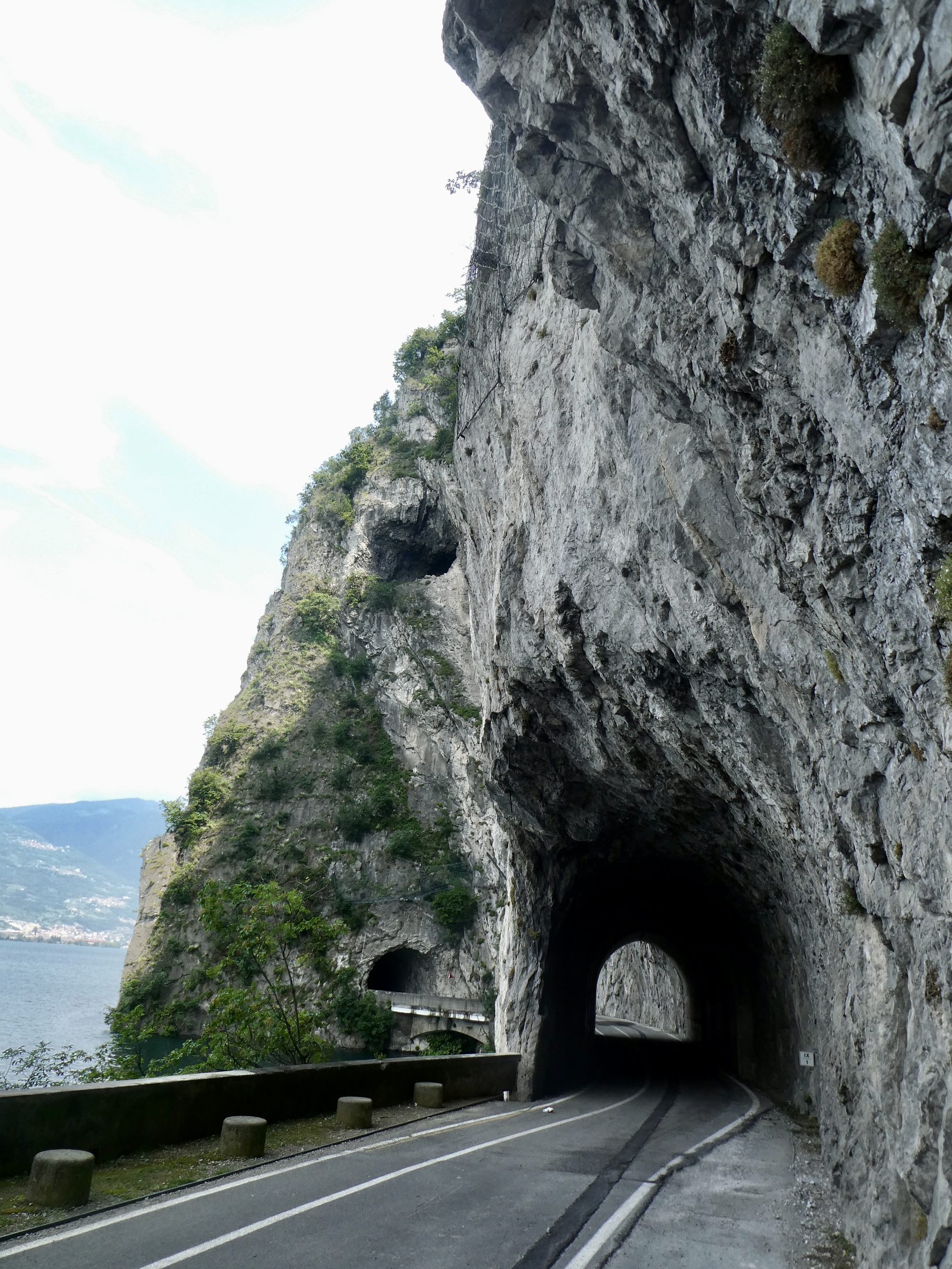 Beneath the cliffs. I lost count, but there must be eight or ten tunnels, all short. Here we’re looking through one to Riva di Solto on the opposite side of the lake.